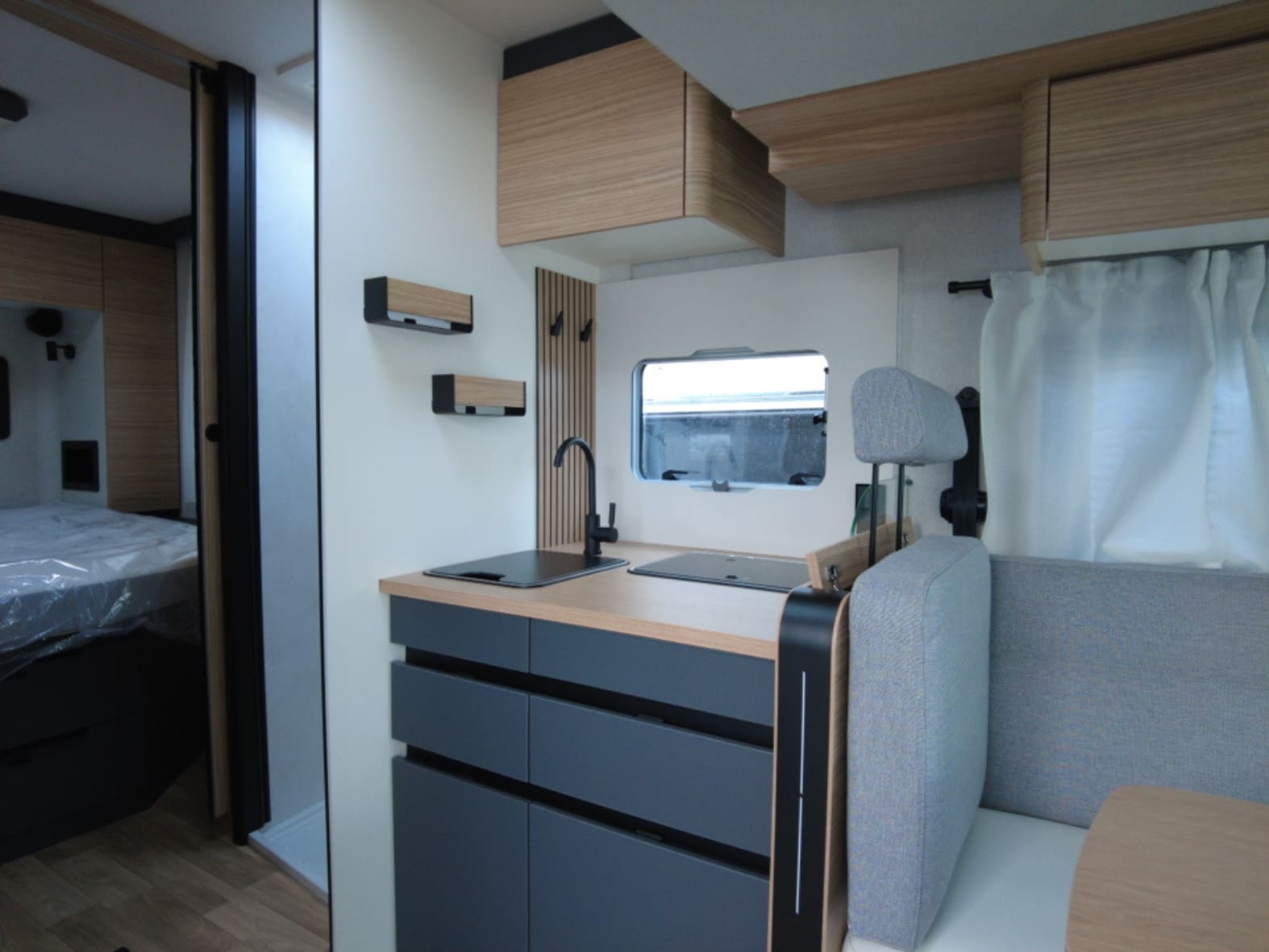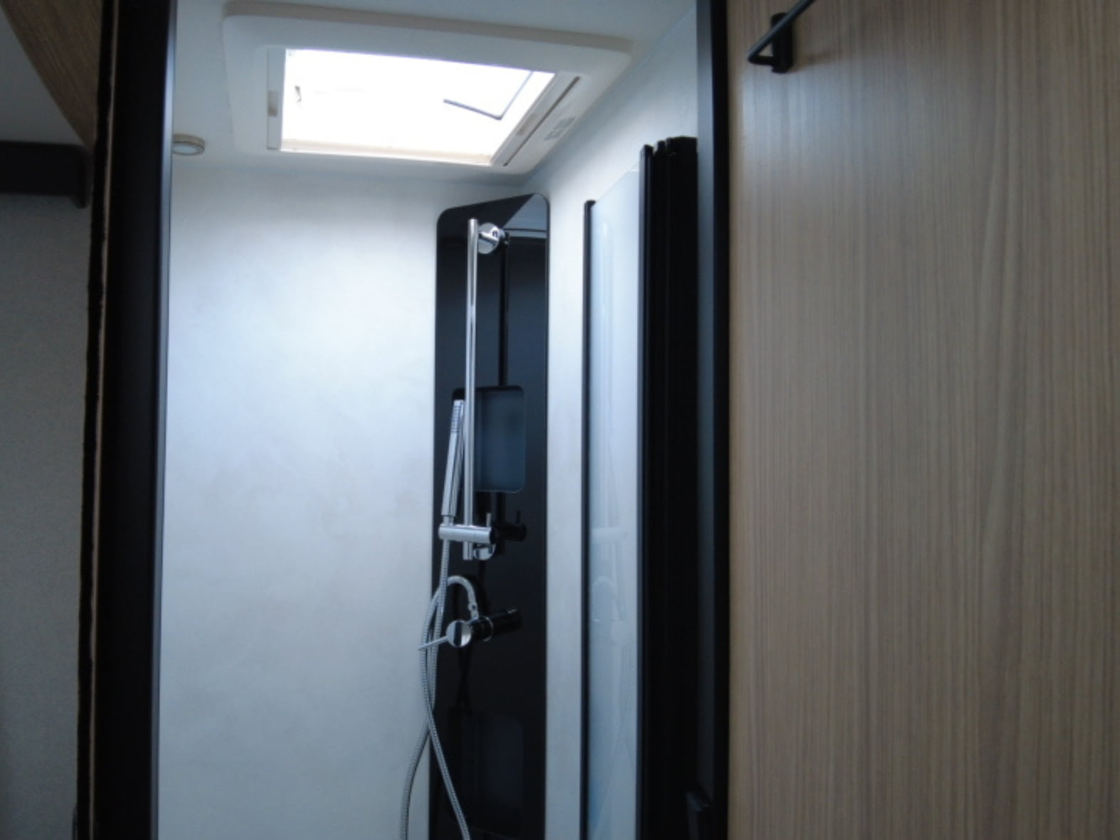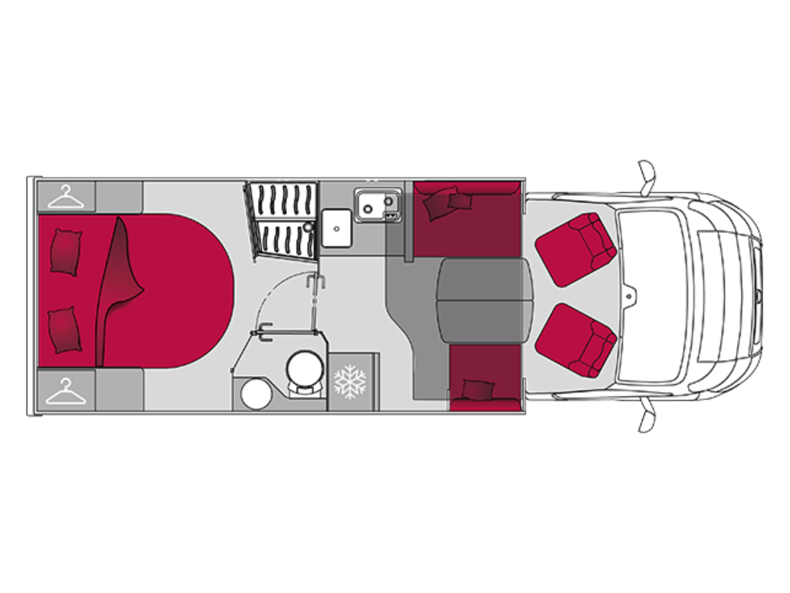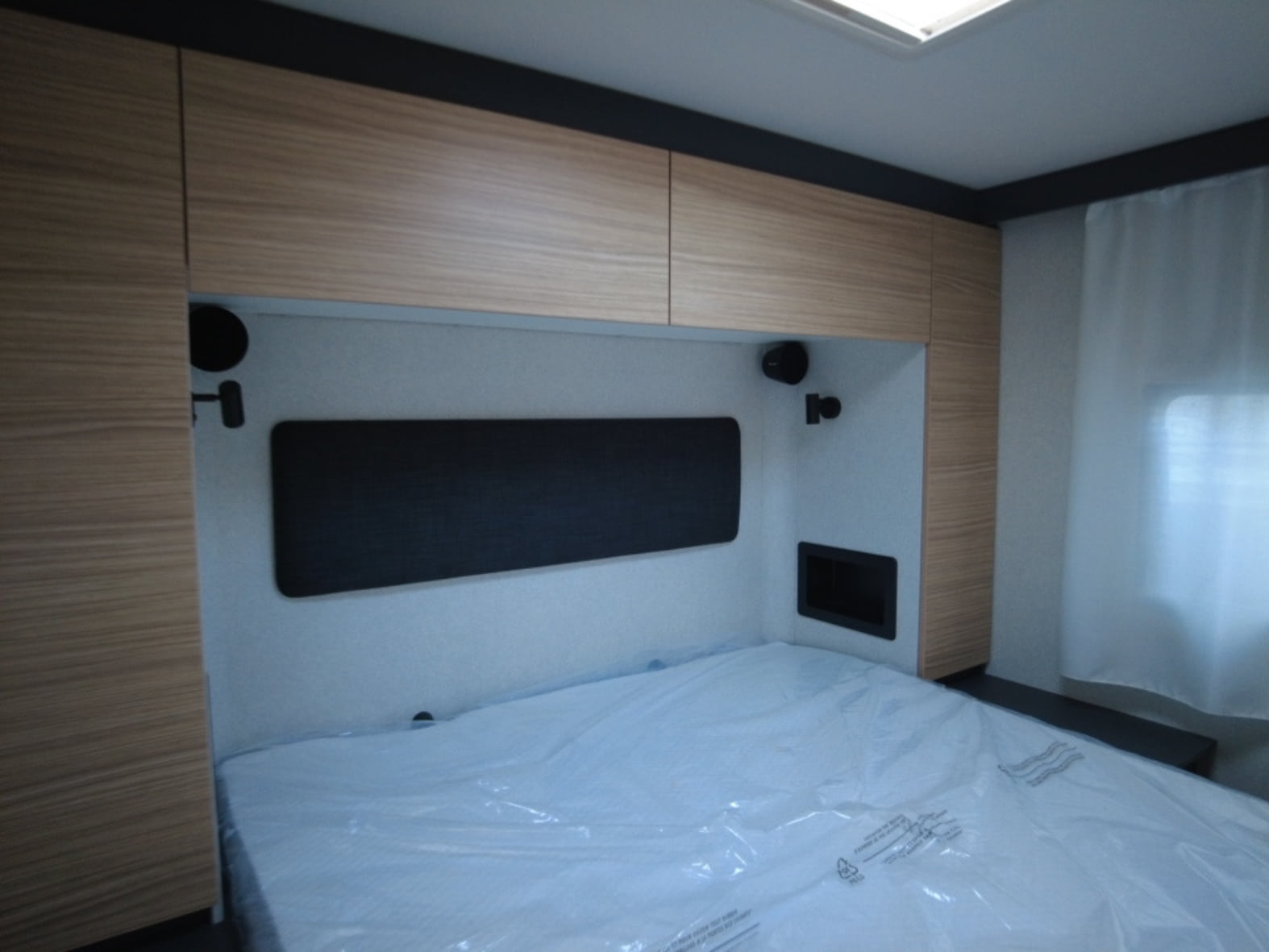 En la parte trasera encontramos una cama central amplia y confortable, pensada para un descanso de primer nivel, acompañada de armarios de fácil acceso que facilitan la organización sin renunciar al espacio. Junto a ella se sitúa el baño tipo suite, con una separación inteligente: ducha independiente con mampara a un lado del pasillo y, al otro, lavabo y WC químico con depósito extraíble y ruedas, garantizando privacidad, comodidad y practicidad en el uso diario.