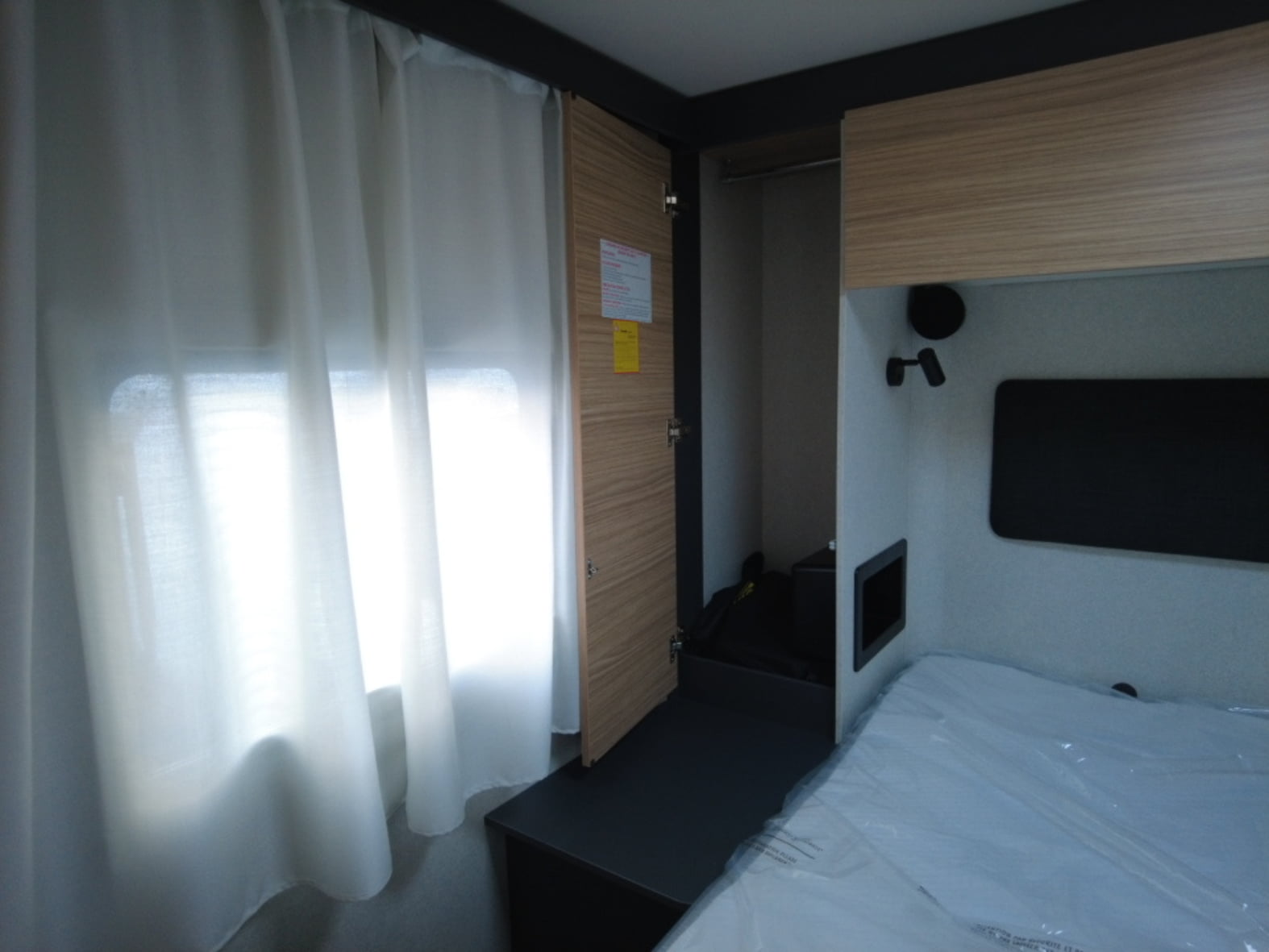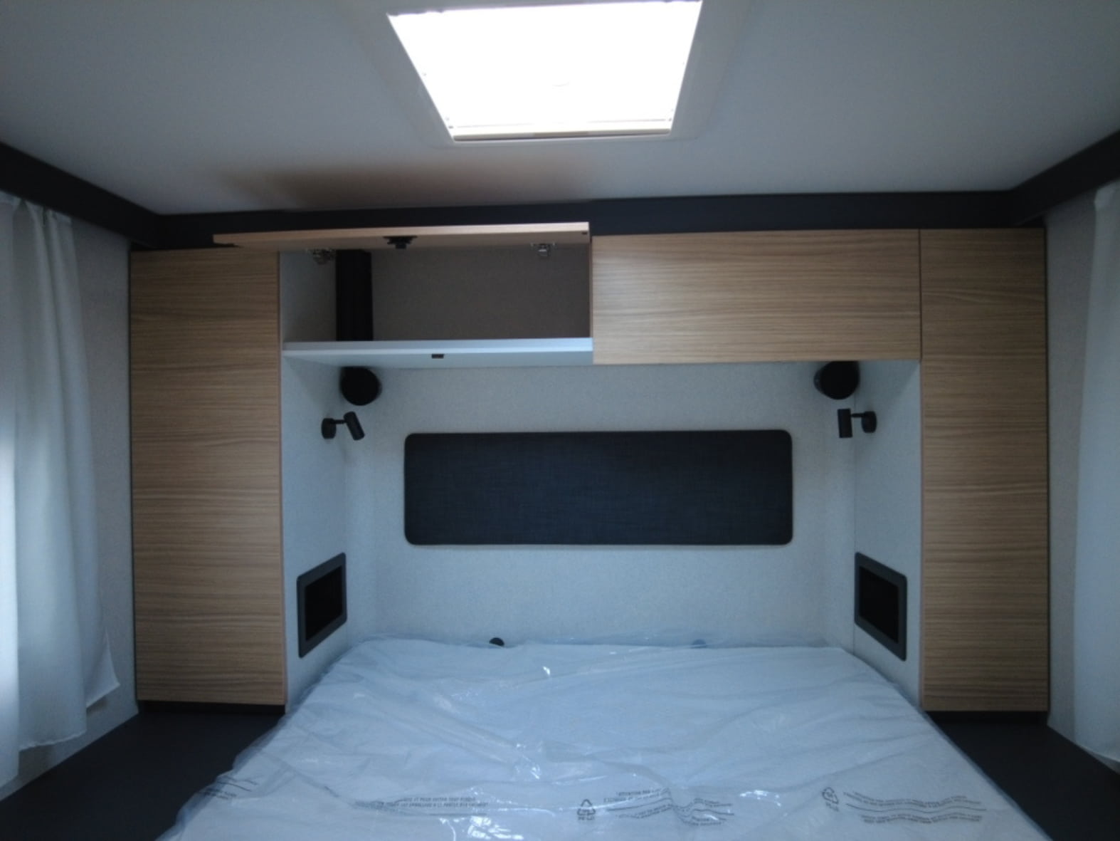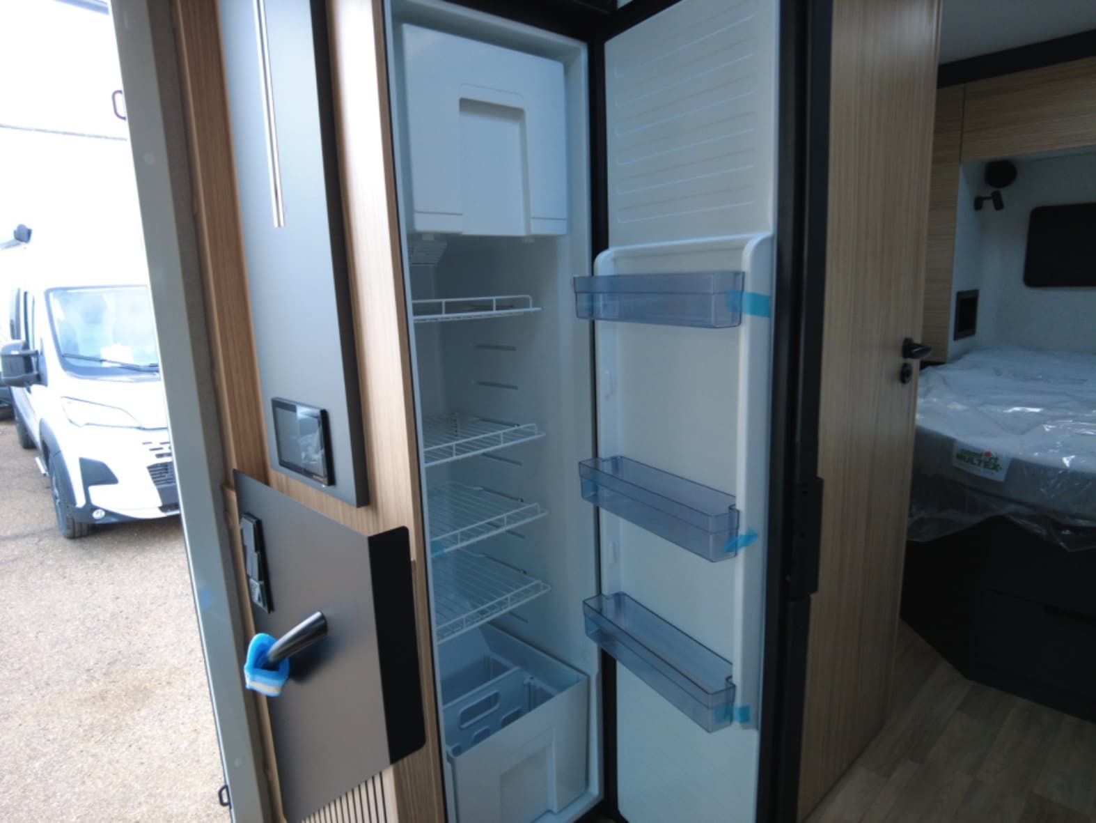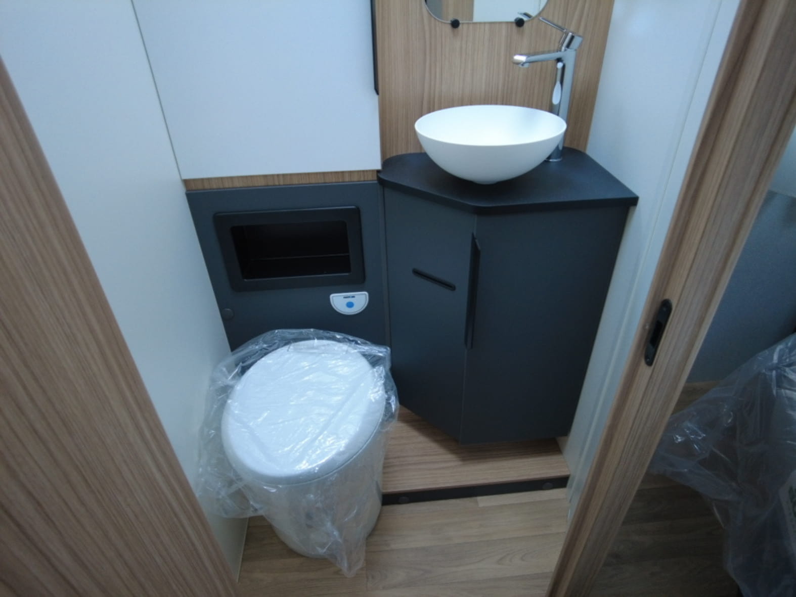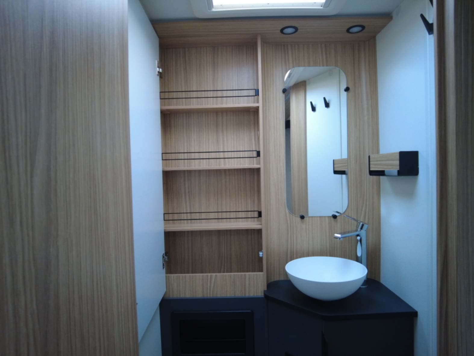 En la parte trasera encontramos una cama central amplia y confortable, pensada para un descanso de primer nivel, acompañada de armarios de fácil acceso que facilitan la organización sin renunciar al espacio. Junto a ella se sitúa el baño tipo suite, con una separación inteligente: ducha independiente con mampara a un lado del pasillo y, al otro, lavabo y WC químico con depósito extraíble y ruedas, garantizando privacidad, comodidad y practicidad en el uso diario.