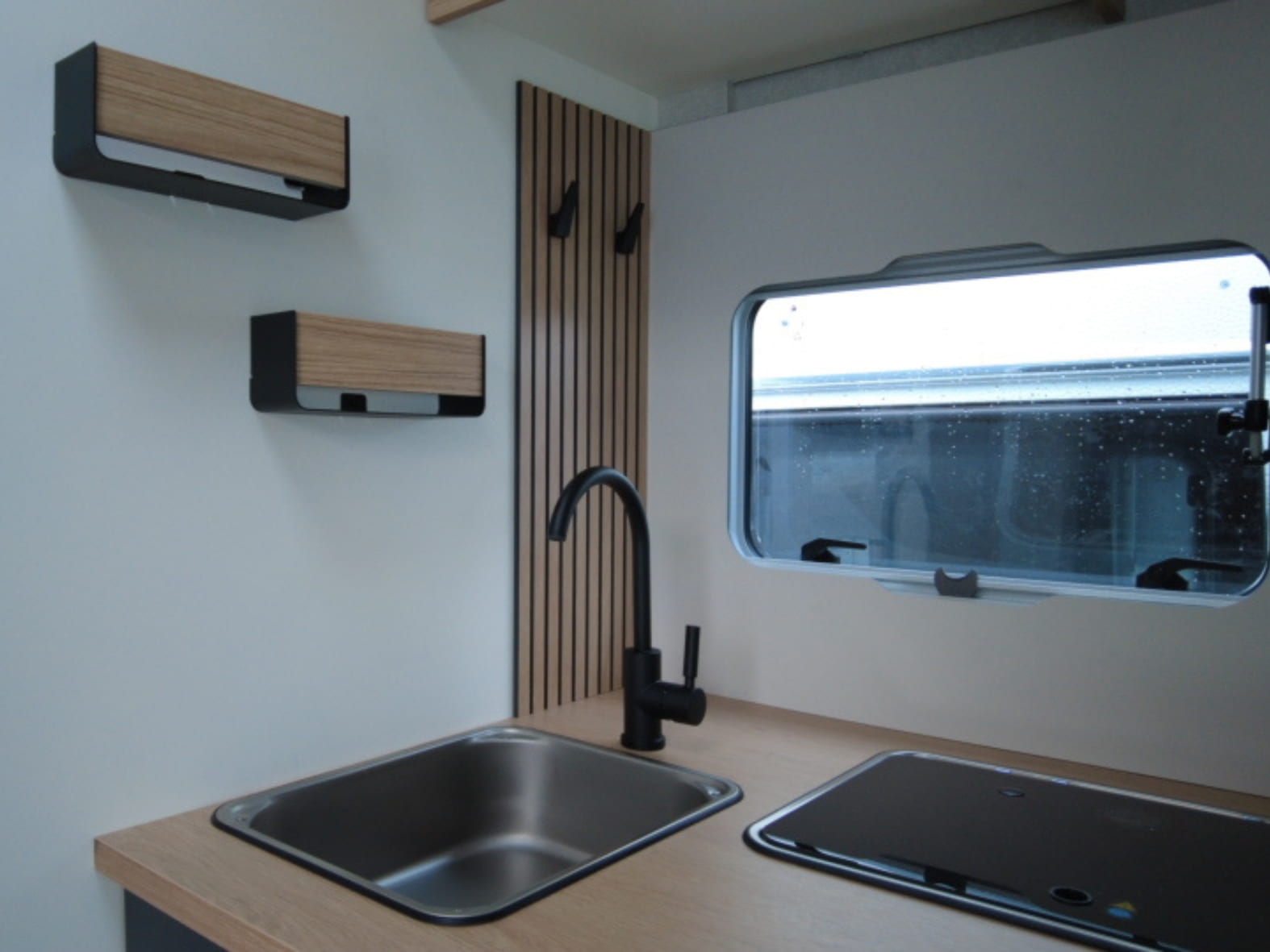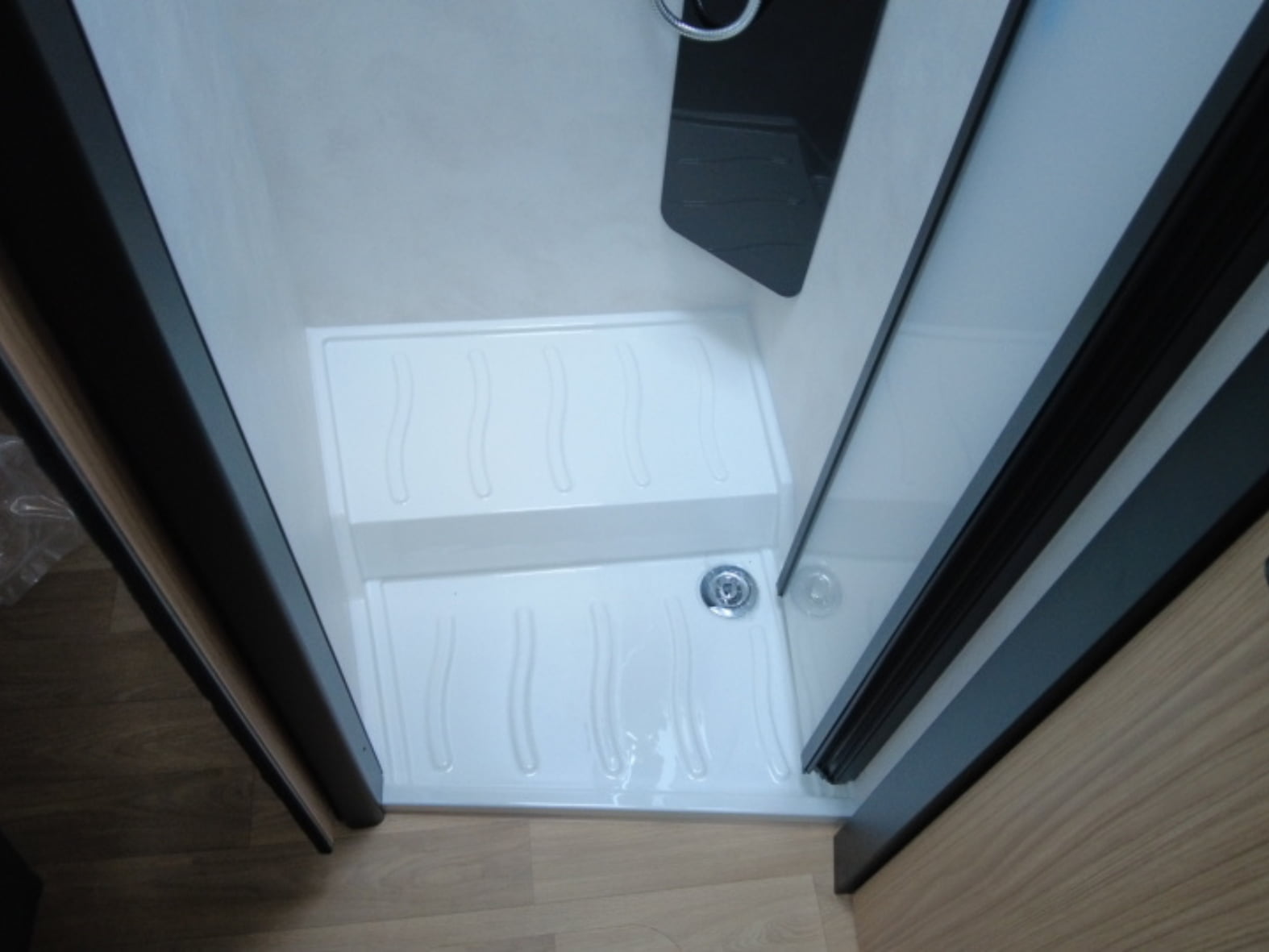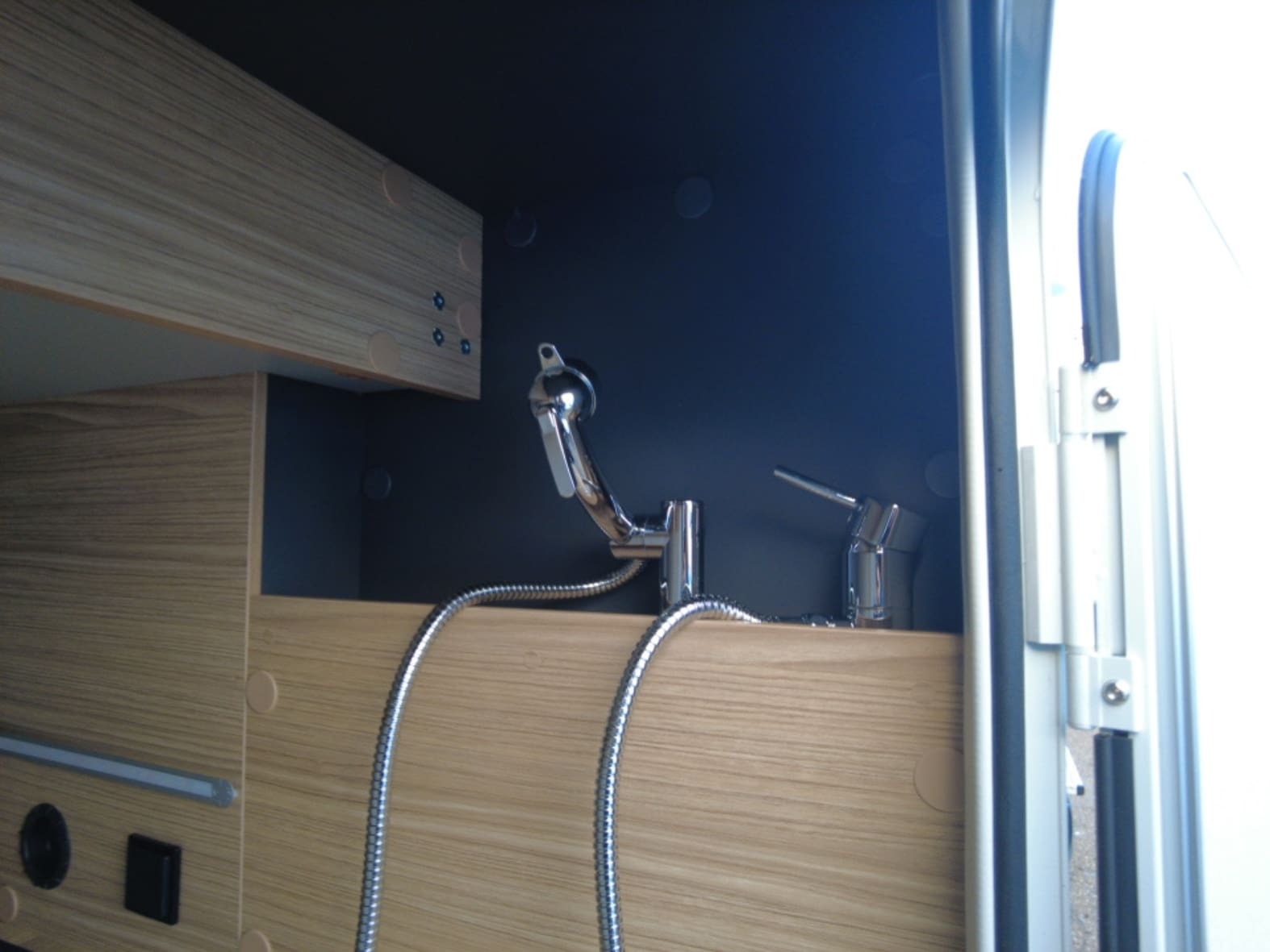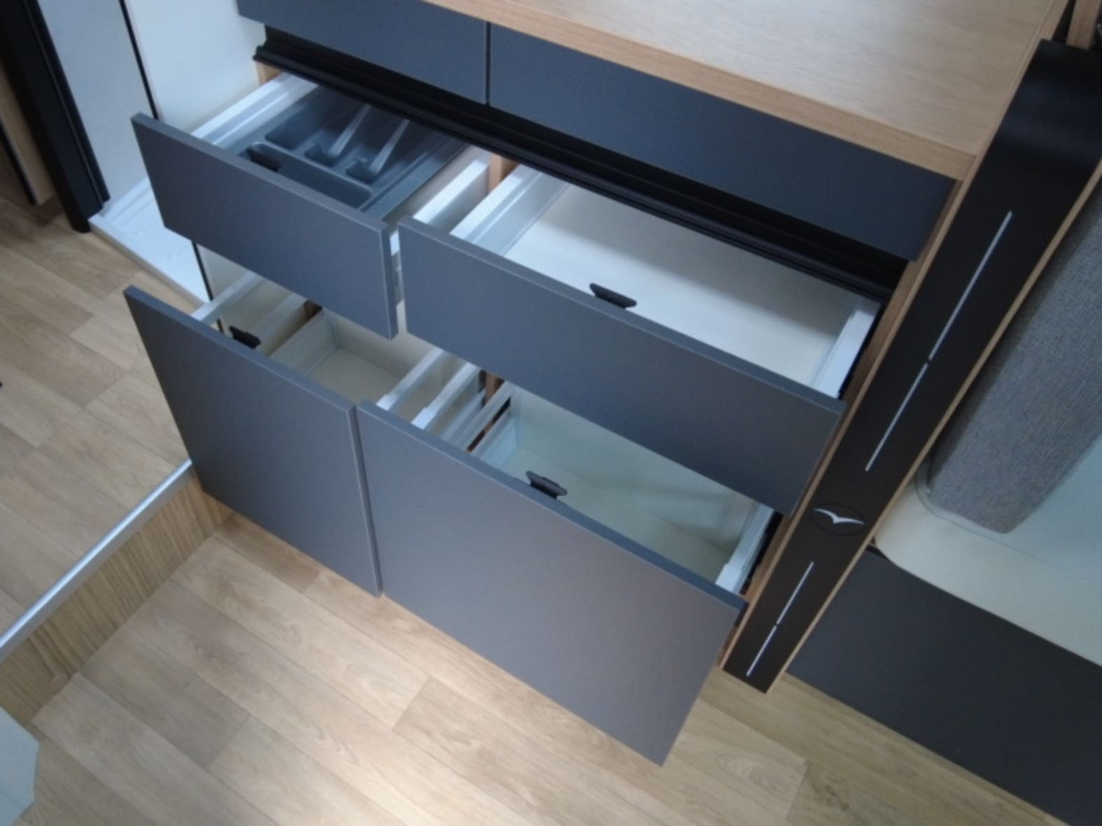 En la parte trasera encontramos una cama central amplia y confortable, pensada para un descanso de primer nivel, acompañada de armarios de fácil acceso que facilitan la organización sin renunciar al espacio. Junto a ella se sitúa el baño tipo suite, con una separación inteligente: ducha independiente con mampara a un lado del pasillo y, al otro, lavabo y WC químico con depósito extraíble y ruedas, garantizando privacidad, comodidad y practicidad en el uso diario.