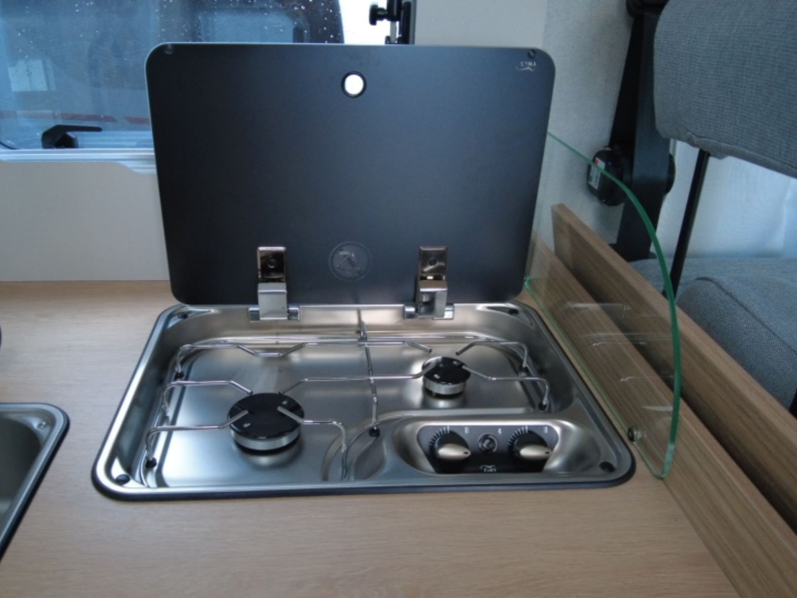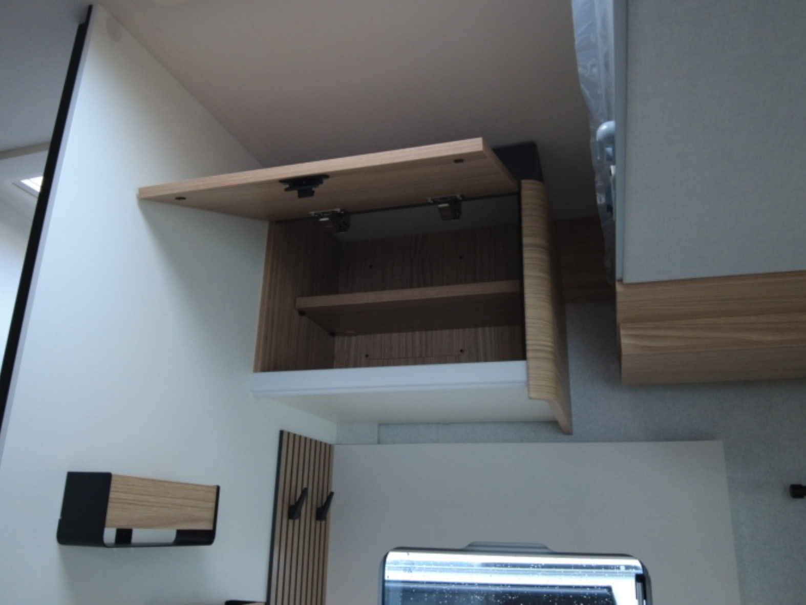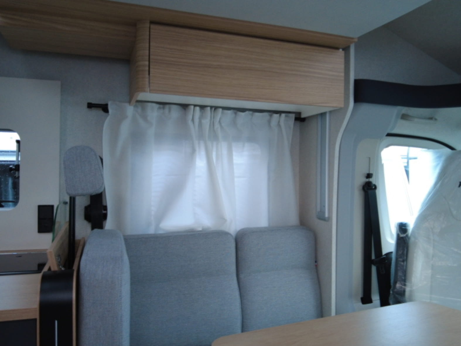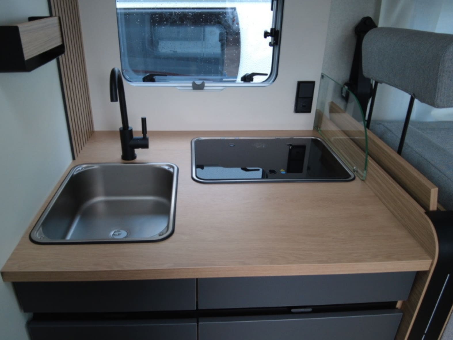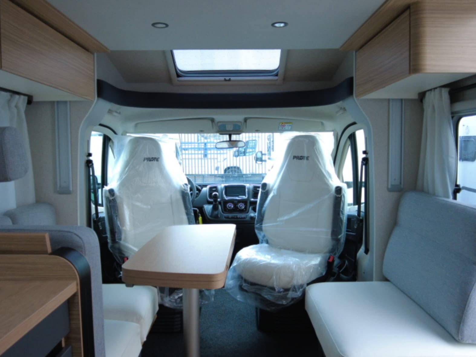 Avanzando hacia la zona central, el protagonismo lo toma un salón face to face moderno y acogedor, capaz de reunir cómodamente hasta cinco personas alrededor de una mesa central plegable y deslizante. La luminosidad es sobresaliente gracias al Skydome frontal y a la cama basculante eléctrica integrada sobre el comedor, que aporta dos plazas adicionales sin comprometer el espacio durante el día. Una solución versátil, eficiente y muy bien resuelta.