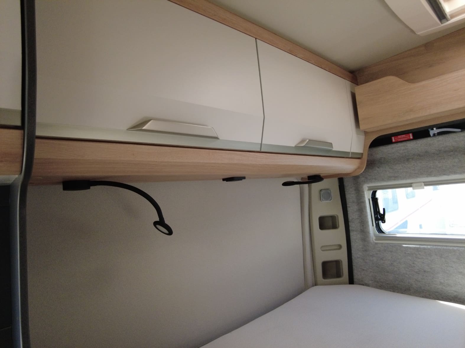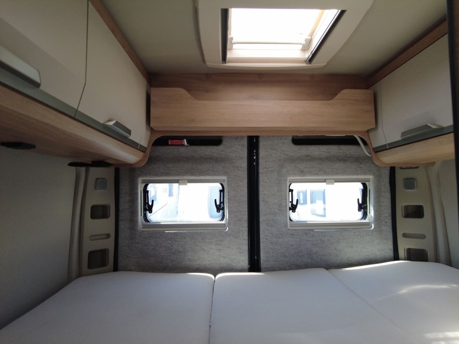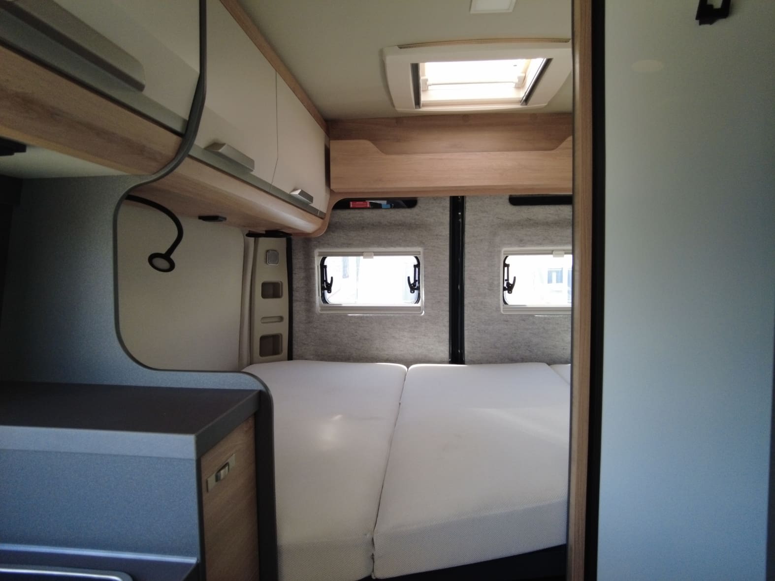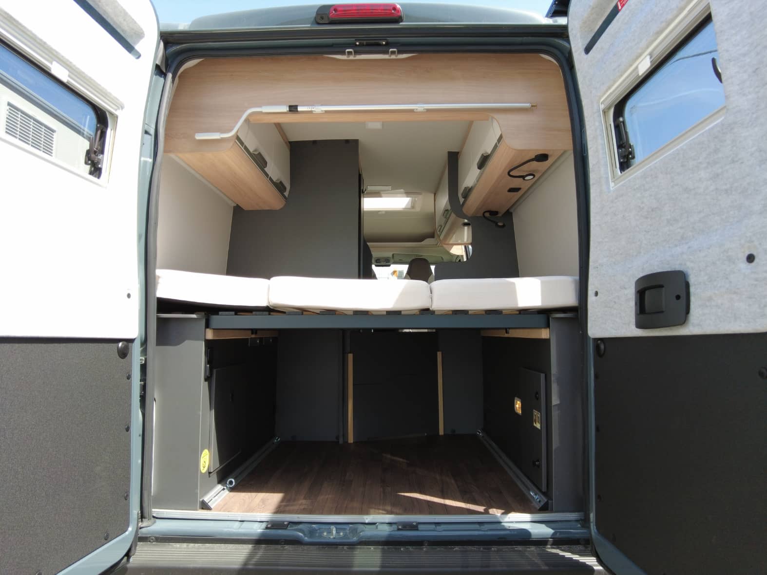 La parte trasera alberga el dormitorio, con una cama doble transversal que ofrece un descanso confortable tras cada jornada de viaje. Los armarios superiores y el espacio de carga inferior garantizan suficiente capacidad para equipaje, bicicletas u otros enseres, adaptándose a distintos estilos de viaje.