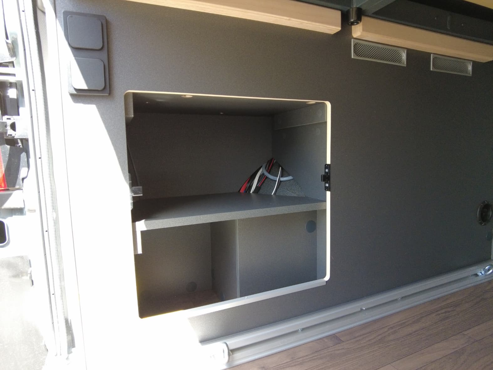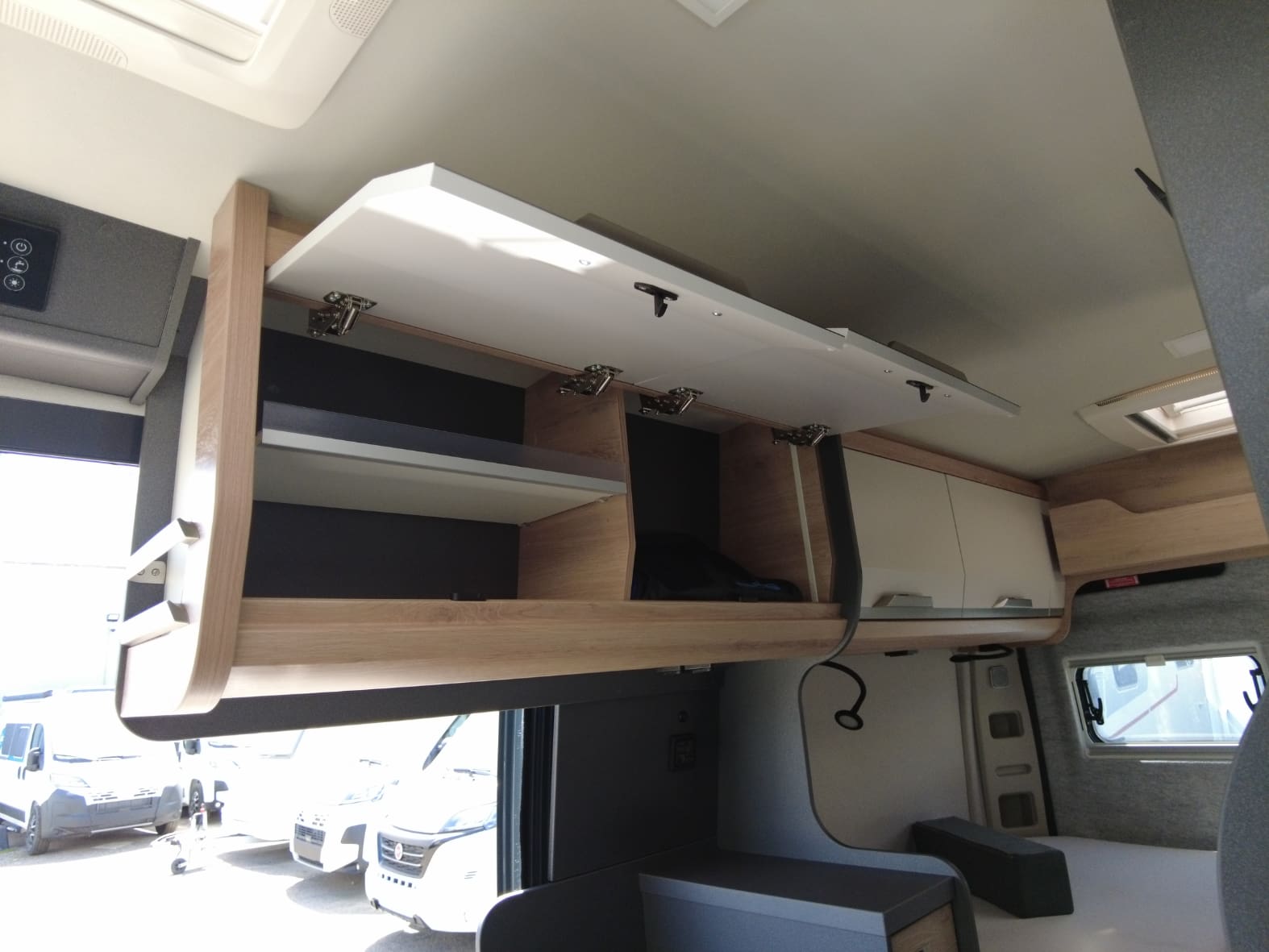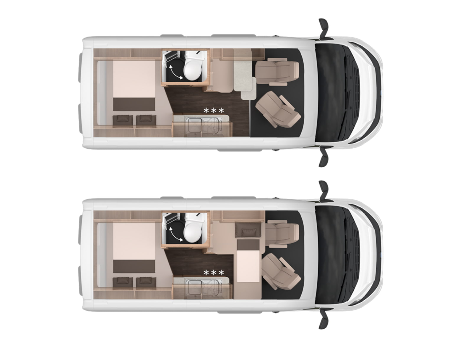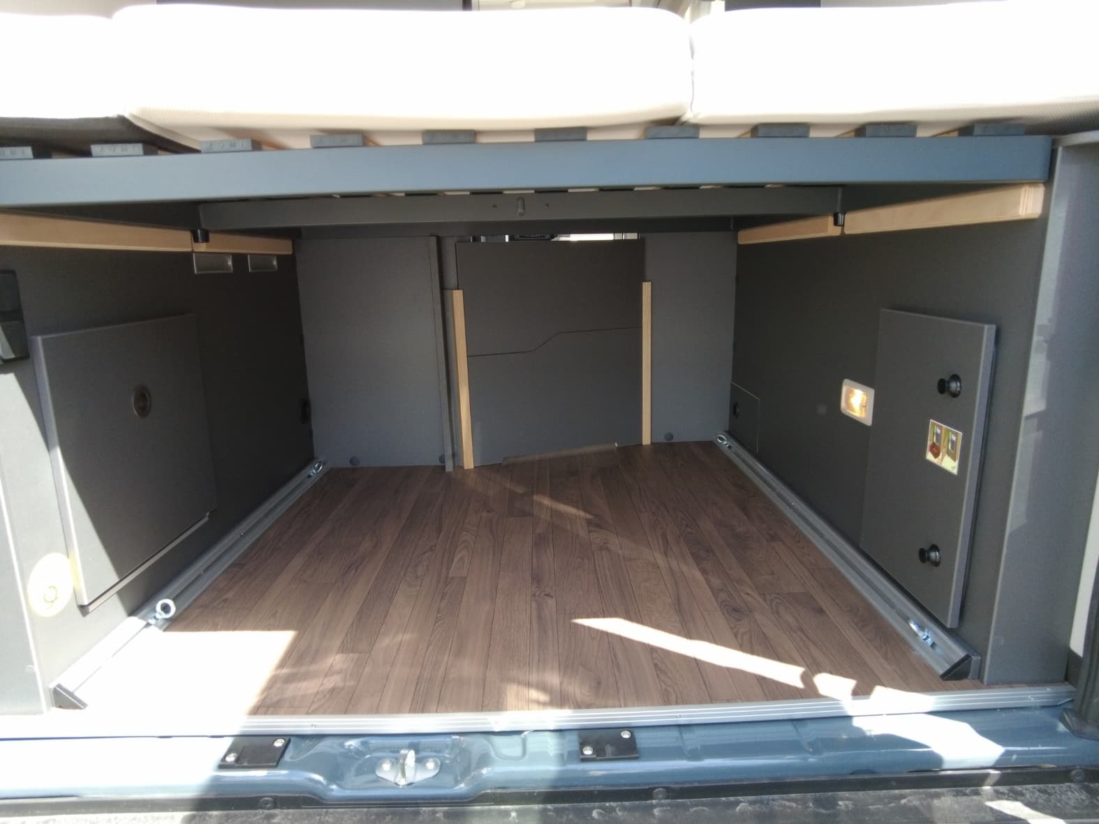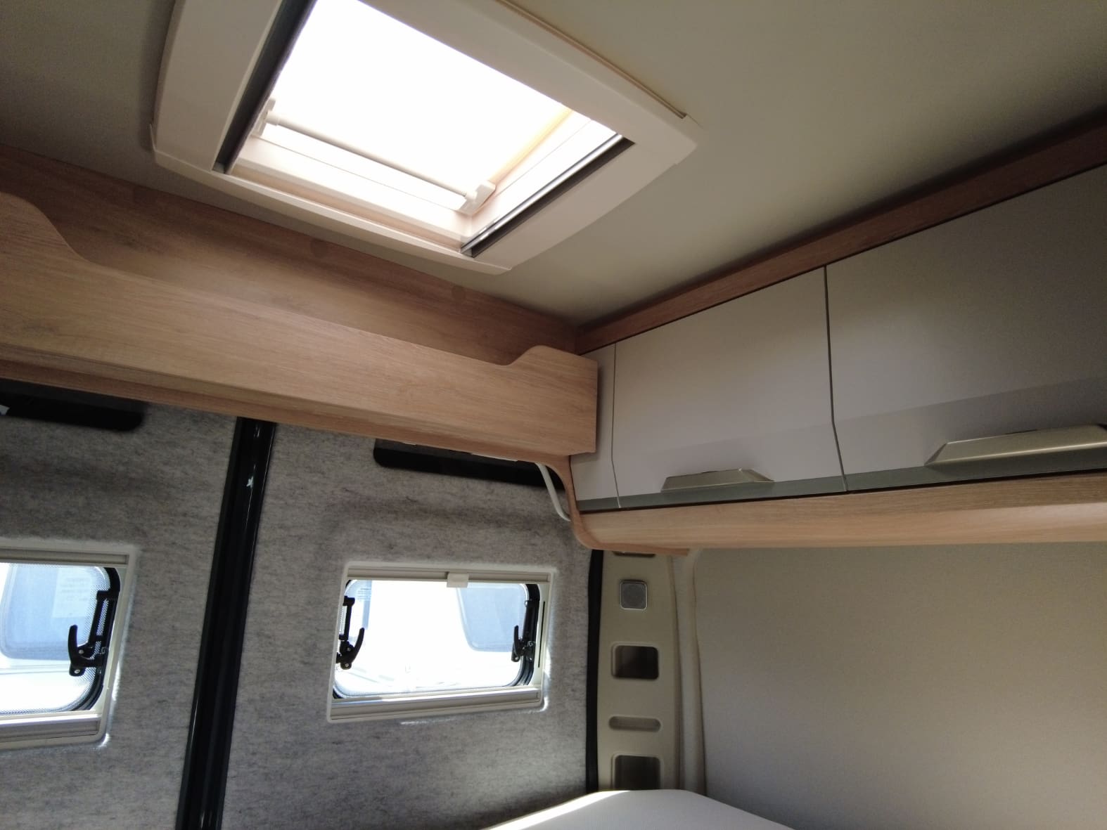 La parte trasera alberga el dormitorio, con una cama doble transversal que ofrece un descanso confortable tras cada jornada de viaje. Los armarios superiores y el espacio de carga inferior garantizan suficiente capacidad para equipaje, bicicletas u otros enseres, adaptándose a distintos estilos de viaje.