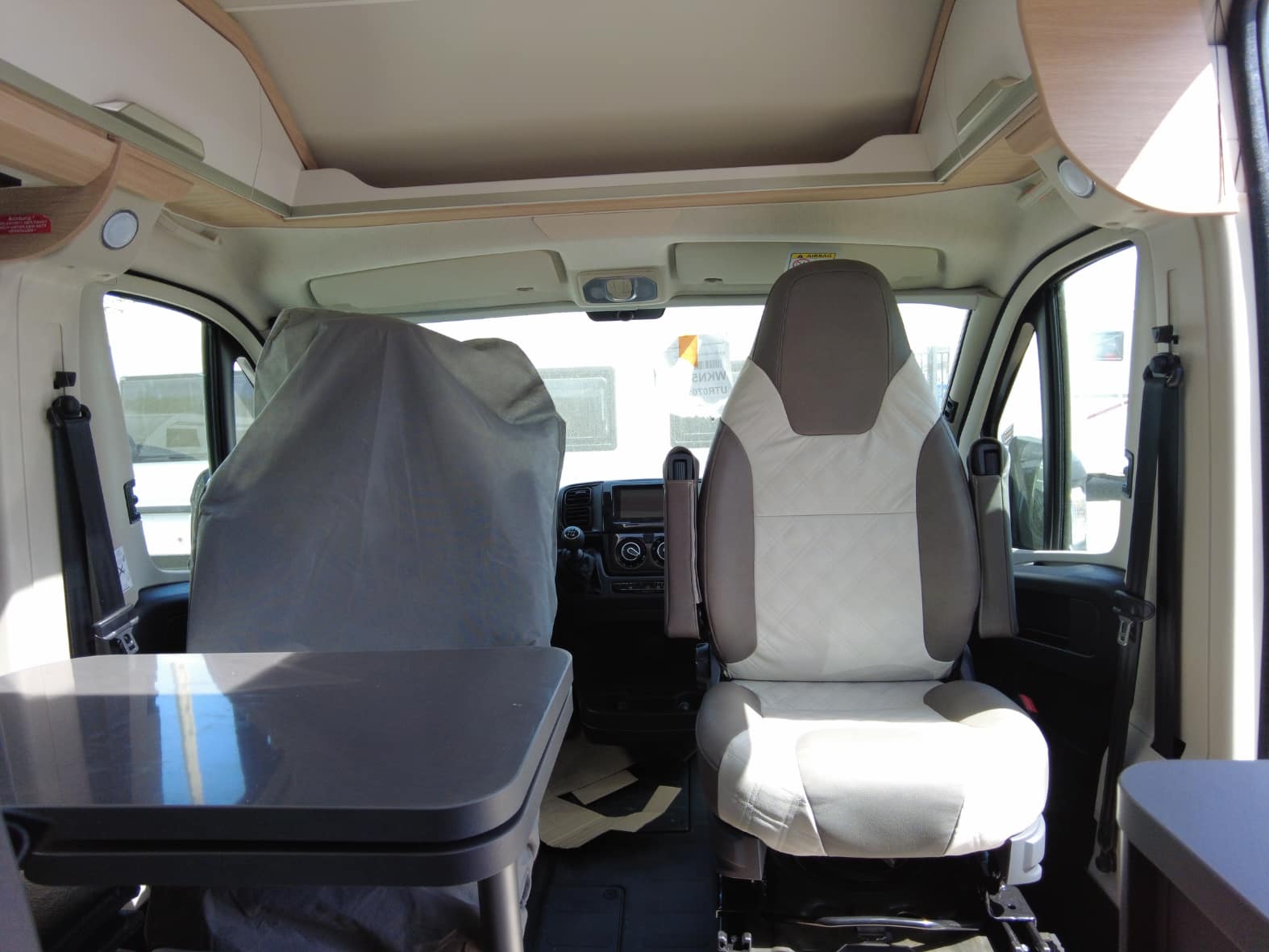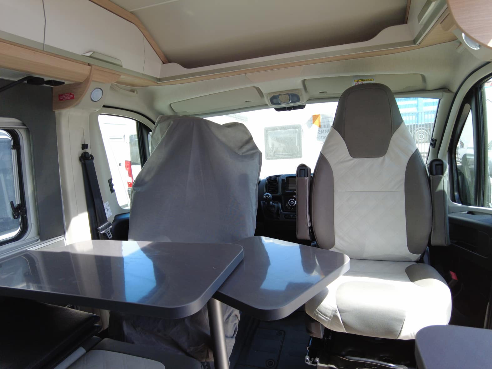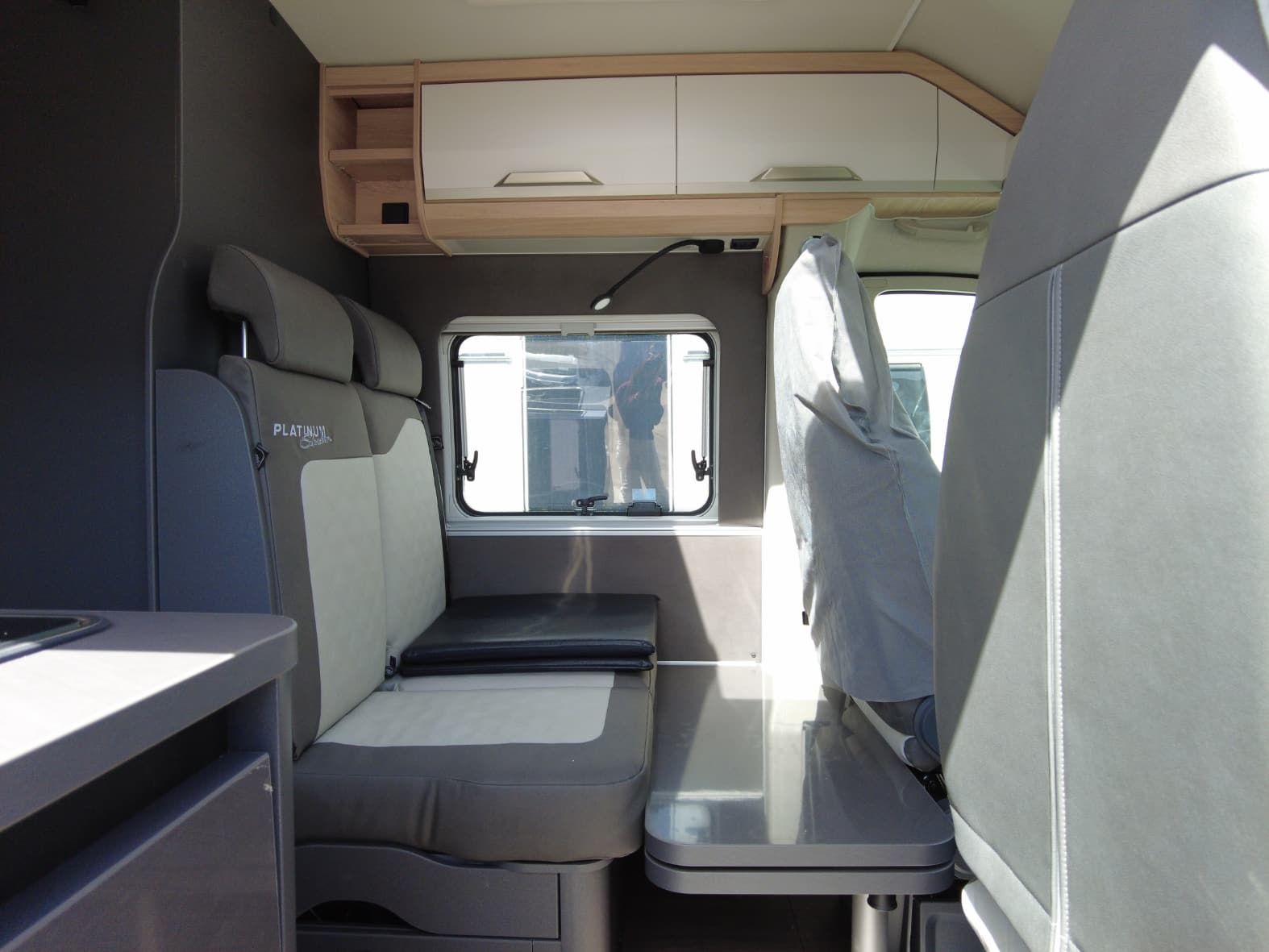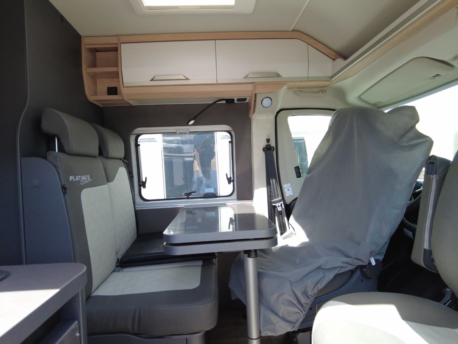 Al acceder al interior, nos encontramos con un salón acogedor y funcional, con capacidad para hasta 4 personas gracias a los asientos giratorios de cabina y una mesa central práctica. Un espacio versátil pensado para compartir momentos, desde una comida tranquila hasta la planificación de la próxima escapada.