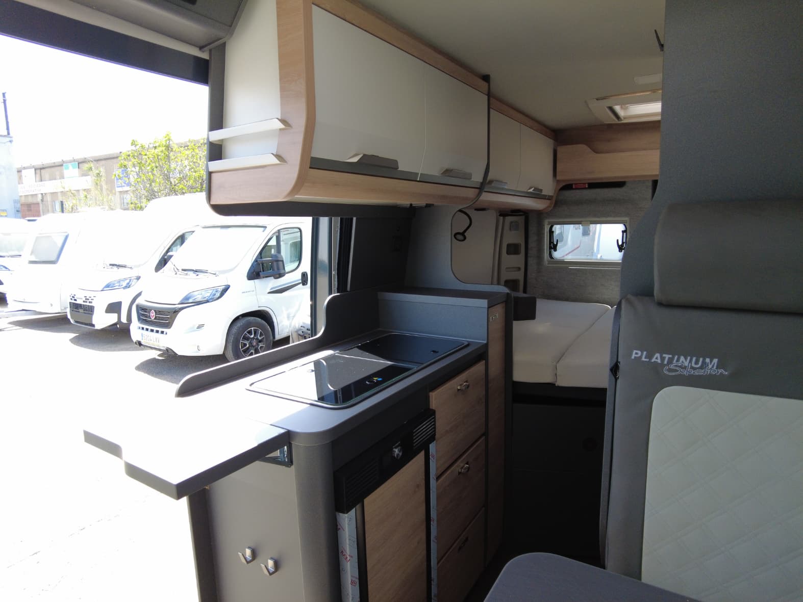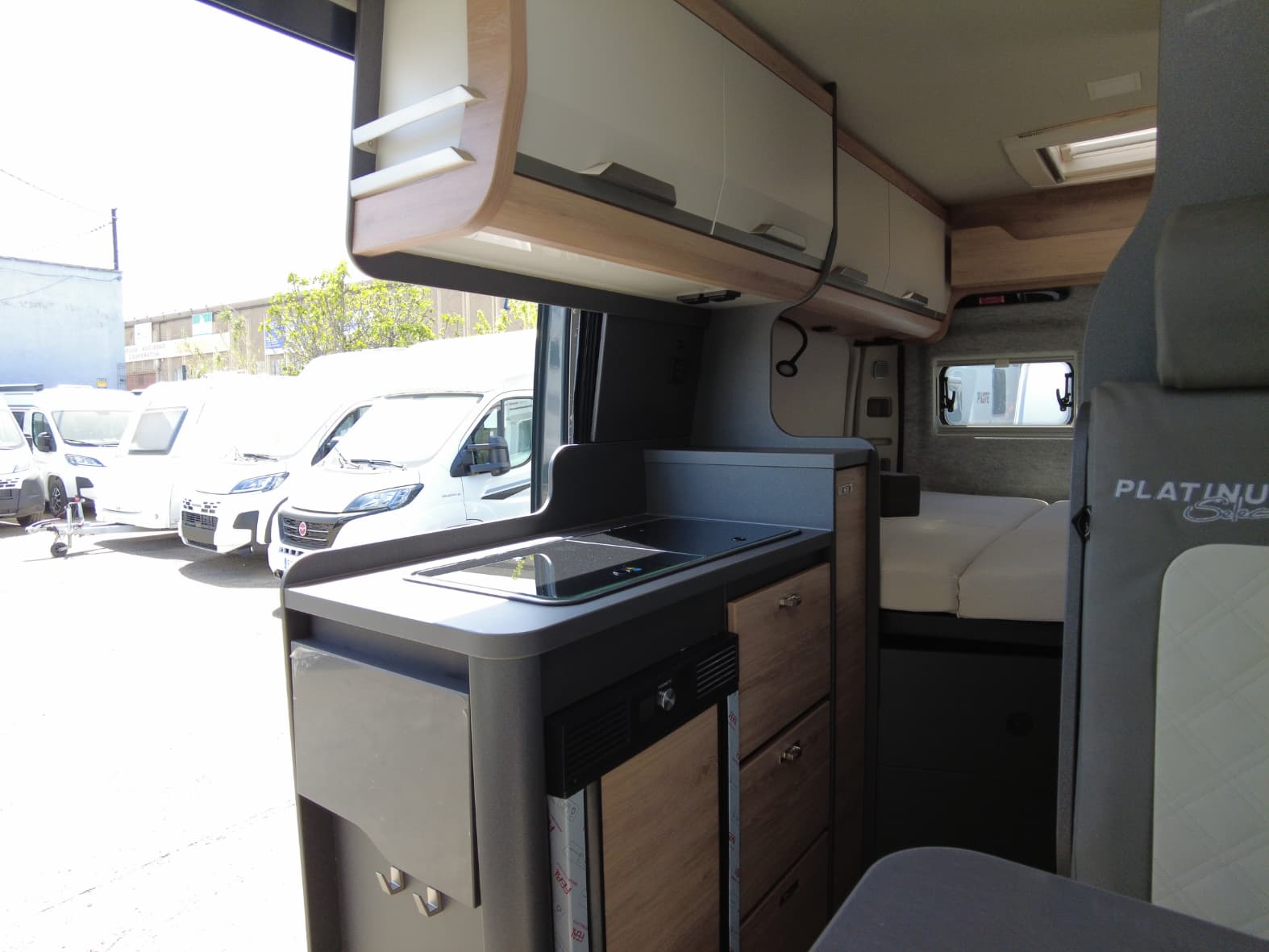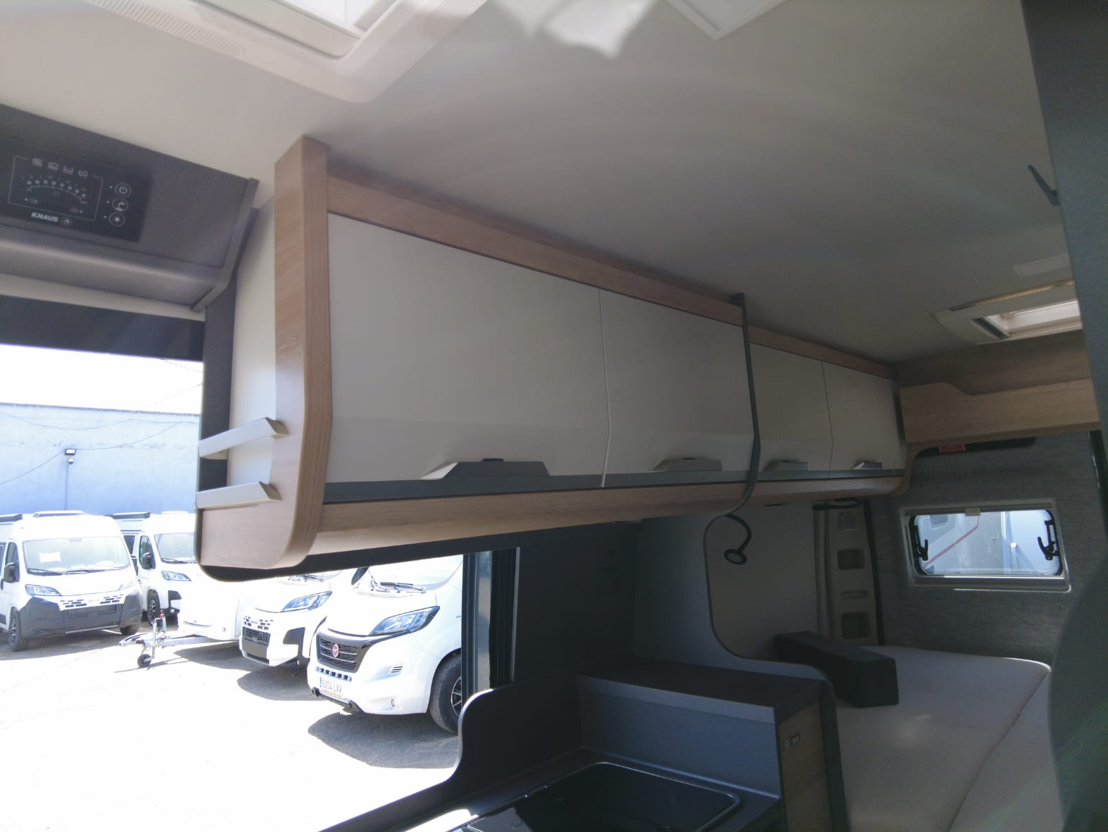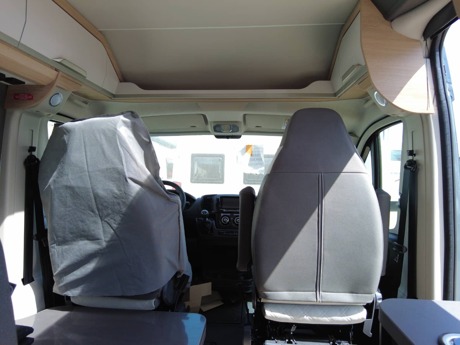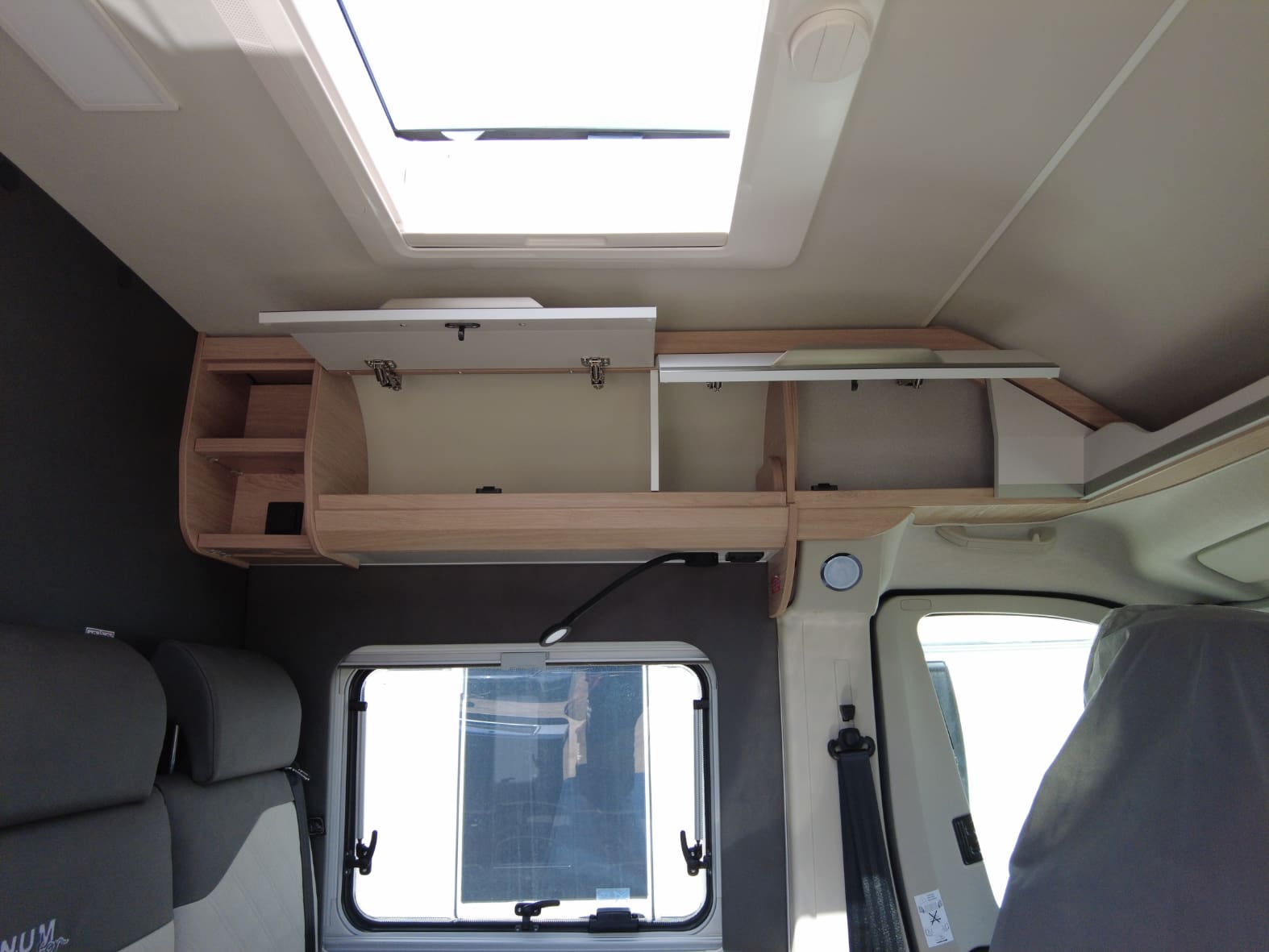 Al acceder al interior, nos encontramos con un salón acogedor y funcional, con capacidad para hasta 4 personas gracias a los asientos giratorios de cabina y una mesa central práctica. Un espacio versátil pensado para compartir momentos, desde una comida tranquila hasta la planificación de la próxima escapada.