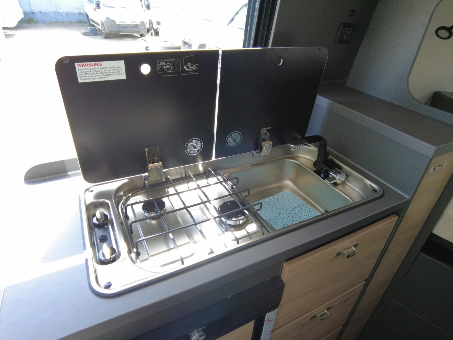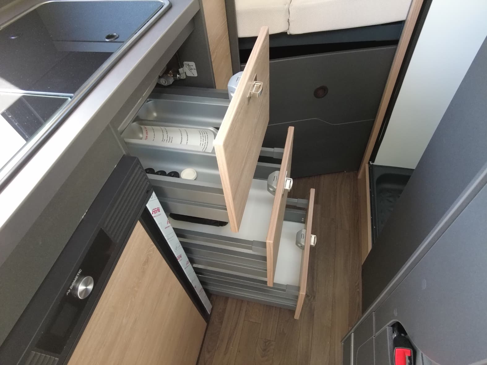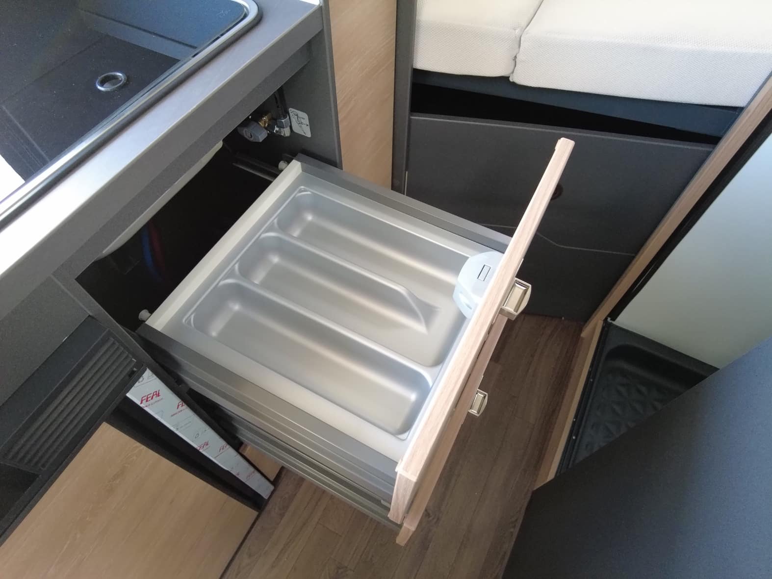 La cocina, perfectamente integrada en el conjunto, está equipada con 2 fuegos a gas, fregadero de acero inoxidable y un frigorífico de compresor de generosa capacidad. Además, cuenta con múltiples compartimentos de almacenamiento que permiten mantener todo en orden, algo fundamental cuando cada centímetro cuenta.