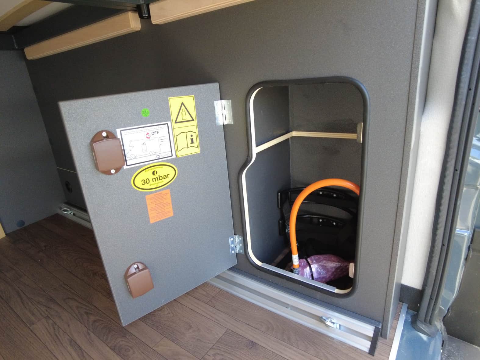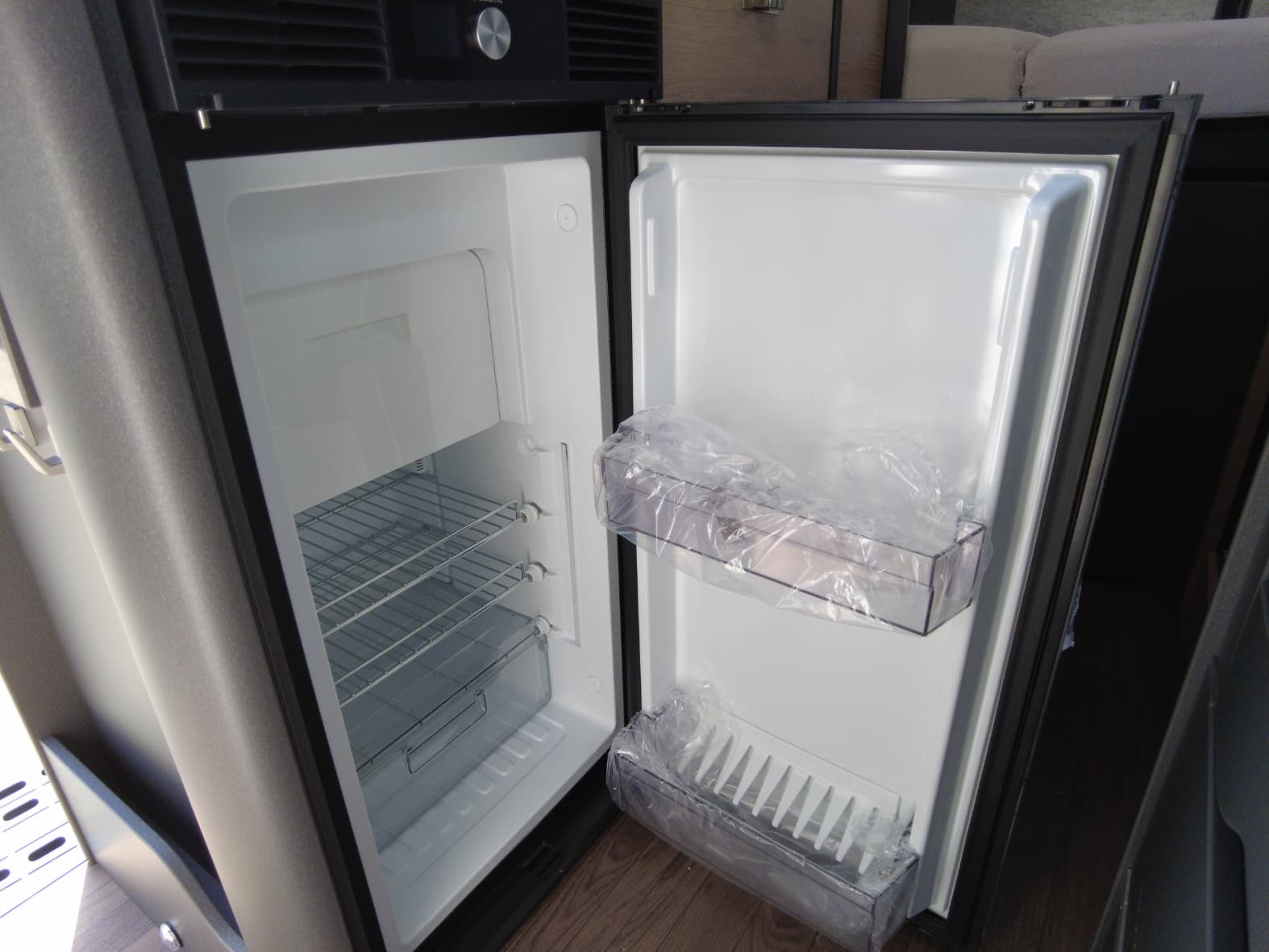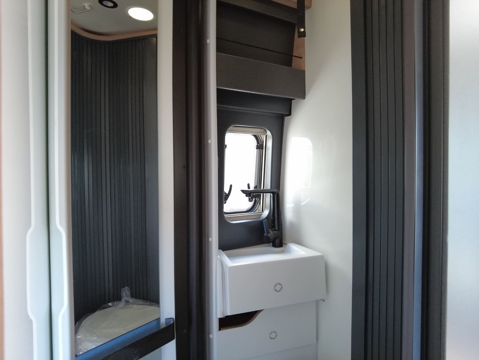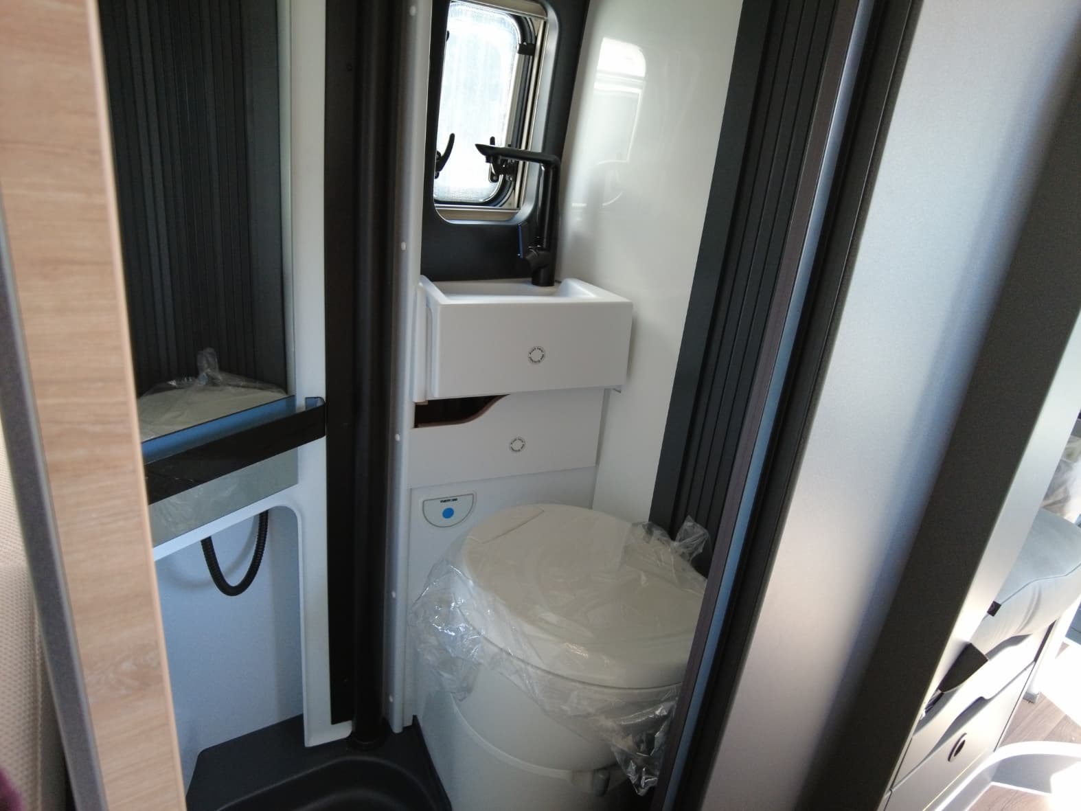 La cocina, perfectamente integrada en el conjunto, está equipada con 2 fuegos a gas, fregadero de acero inoxidable y un frigorífico de compresor de generosa capacidad. Además, cuenta con múltiples compartimentos de almacenamiento que permiten mantener todo en orden, algo fundamental cuando cada centímetro cuenta.