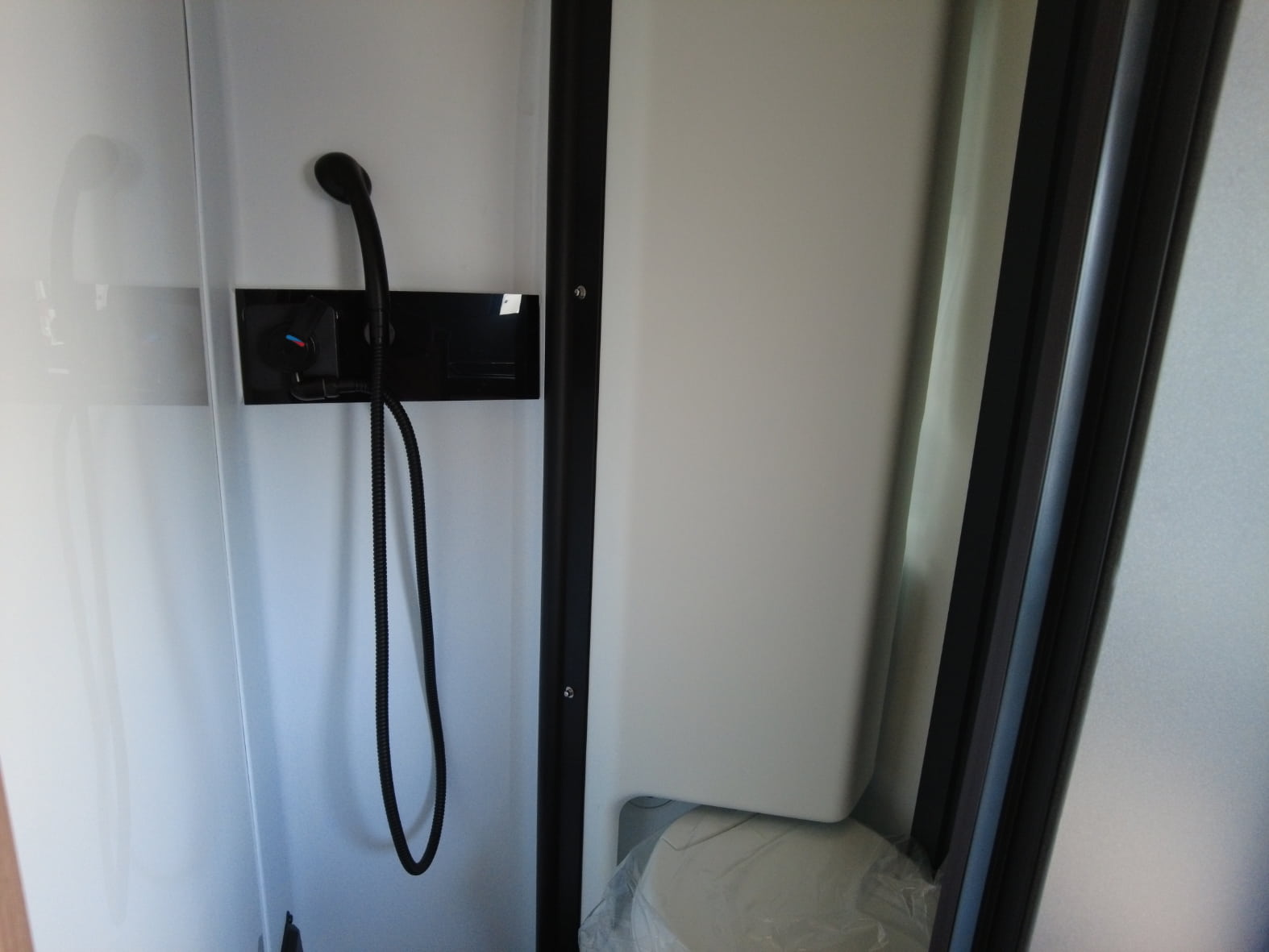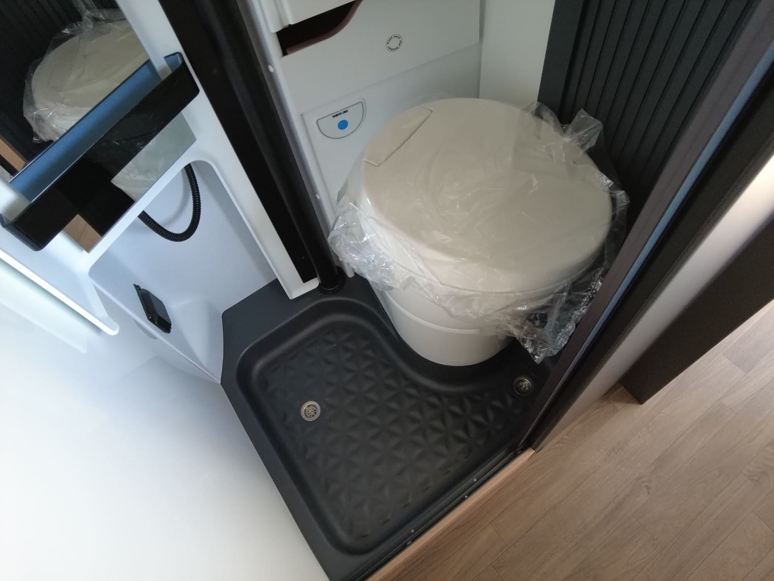 En la zona central se ubica un baño completo, compacto pero bien resuelto, con WC, lavabo y ducha. Un diseño inteligente que optimiza el espacio sin renunciar a la comodidad en el día a día.