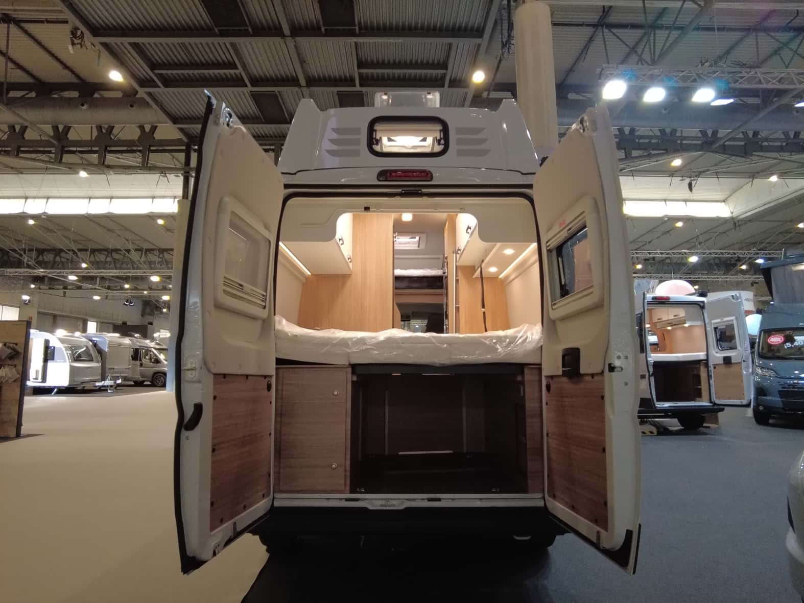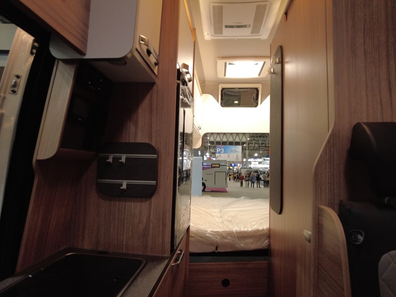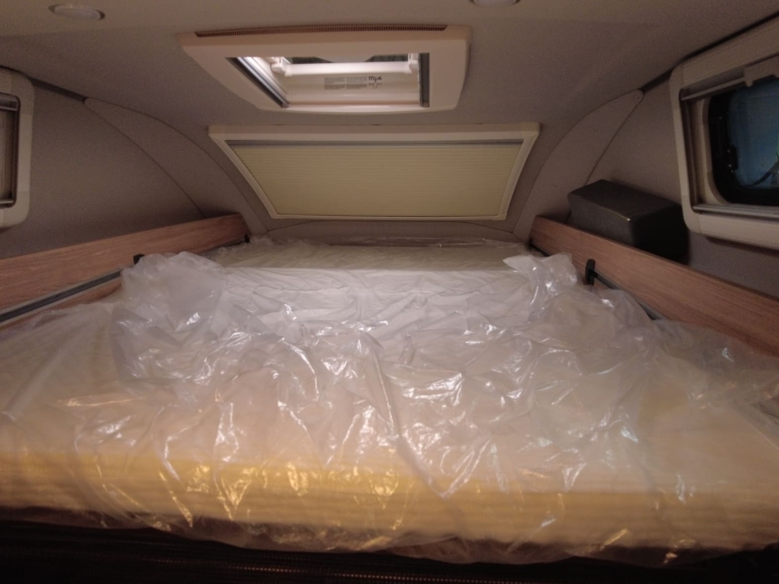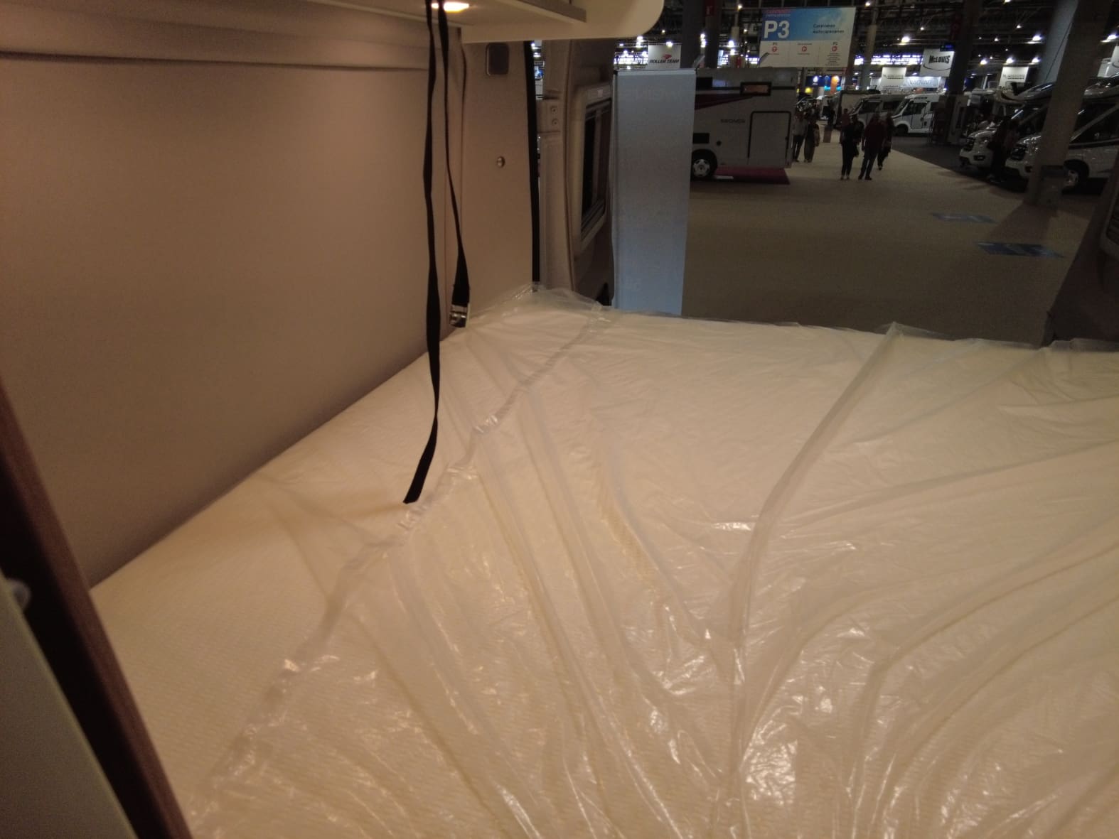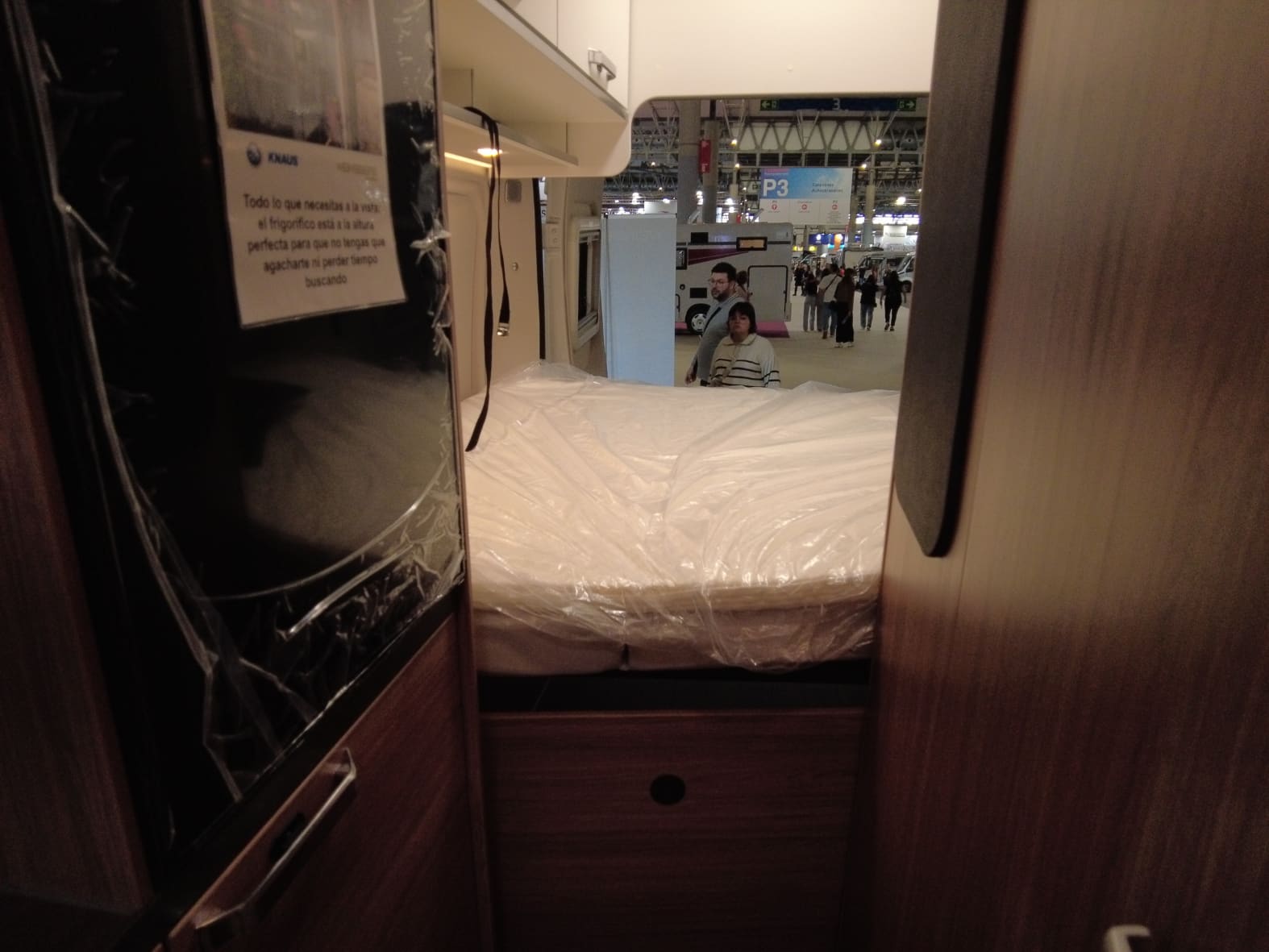 En la parte trasera, encontramos una cómoda cama transversal de aproximadamente 194 × 152/140 cm, ideal para dos personas que buscan dormir a pierna suelta. Bajo ella, el amplio espacio de almacenaje permite transportar equipaje, material deportivo o accesorios indispensables para una ruta de varios días. Colchón de calidad, somier sólido y ventilación adecuada.
