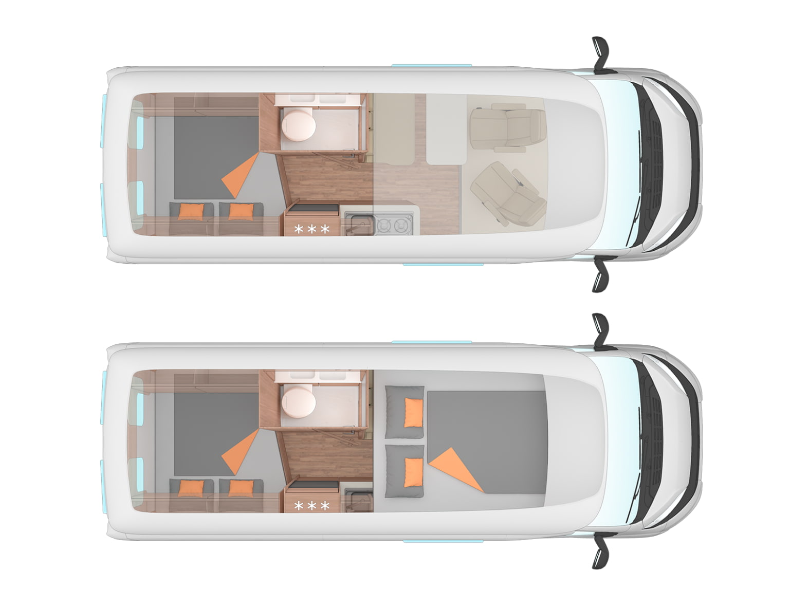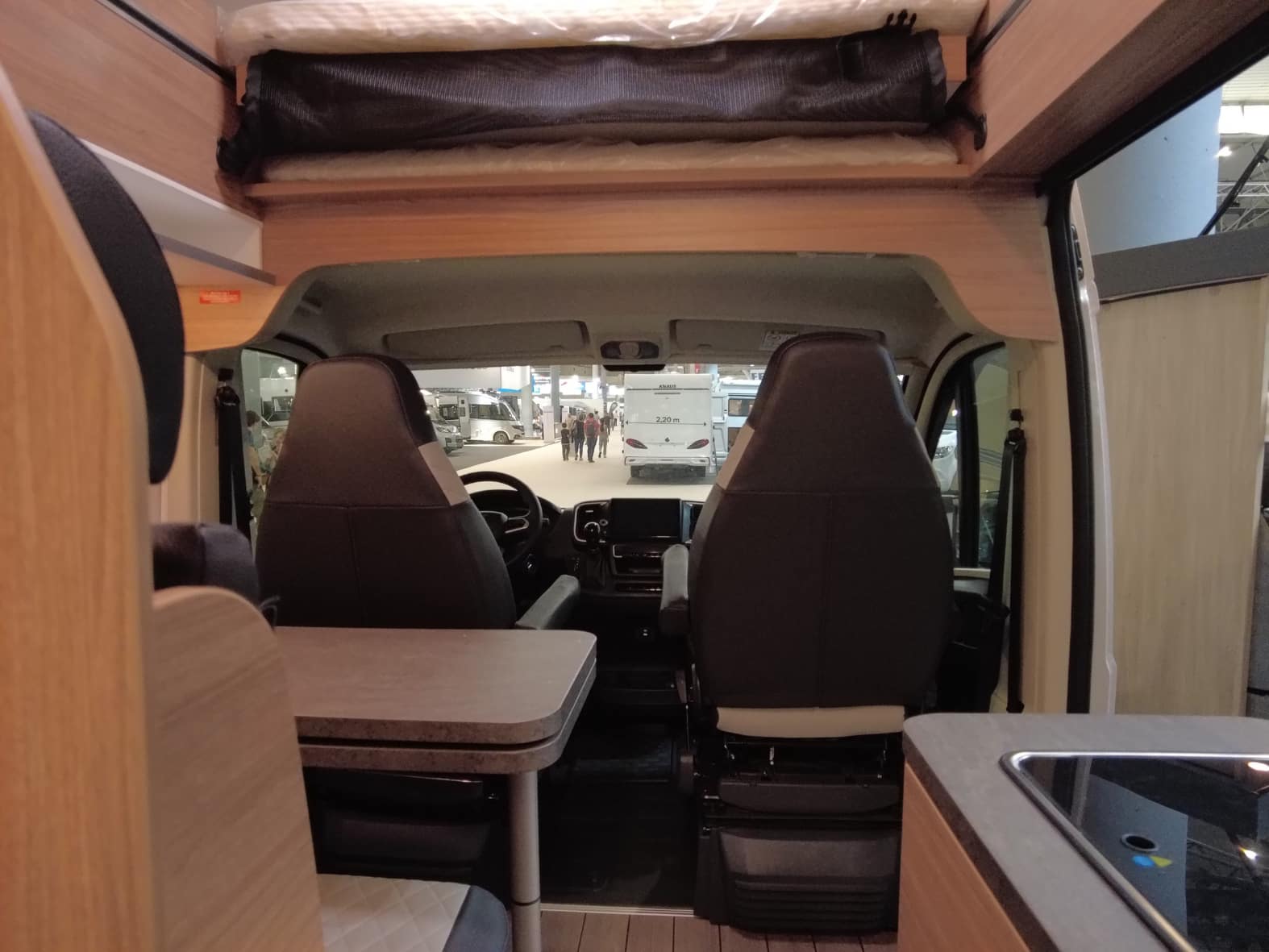 El salón delantero ofrece una zona confortable gracias a los asientos giratorios y la mesa practicable. Pero la estrella de esta camper es la cama abatible superior EasySlide, situada bajo el techo alto, que proporciona otras dos plazas para dormir (aprox. 200 × 130 cm). Así, esta camper permite viajar y pernoctar hasta cuatro personas, sin sacrificar la movilidad típica de una 6 metros.