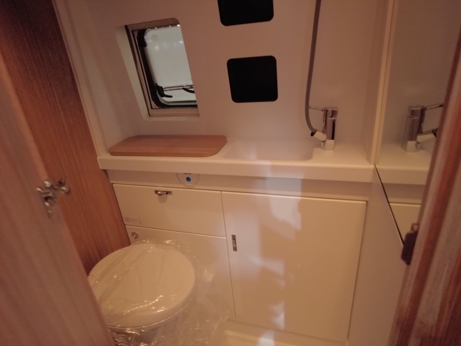 El baño, situado frente a la zona de descanso, está equipado con WC tipo cassette, lavabo y ducha, ofreciendo un conjunto compacto y funcional, pensado para el uso diario sin complicaciones. Todo está estudiado para optimizar el espacio, manteniendo esa sensación de confort.