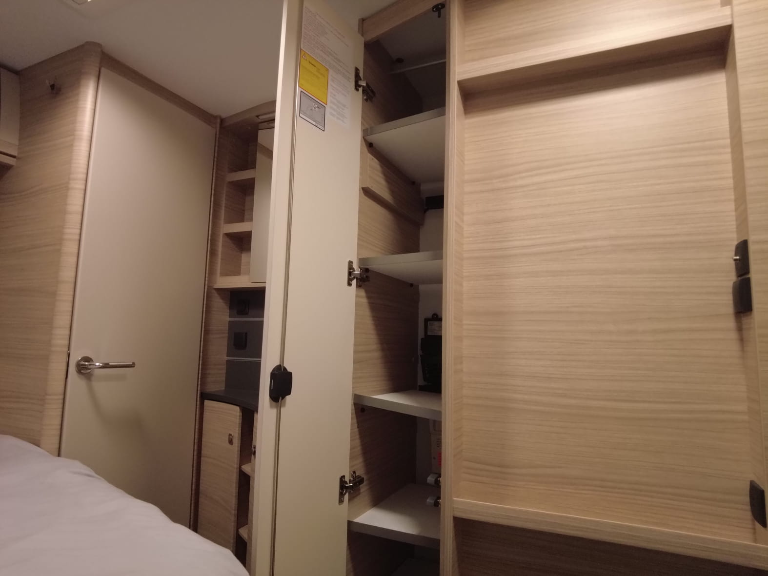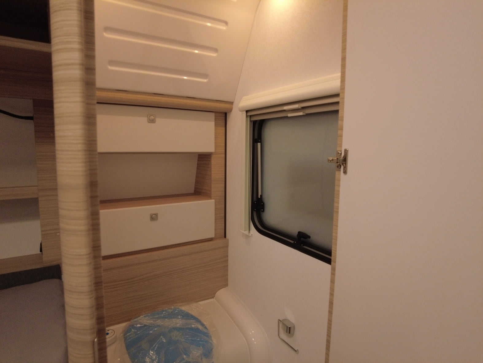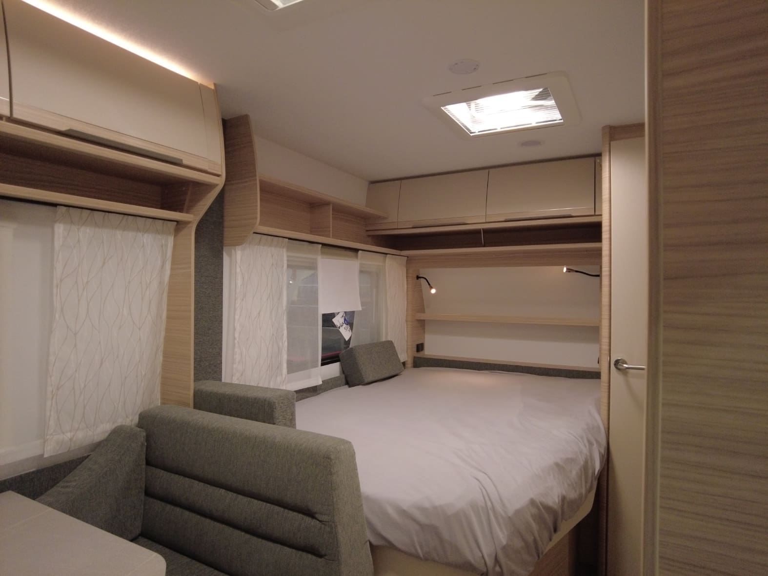 Su distribución práctica y acogedora aprovecha al máximo el espacio interior. En la parte delantera encontramos una cama fija doble de generosas dimensiones, acompañada de armarios superiores y compartimentos inferiores que ofrecen un excelente espacio de almacenamiento.