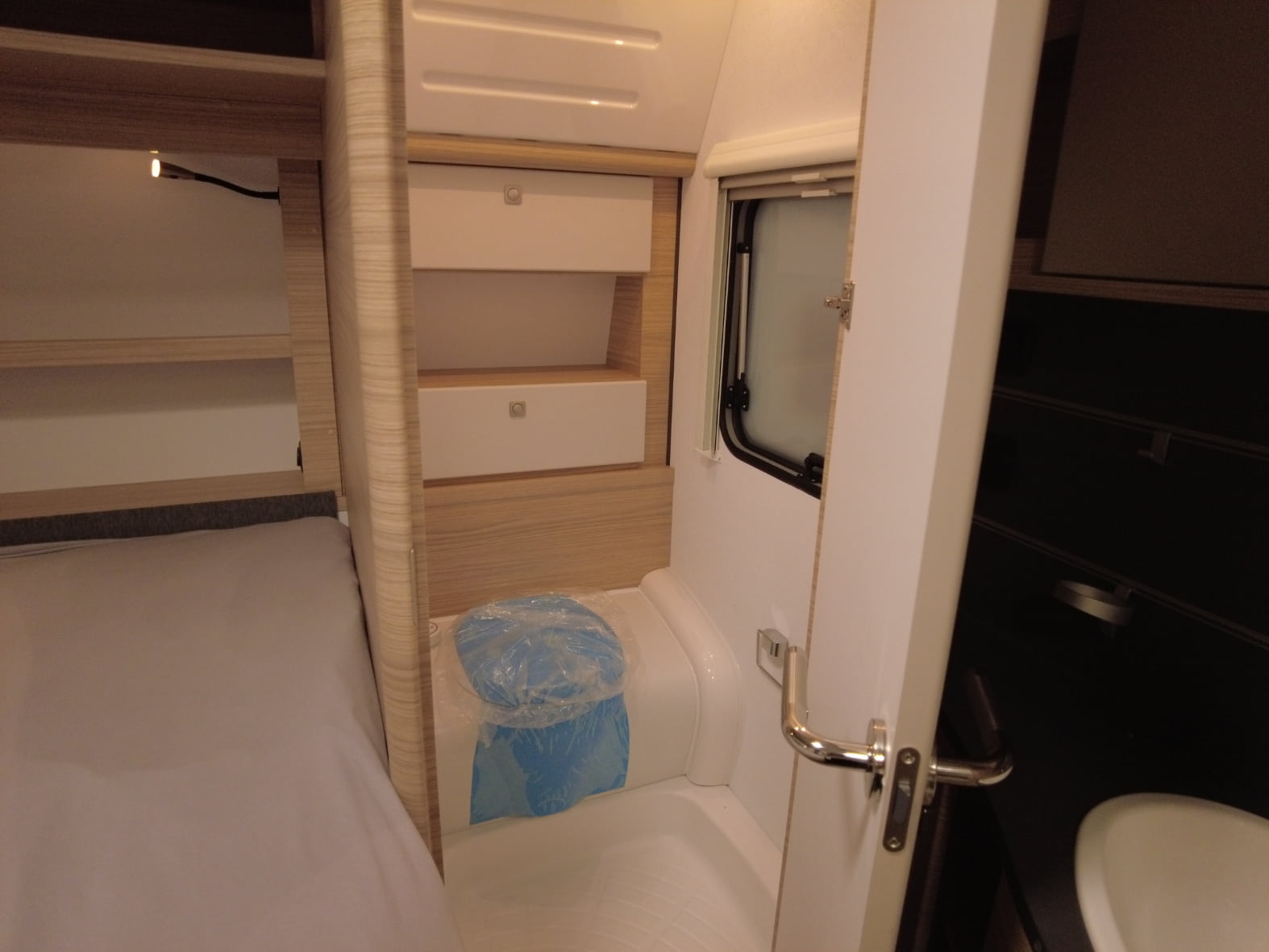 El cuarto de baño, ubicado junto a la cama, incluye un inodoro Thetford, espejo con iluminación y prácticos espacios de almacenaje, ofreciendo comodidad en cada viaje.