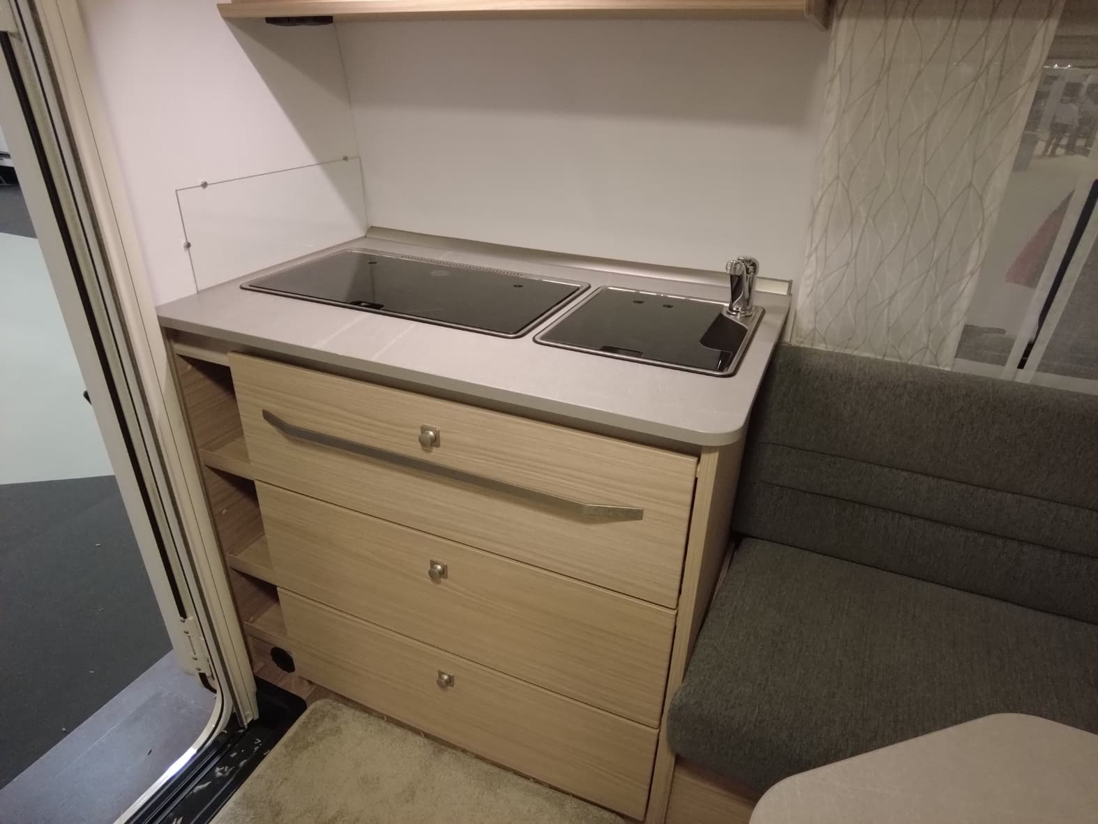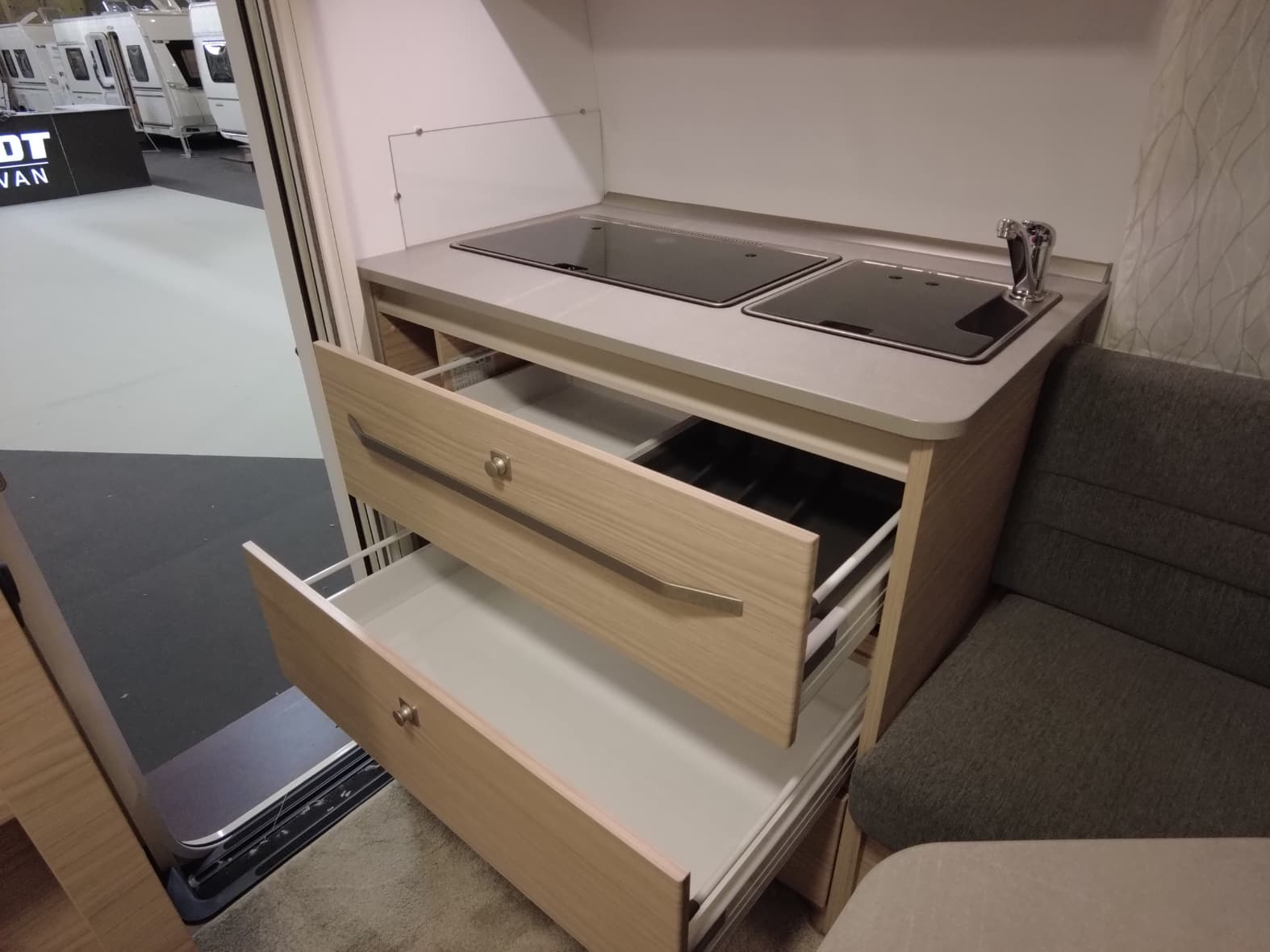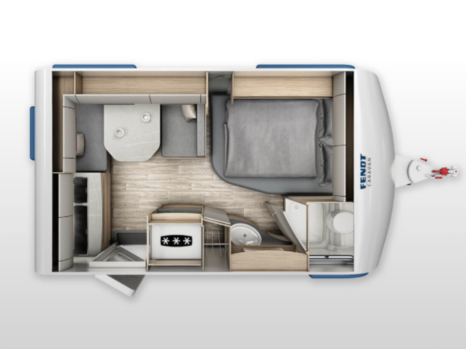 La cocina central, compacta pero muy funcional, dispone de una placa de 3 fuegos, fregadero de acero inoxidable y amplios cajones y estantes para guardar utensilios y alimentos. Todo está diseñado con el inconfundible estilo Fendt: líneas modernas, materiales de alta calidad y una iluminación que realza cada detalle.