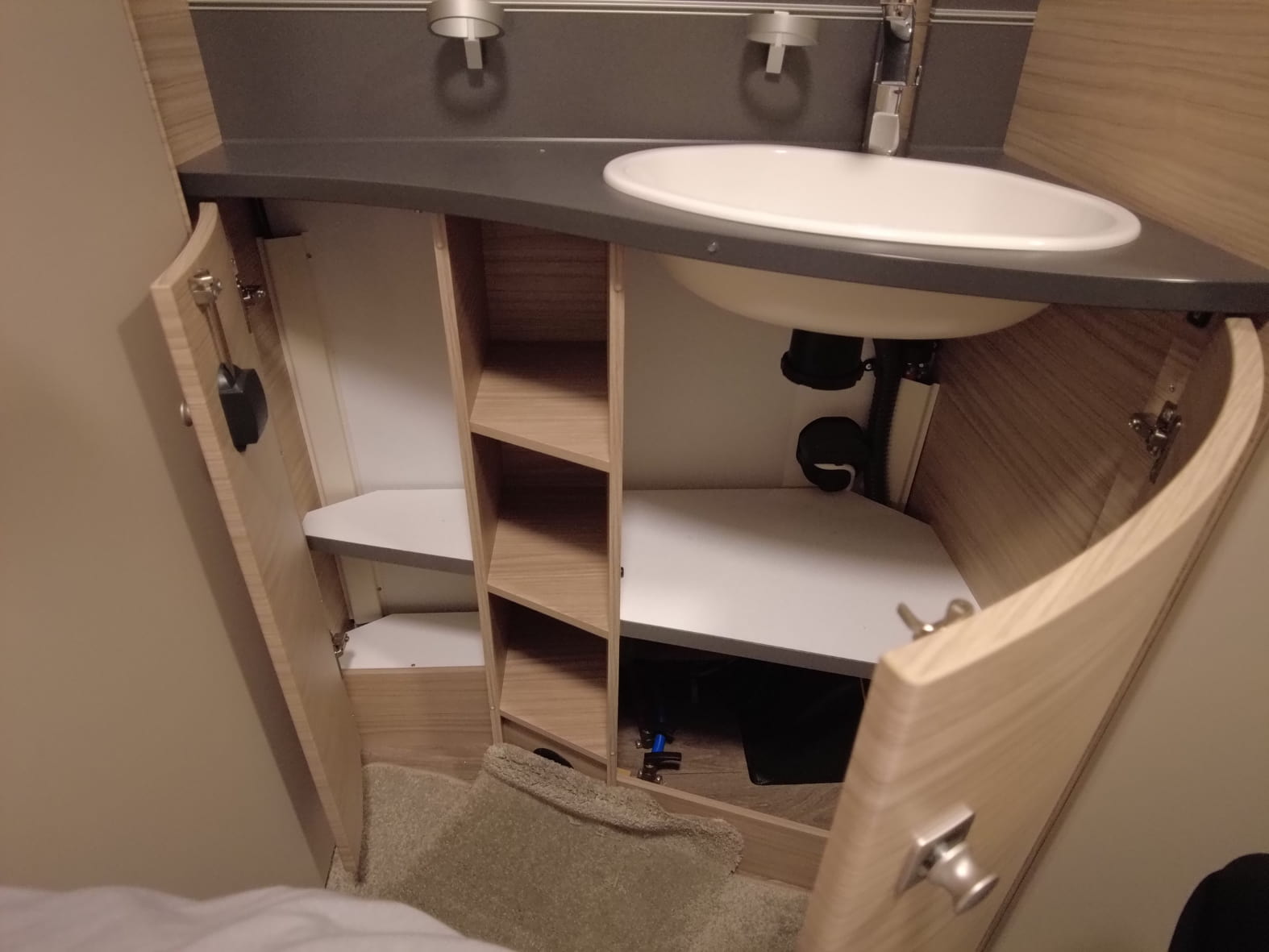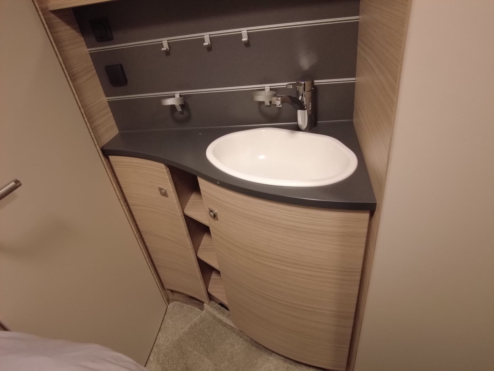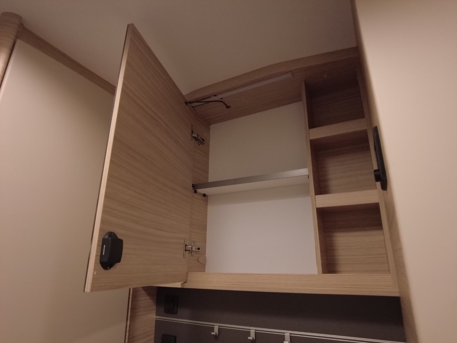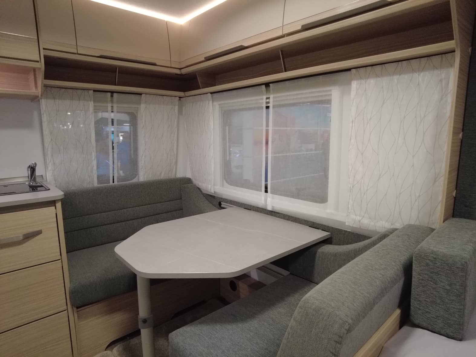 La cocina central, compacta pero muy funcional, dispone de una placa de 3 fuegos, fregadero de acero inoxidable y amplios cajones y estantes para guardar utensilios y alimentos. Todo está diseñado con el inconfundible estilo Fendt: líneas modernas, materiales de alta calidad y una iluminación que realza cada detalle.
