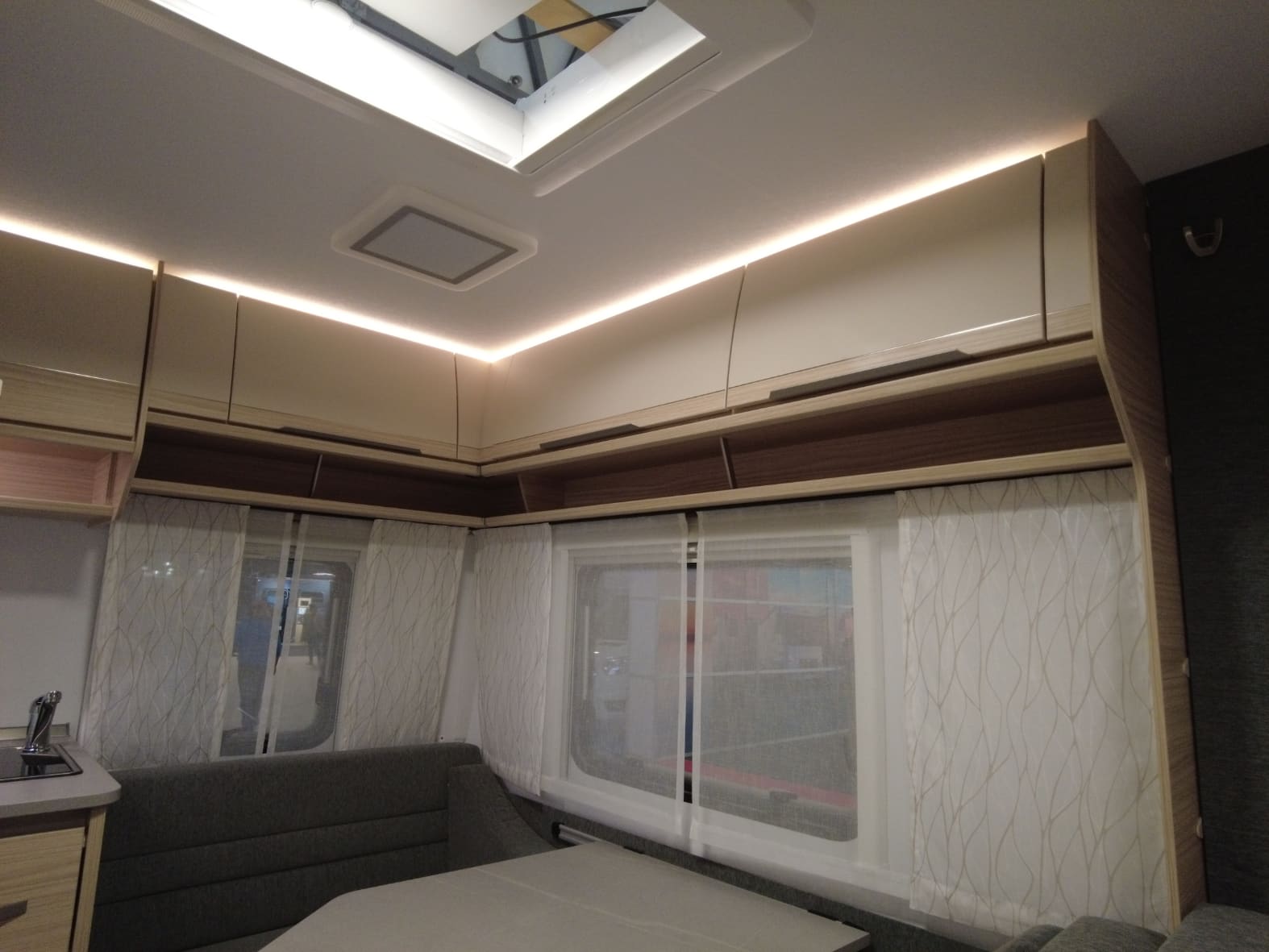 En la zona trasera, el comedor convertible en cama permite adaptar el ambiente según las necesidades del viaje, ideal tanto para descansar como para disfrutar de las comidas en un entorno cálido y luminoso.