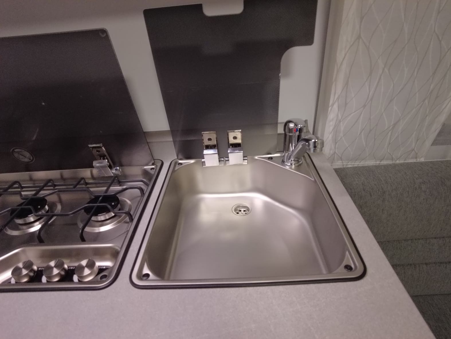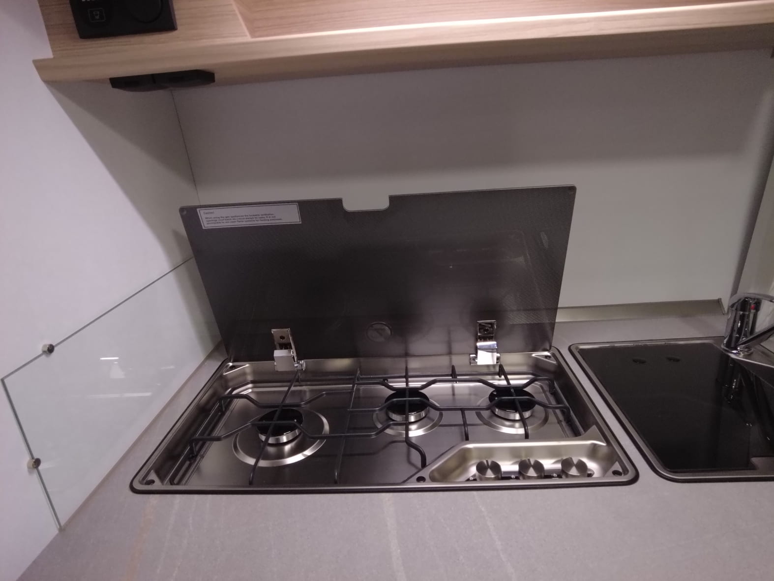 • Cocina (3 fuegos) con fusible de encendido , encendido automático, parrilla de cocción esmaltada mate, tapa de cristal y fregadero independiente de acero inoxidable con tapa de cristal
