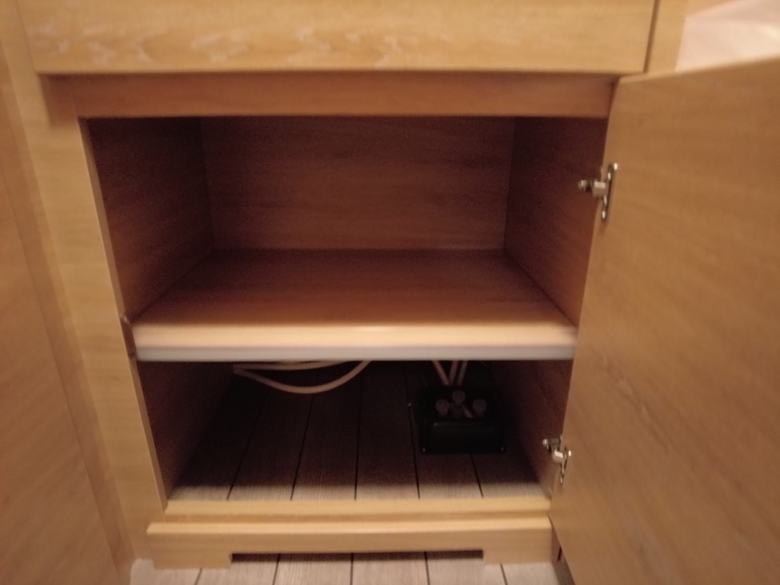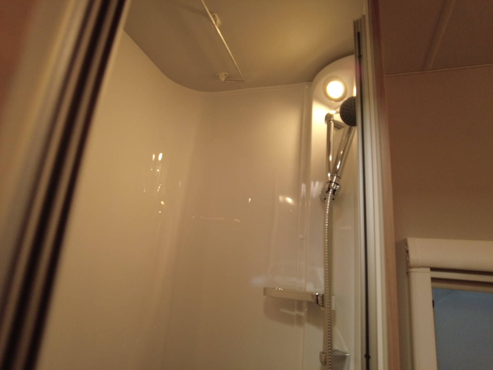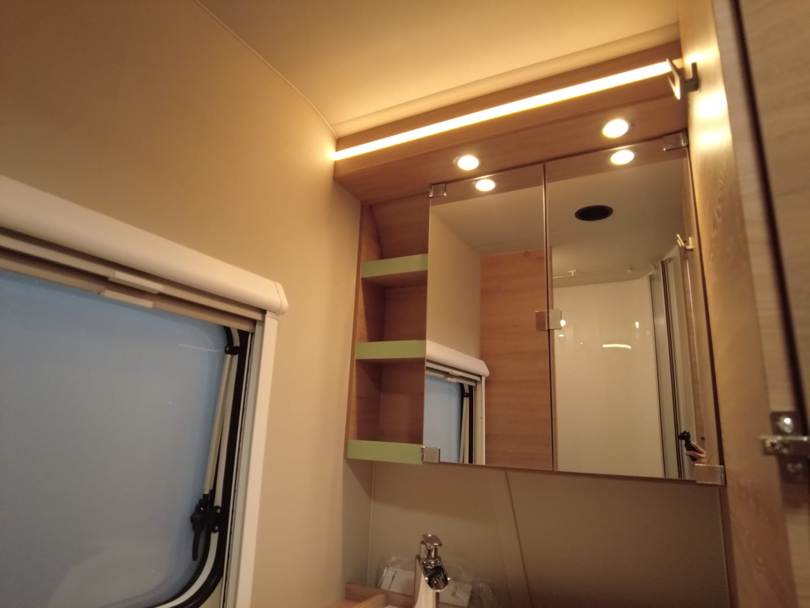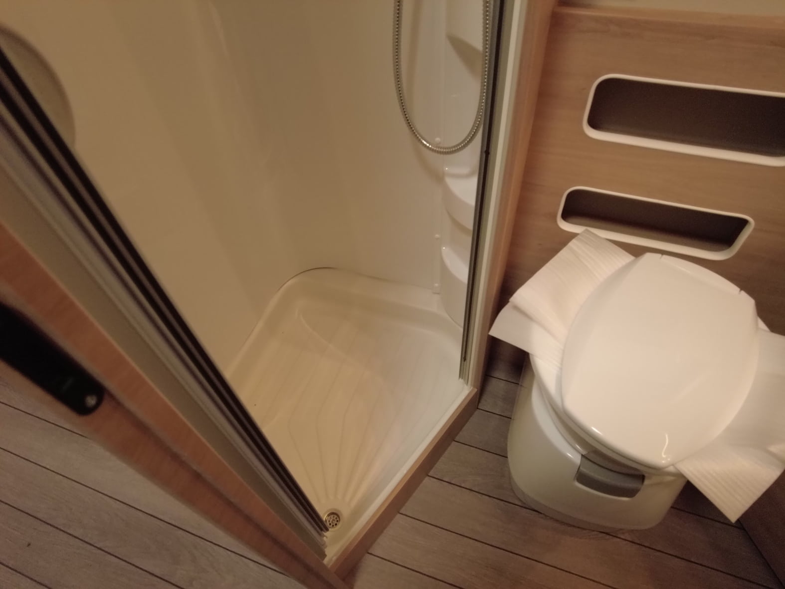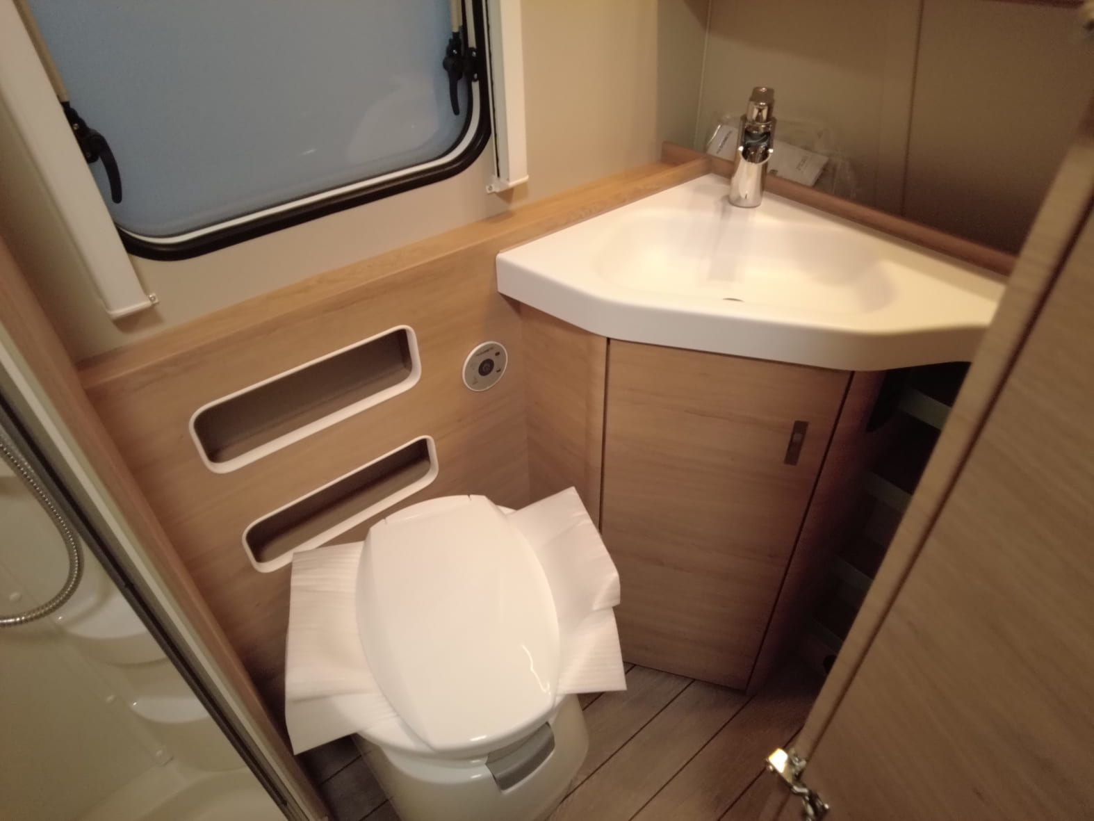 El cuarto de baño compacto integra un inodoro Thetford, lavabo, ducha independiente y múltiples compartimentos, ofreciendo comodidad y practicidad en un espacio bien aprovechado.