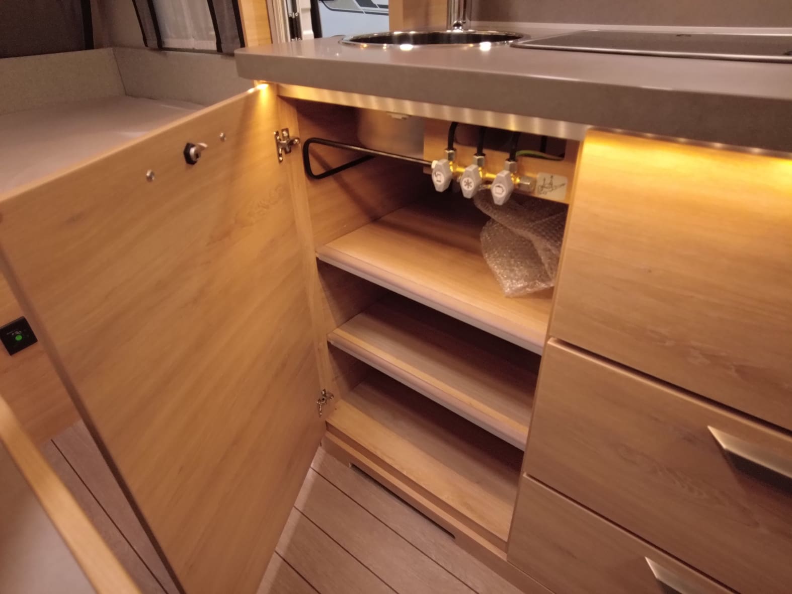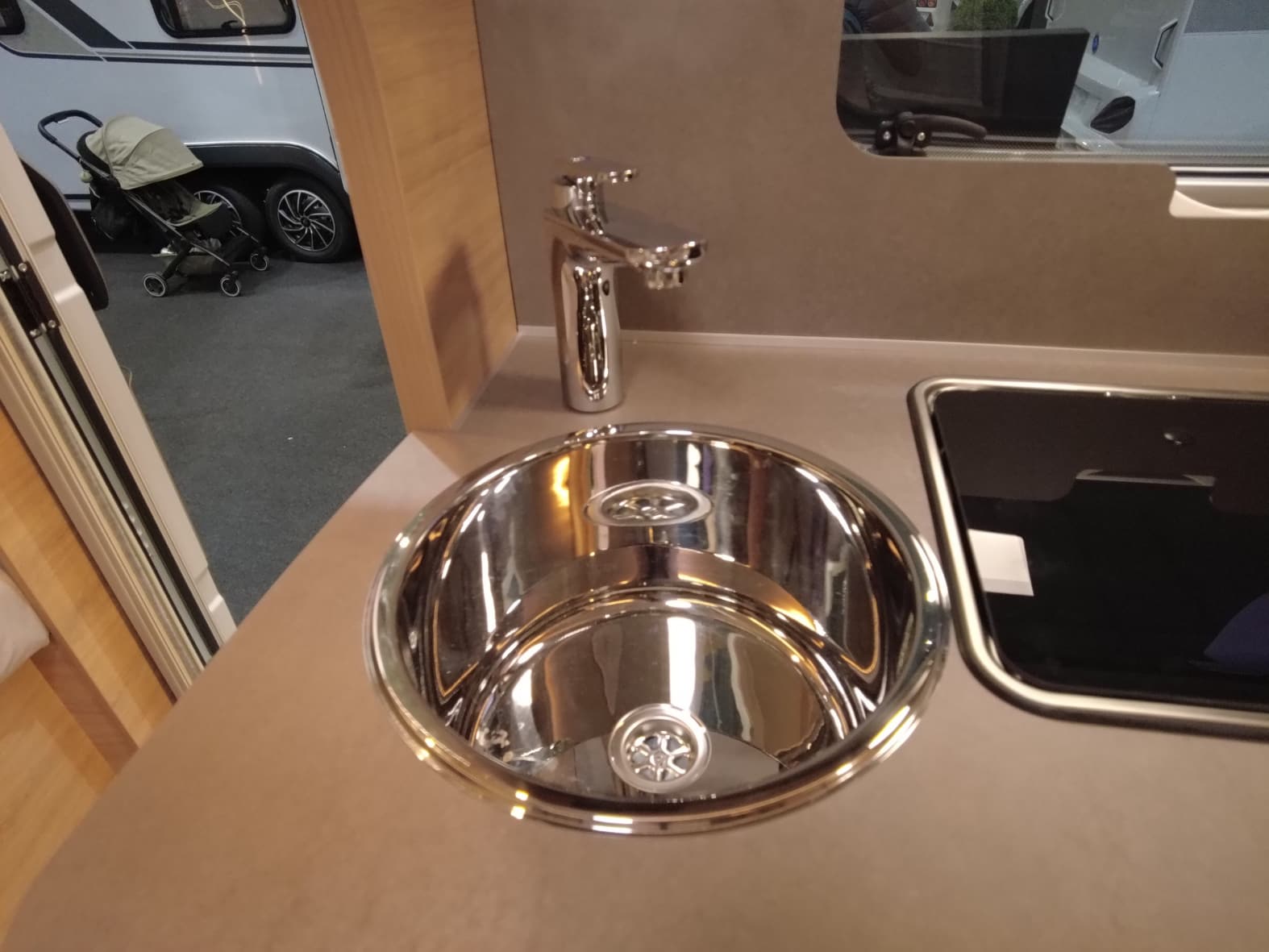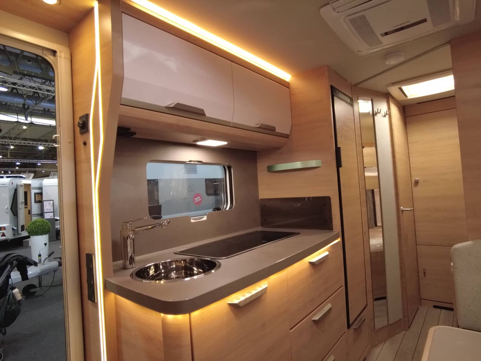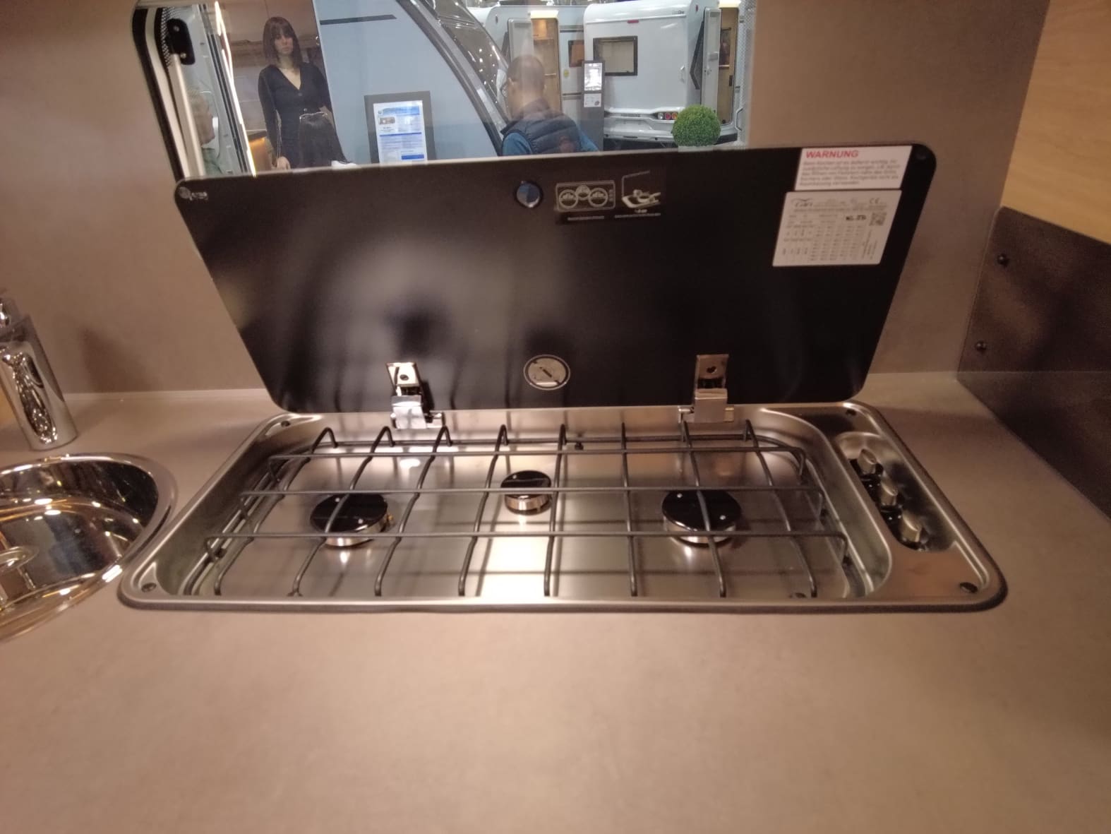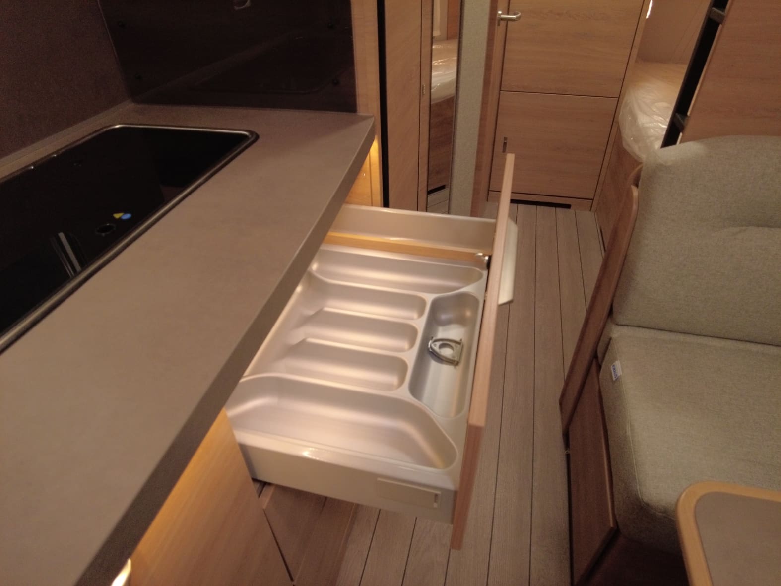 La cocina central destaca por su diseño ergonómico y funcional, equipada con placa de 3 fuegos, fregadero de acero inoxidable y espaciosos cajones y armarios para almacenar todo lo necesario durante el viaje.