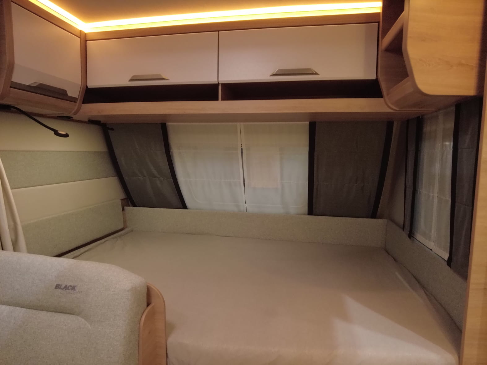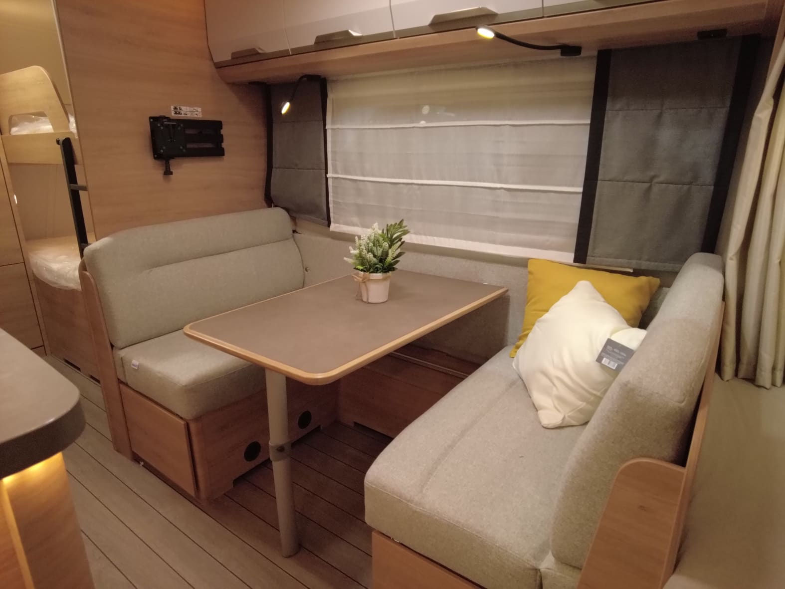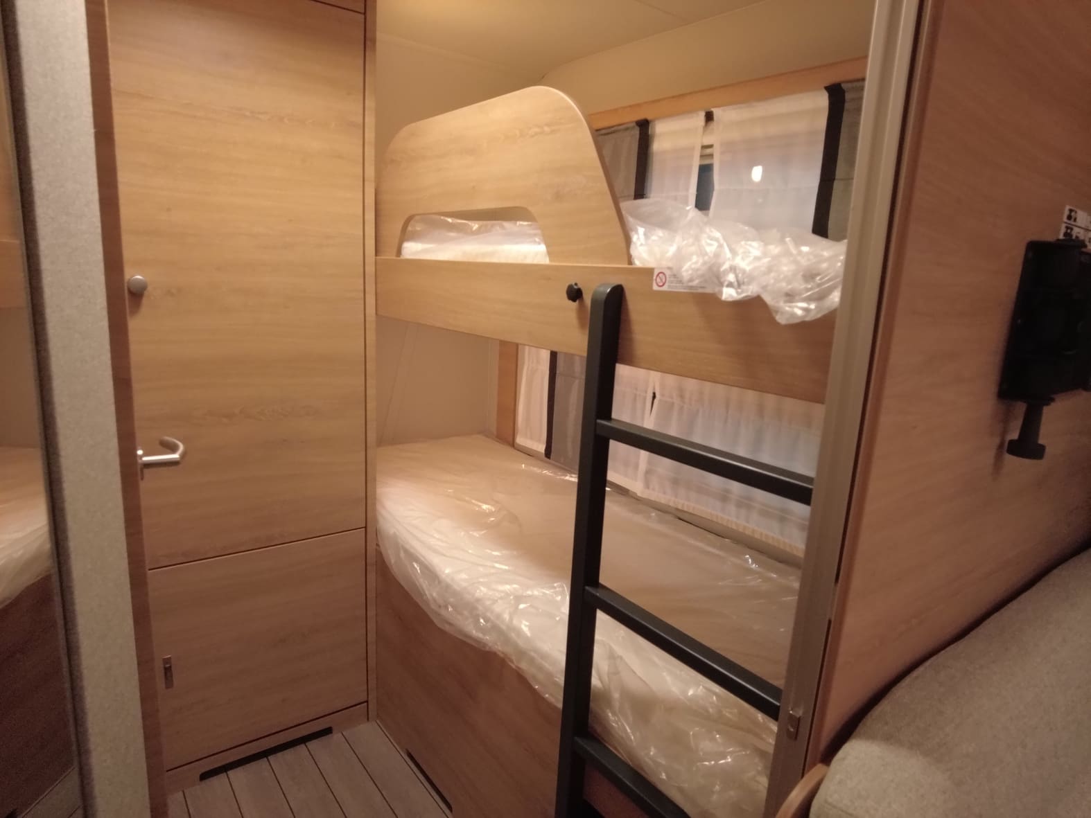 En la parte delantera dispone de una amplia cama doble fija, perfecta para el descanso. En la zona central, el salón comedor convertible en cama permite disfrutar de las comidas o de momentos en grupo, mientras que en la parte trasera encontramos las literas dobles, muy cómodas para los más pequeños o invitados.