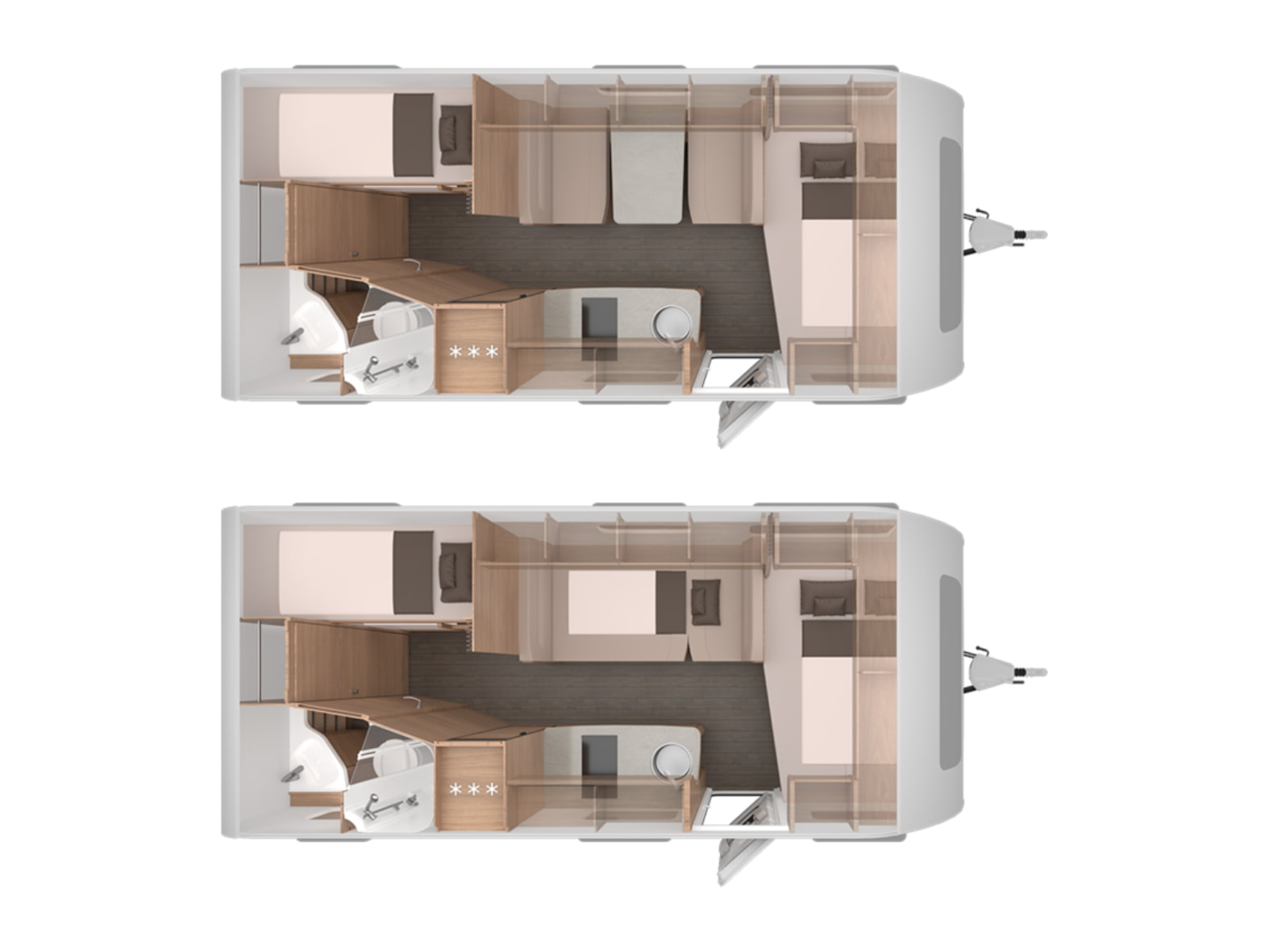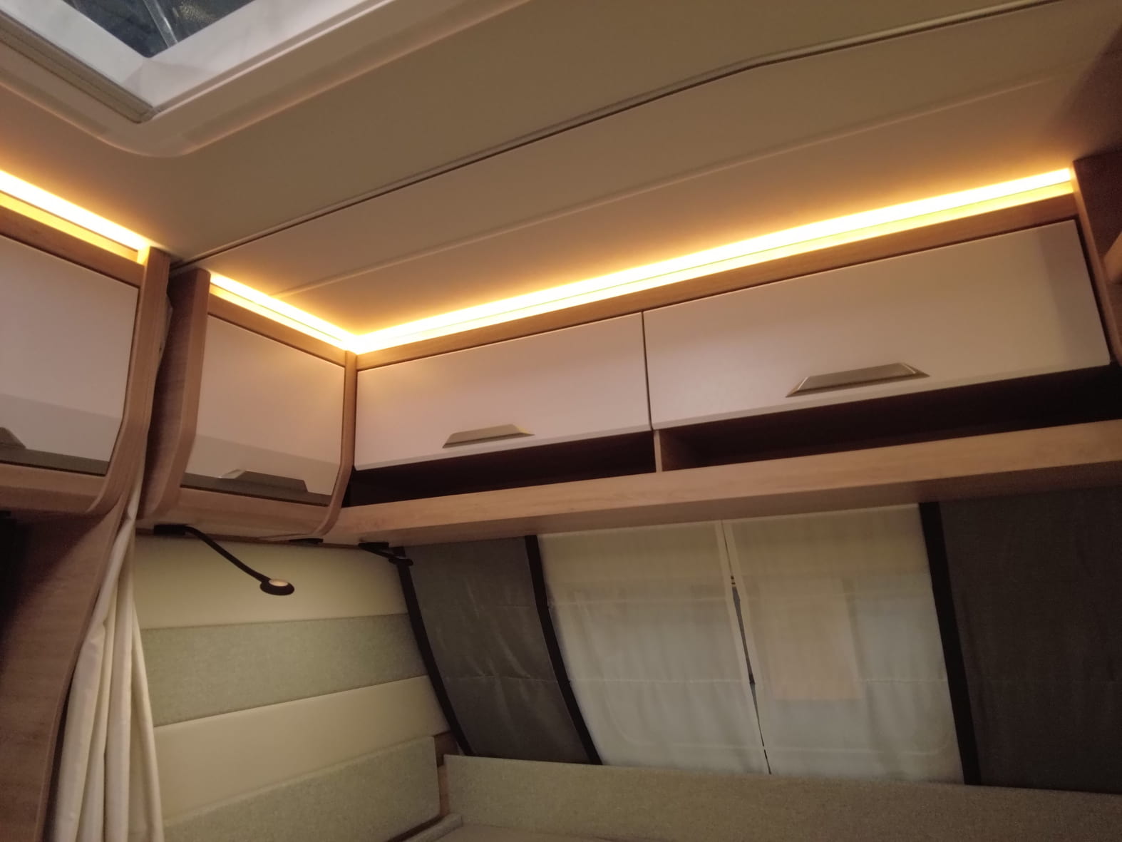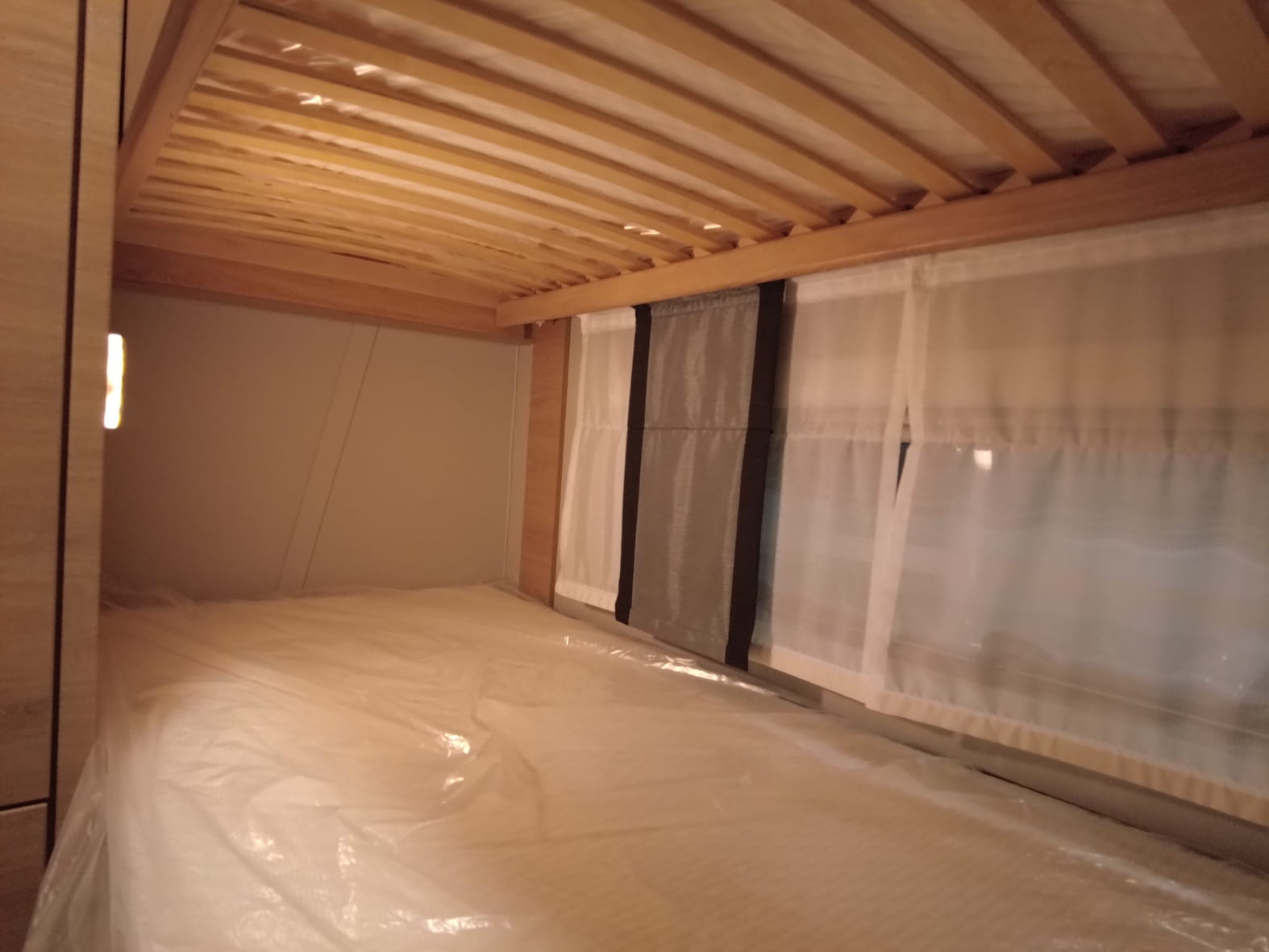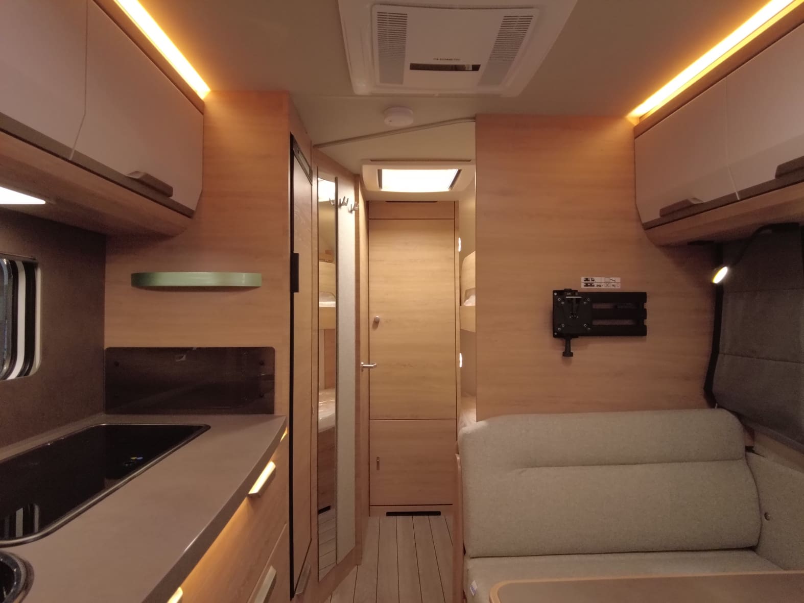 En la parte delantera dispone de una amplia cama doble fija, perfecta para el descanso. En la zona central, el salón comedor convertible en cama permite disfrutar de las comidas o de momentos en grupo, mientras que en la parte trasera encontramos las literas dobles, muy cómodas para los más pequeños o invitados.