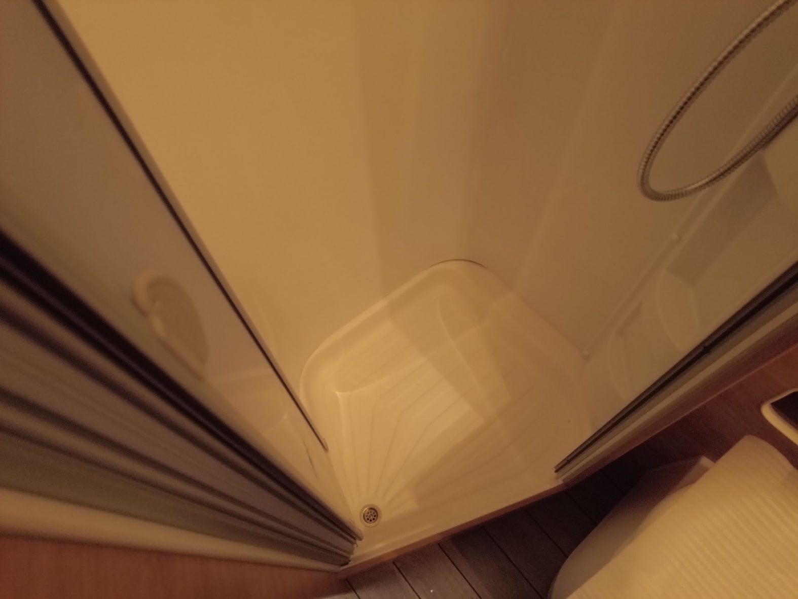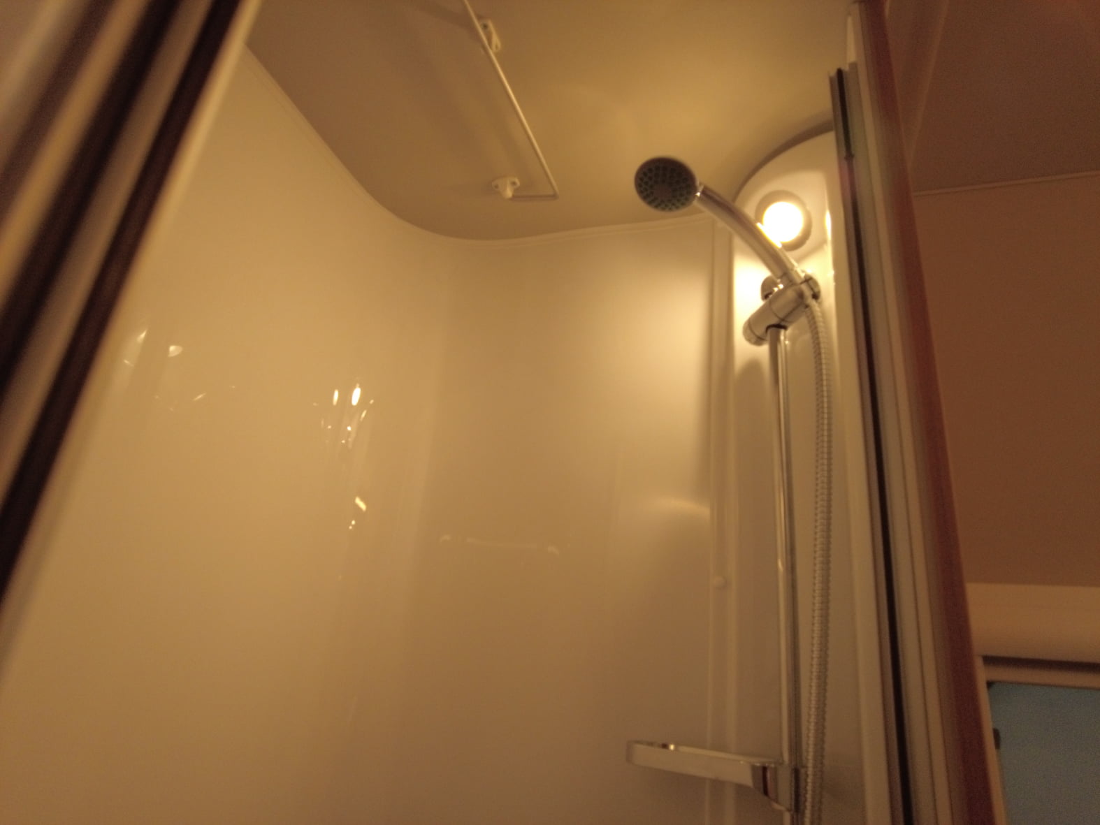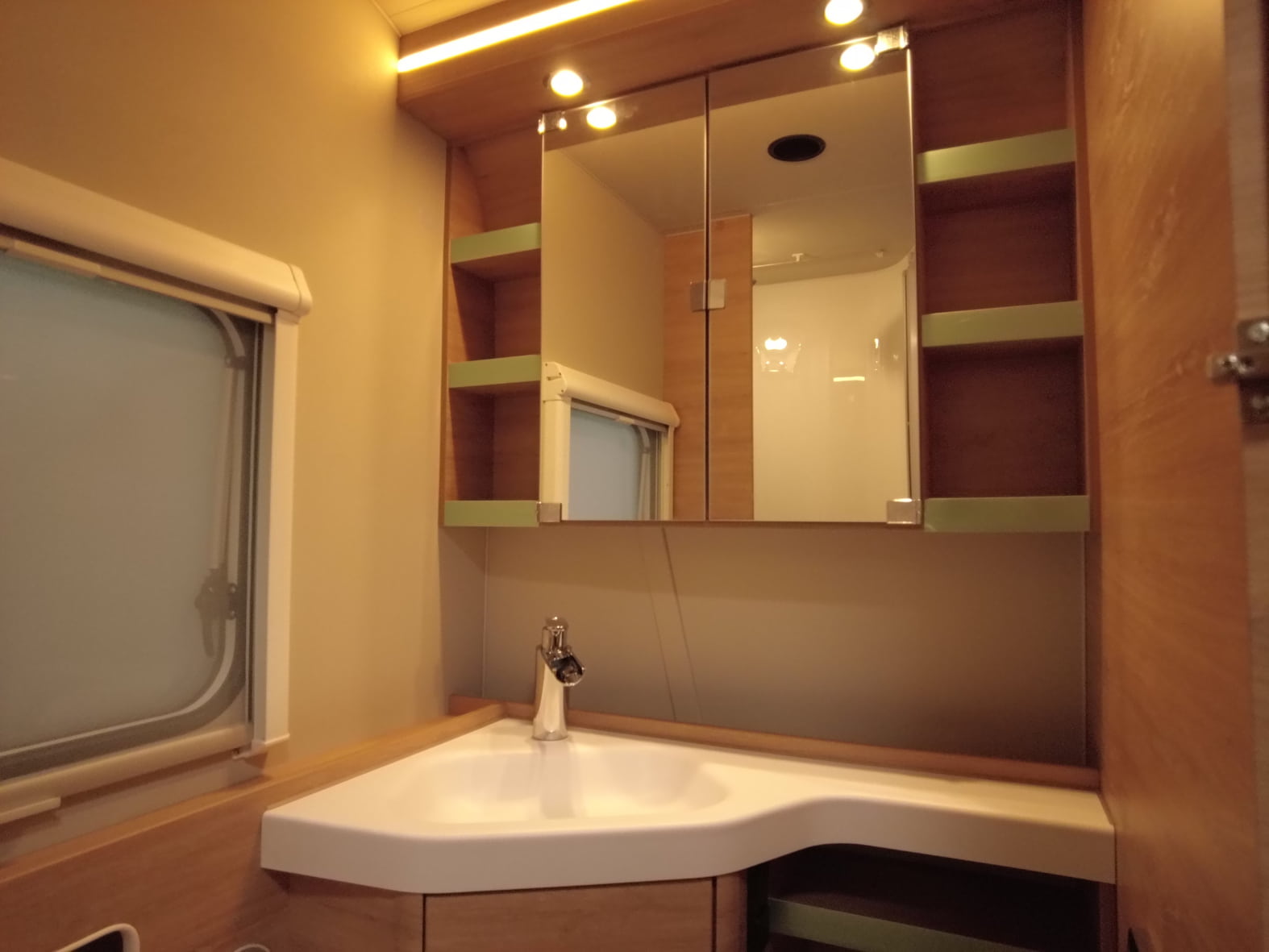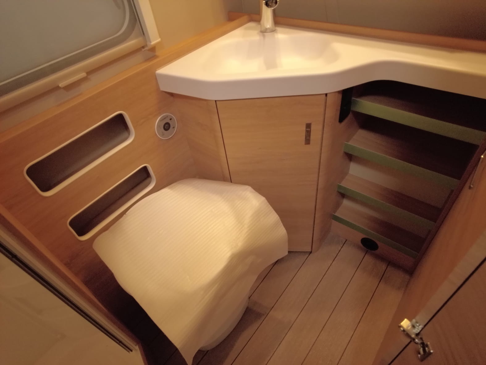 El baño compacto, con inodoro Thetford, lavabo y ducha integrada, aprovecha al máximo el espacio ofreciendo funcionalidad sin renunciar al diseño.