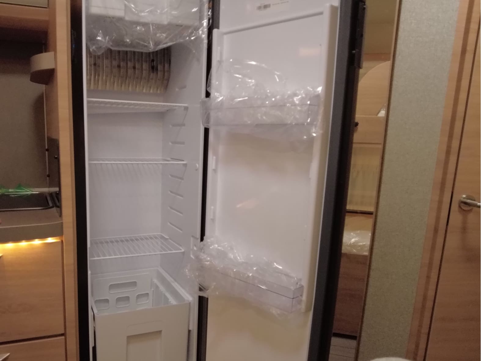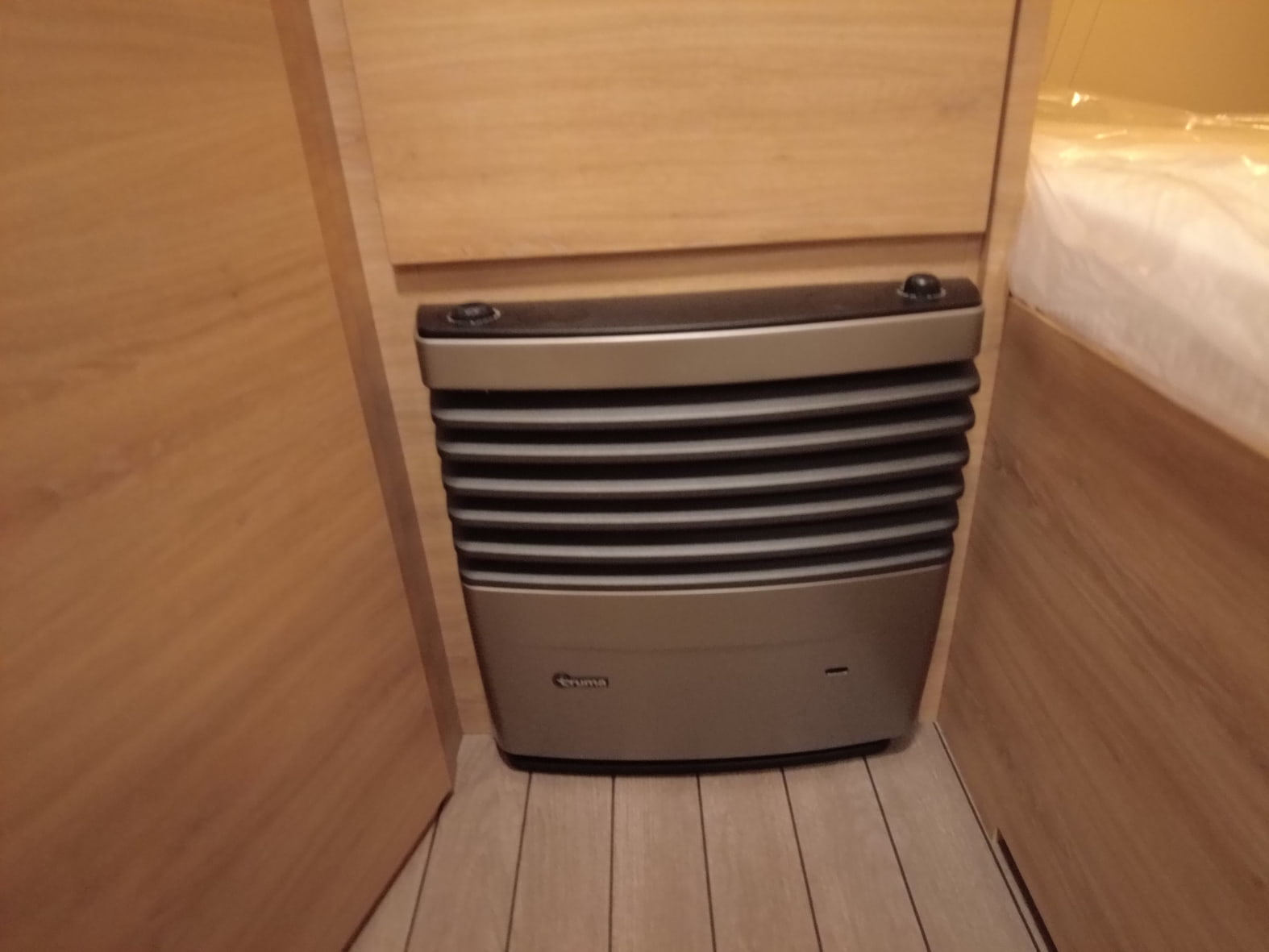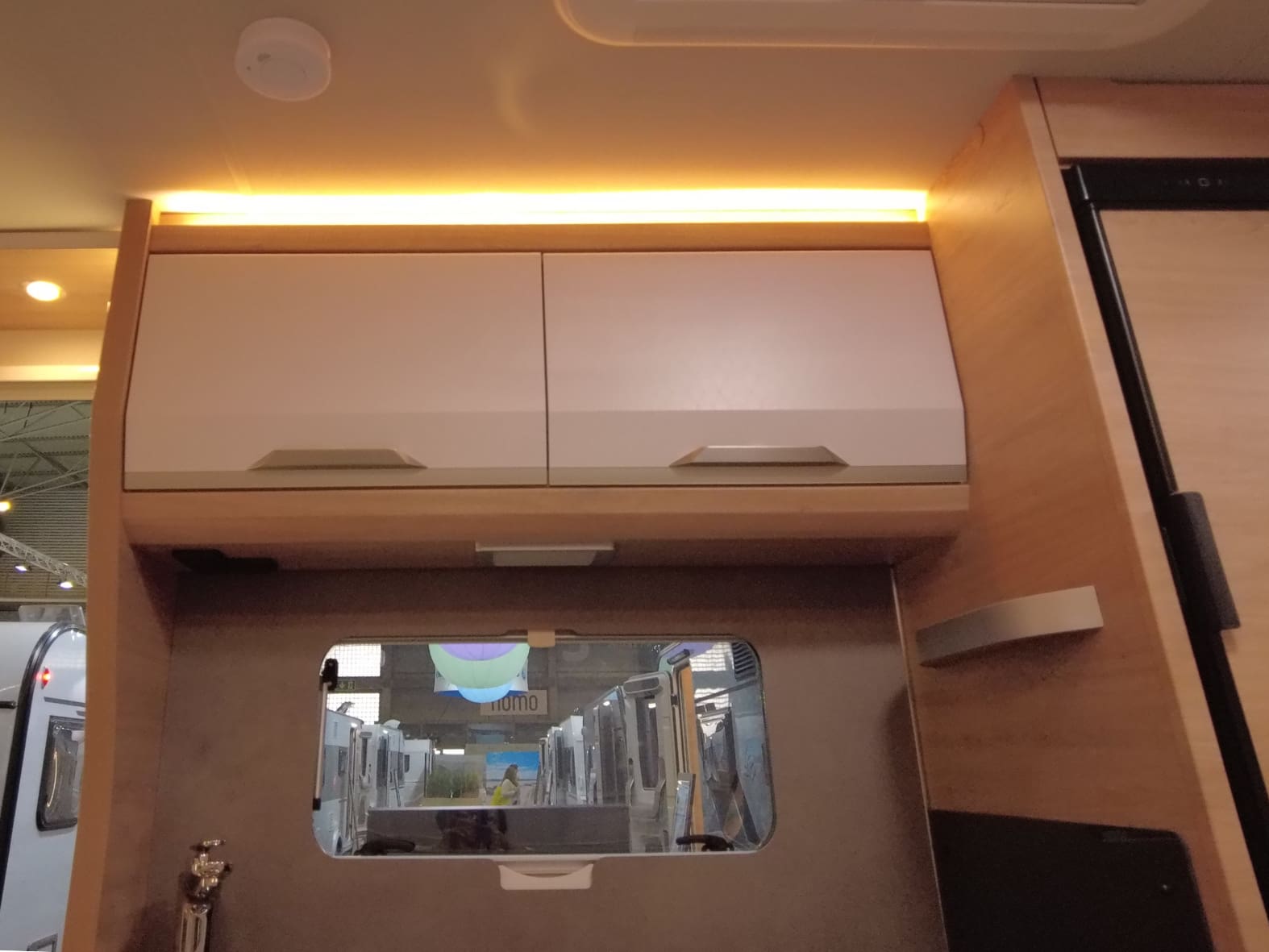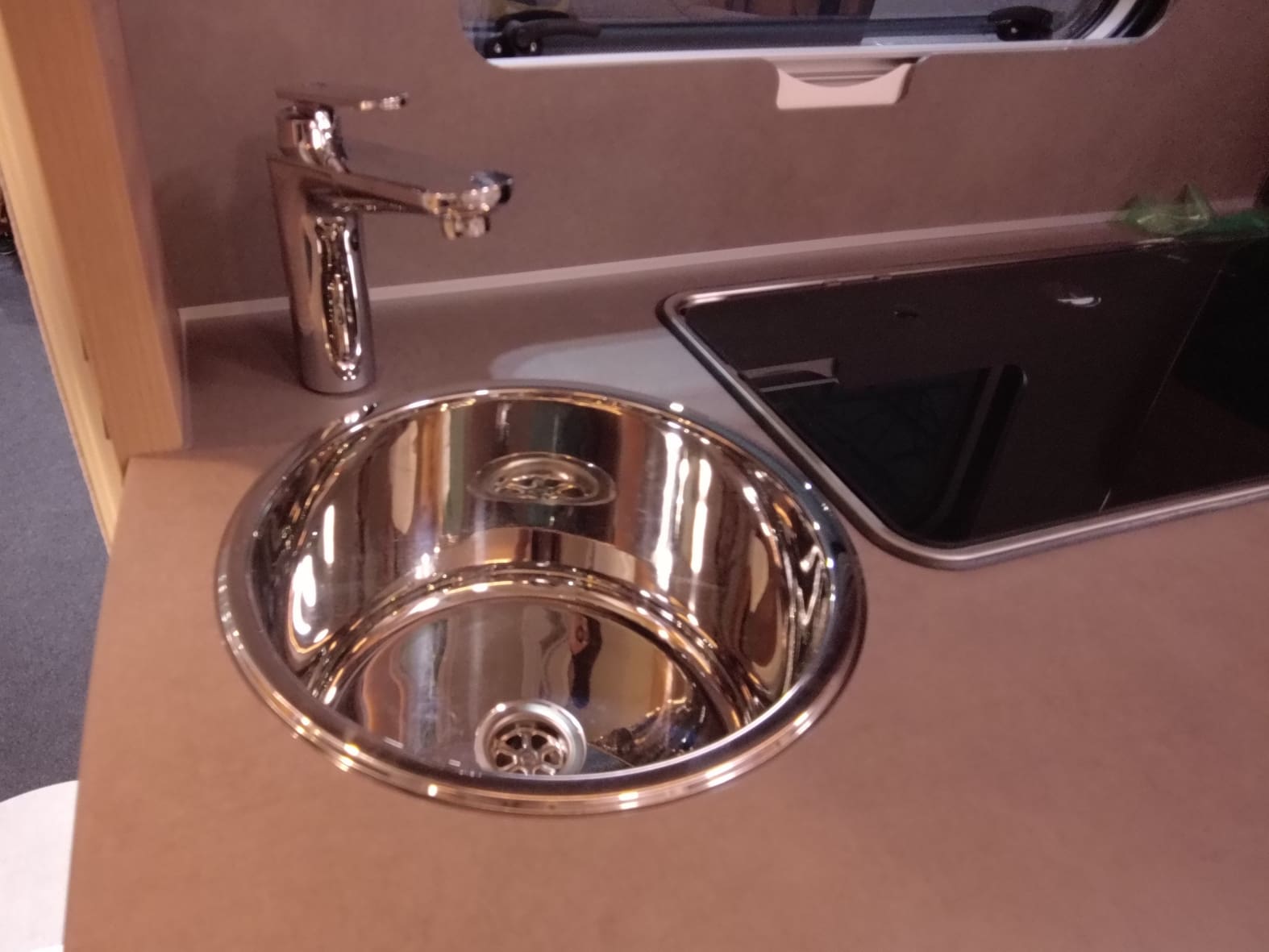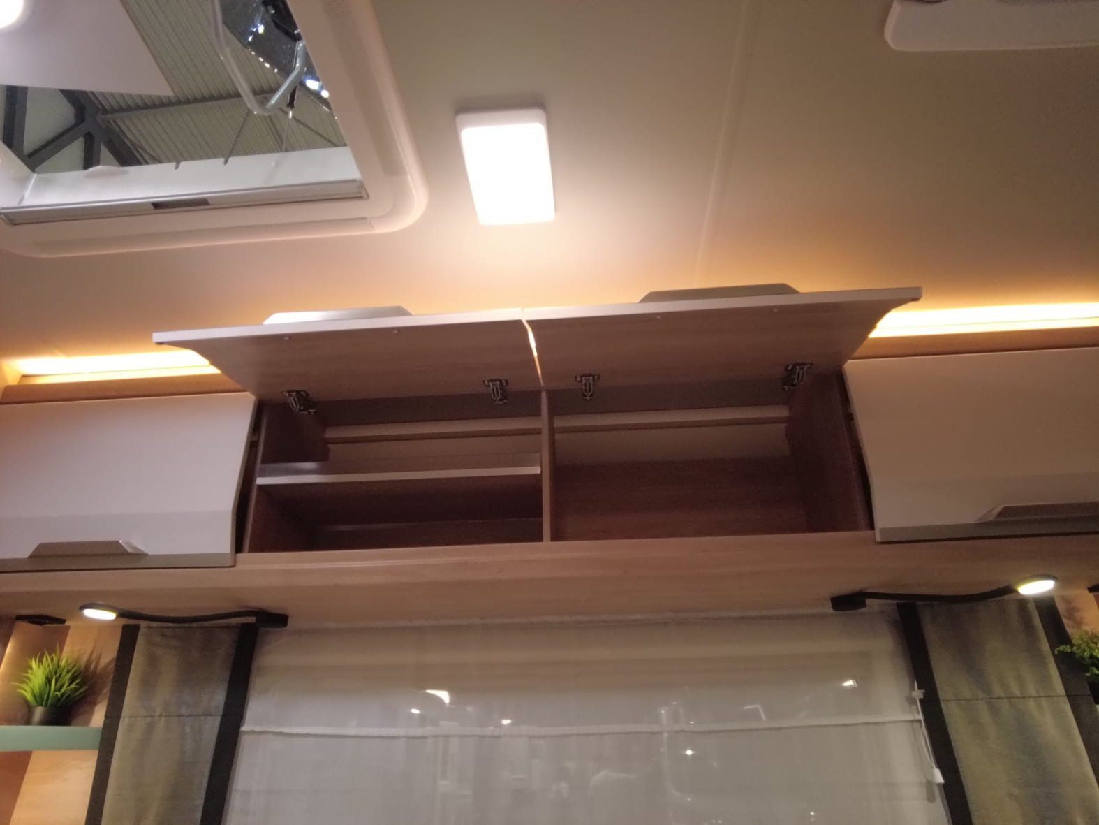 El baño compacto, con inodoro Thetford, lavabo y ducha integrada, aprovecha al máximo el espacio ofreciendo funcionalidad sin renunciar al diseño.