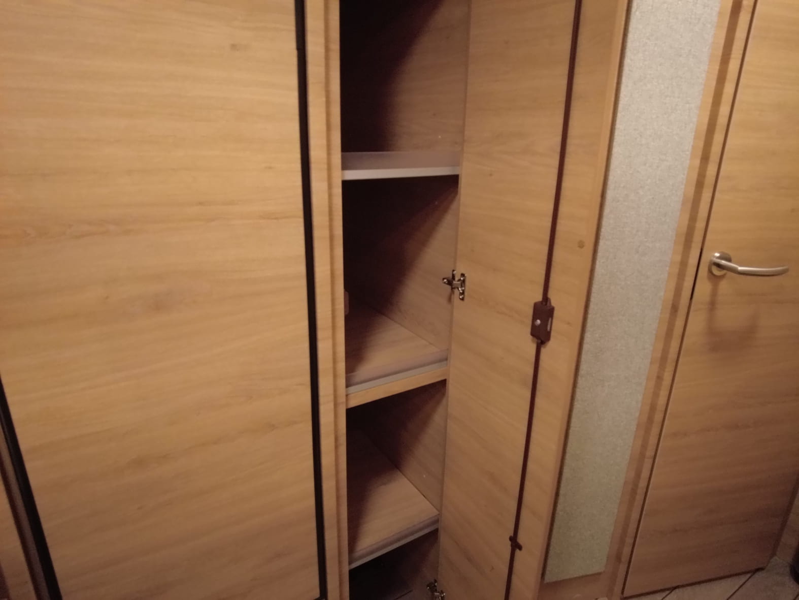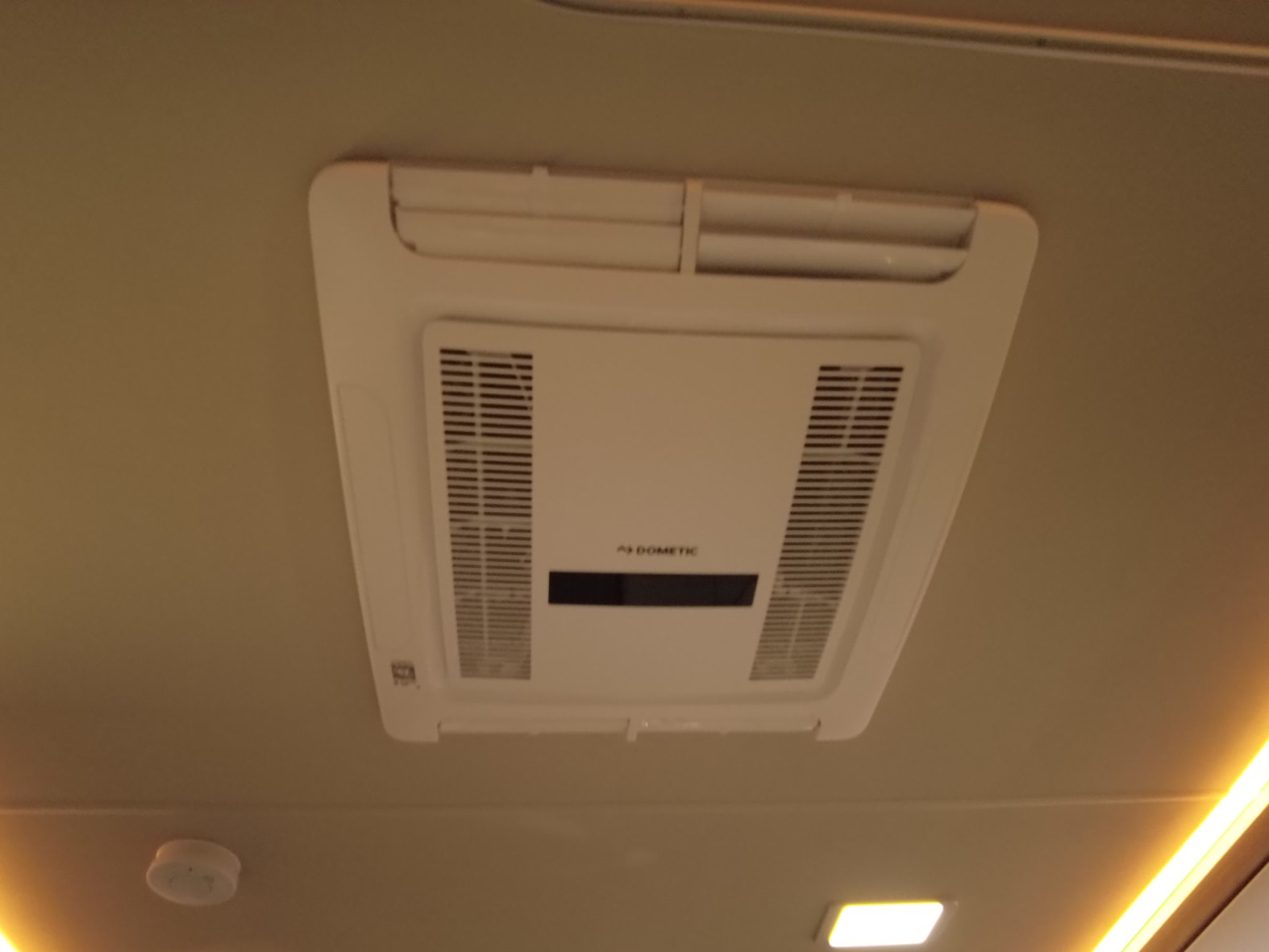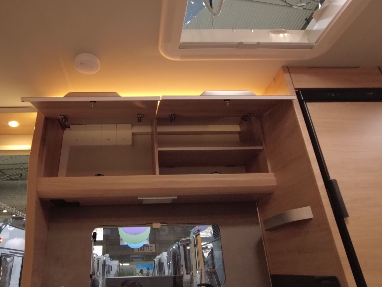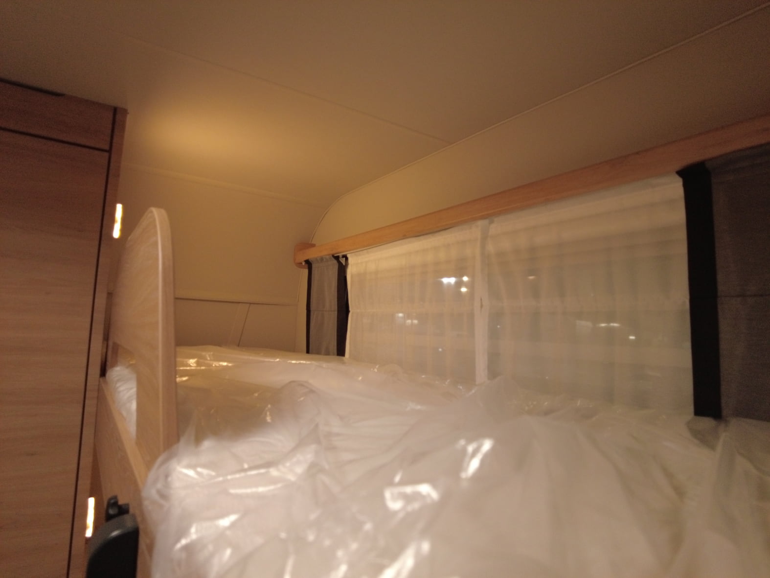 El baño compacto, con inodoro Thetford, lavabo y ducha integrada, aprovecha al máximo el espacio ofreciendo funcionalidad sin renunciar al diseño.