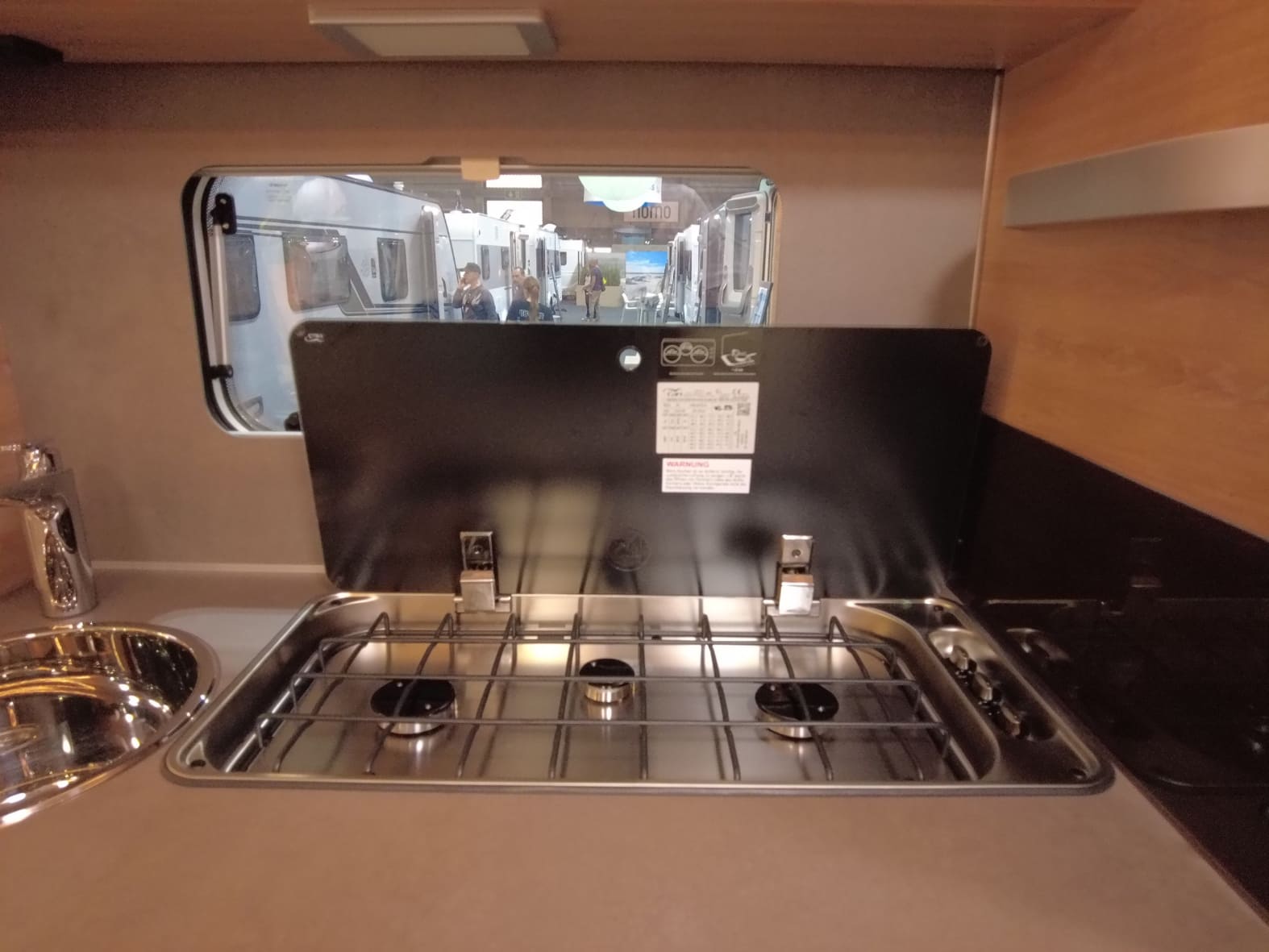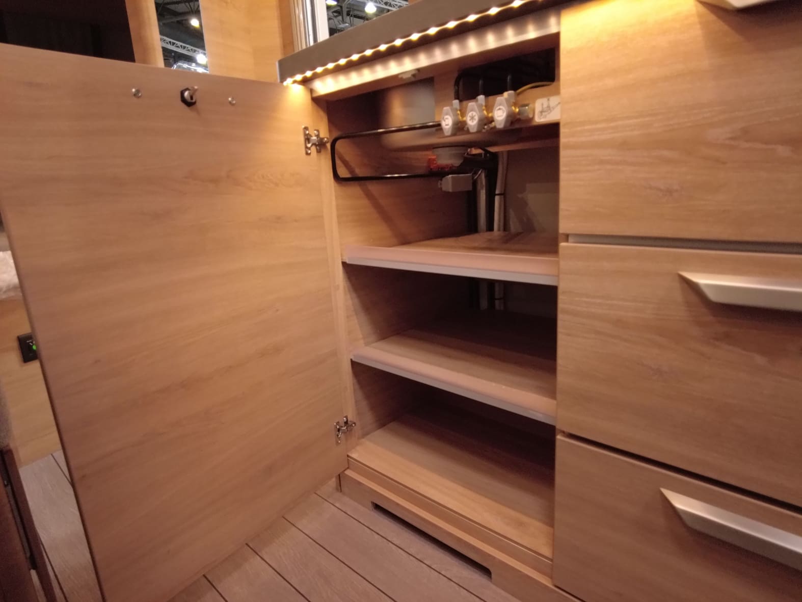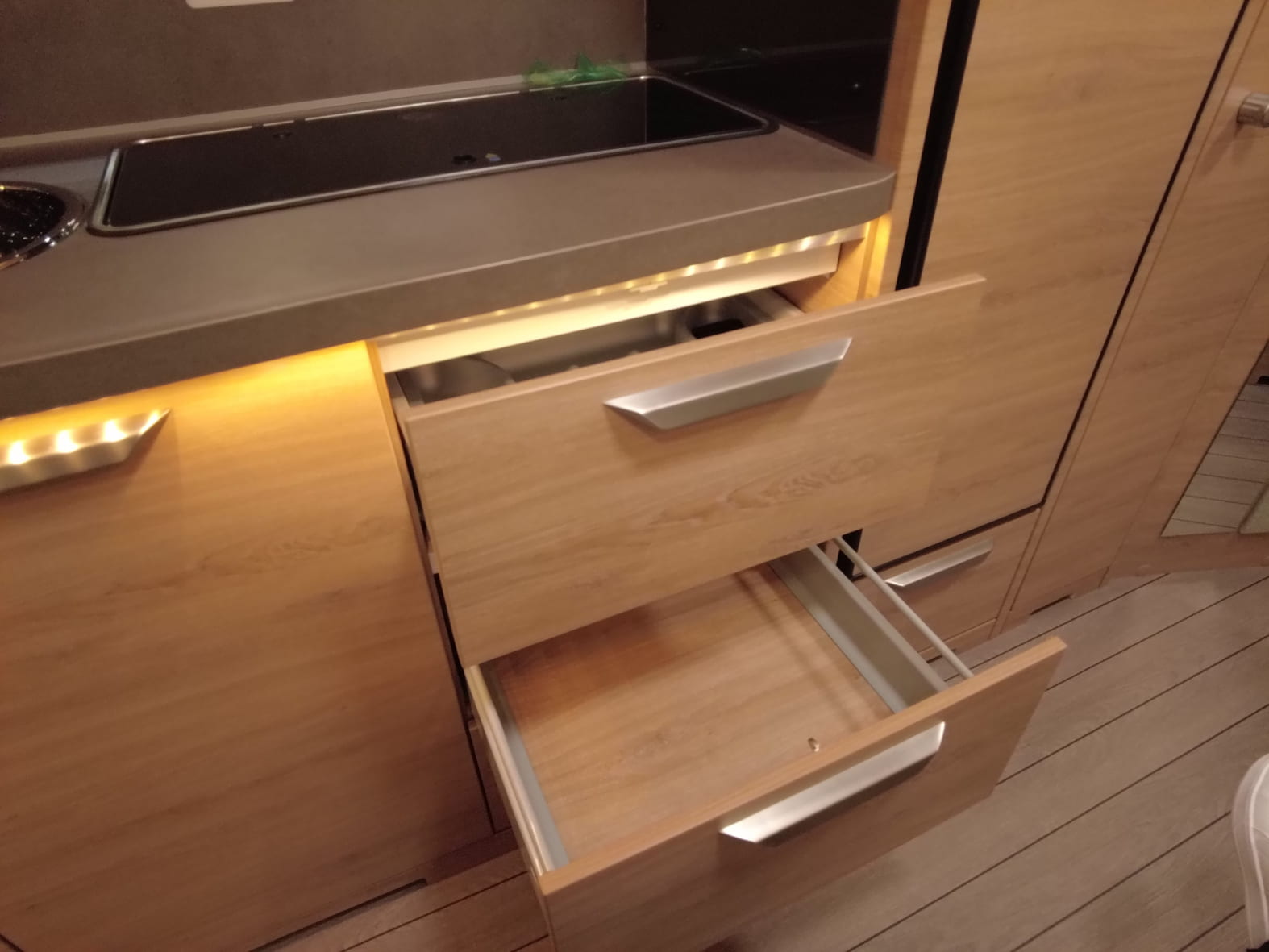La cocina central cuenta con una placa de 3 fuegos, fregadero de acero inoxidable y múltiples armarios y cajones con acabado premium, que permiten mantener todo ordenado y a mano durante los viajes.