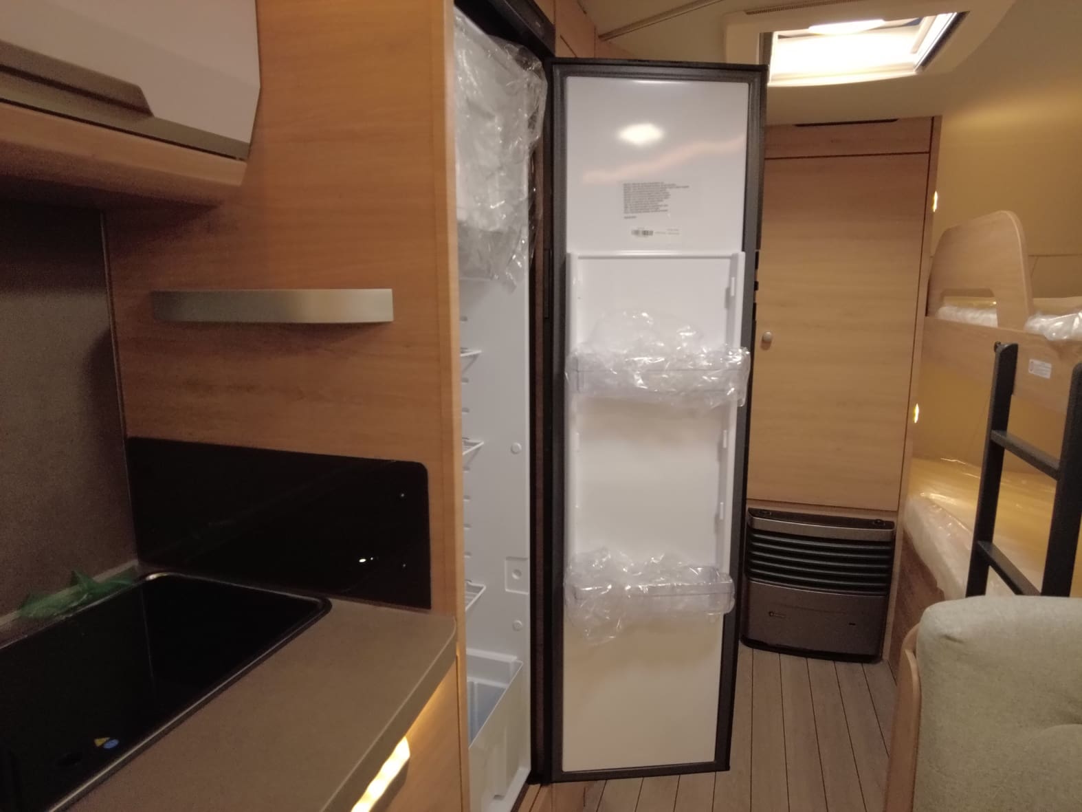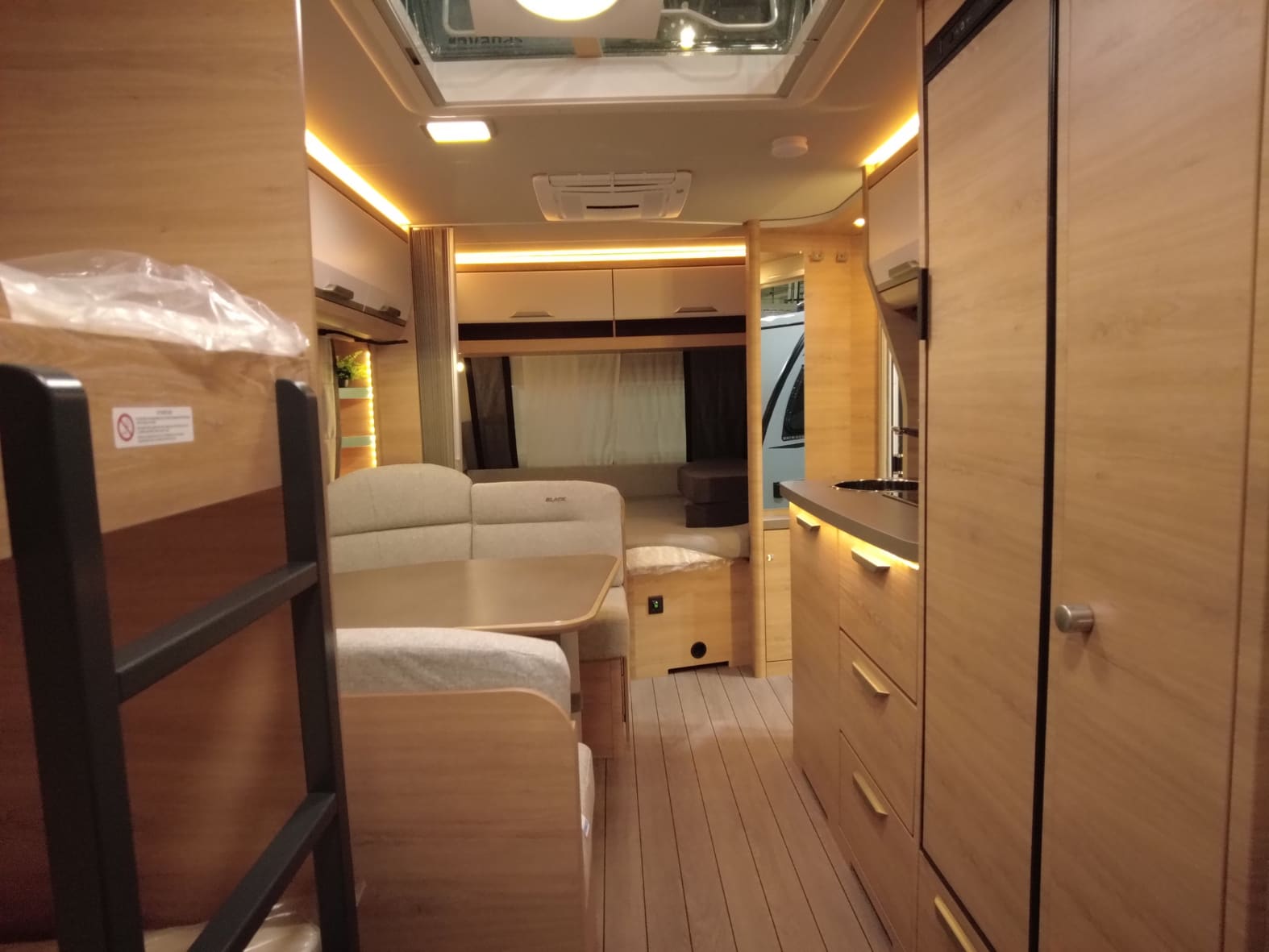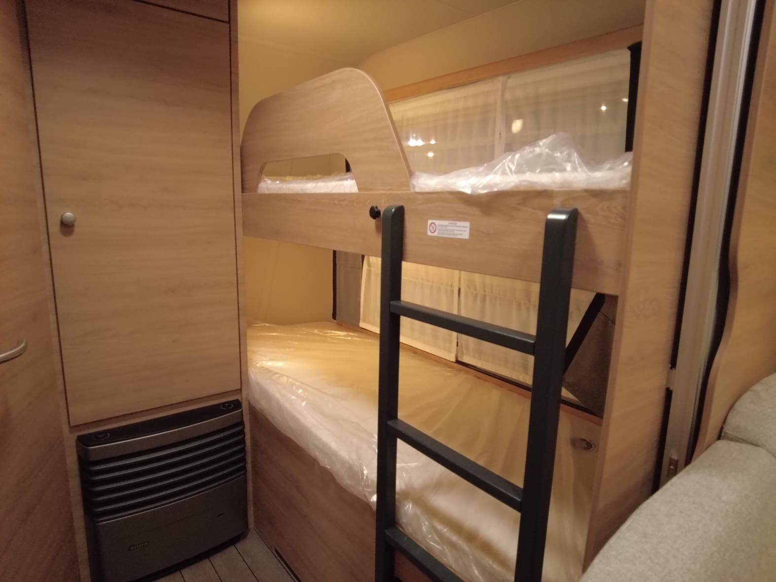 En la parte delantera encontramos una cama doble fija de gran tamaño, ideal para descansar con el máximo confort. En el centro del habitáculo se sitúa un salón comedor convertible en cama, perfecto tanto para las comidas en familia como para ganar una plaza extra de descanso cuando sea necesario. La zona trasera está diseñada especialmente para los más pequeños, con literas dobles amplias y seguras, que hacen de esta caravana una opción perfecta para familias viajeras.