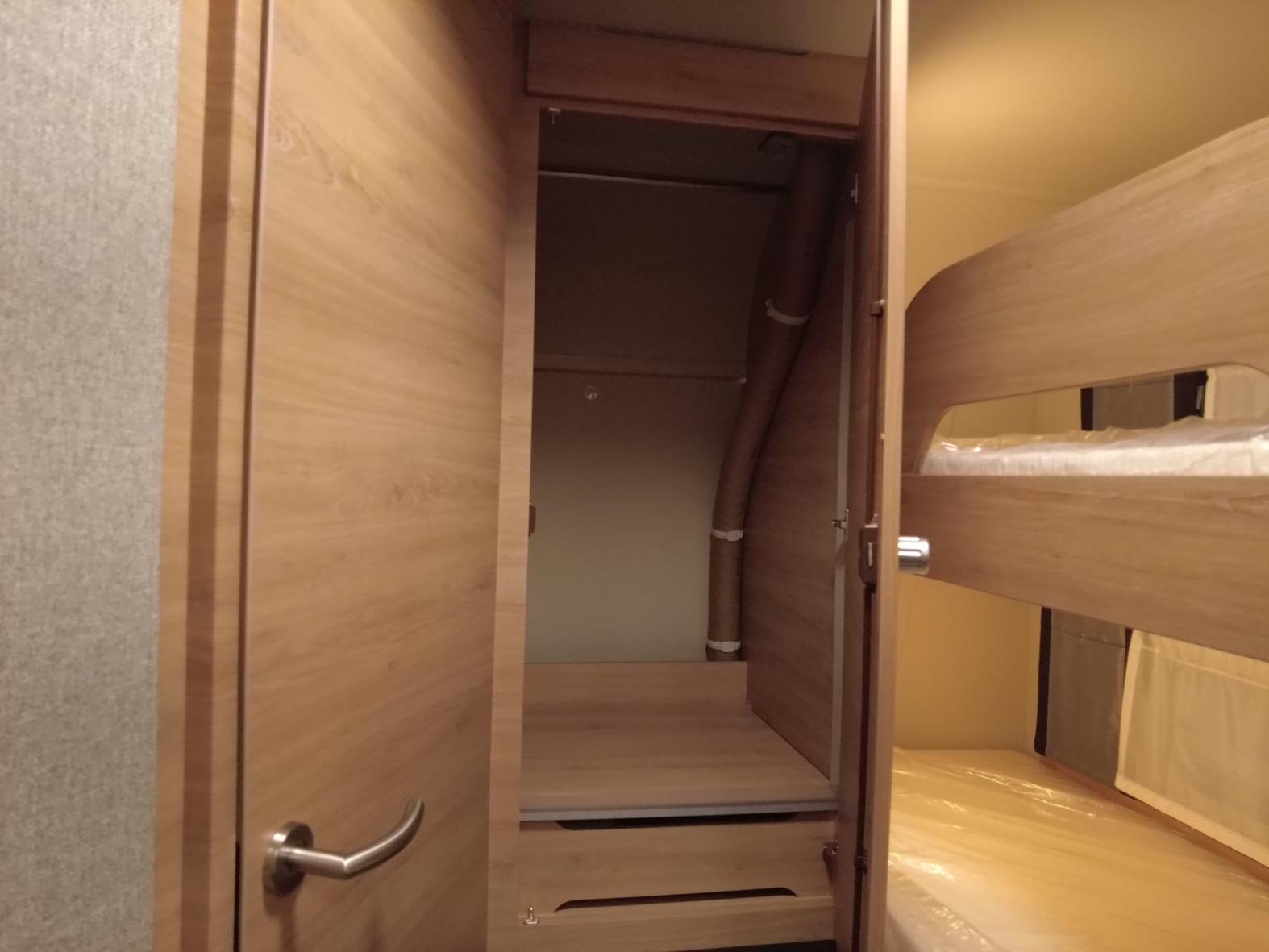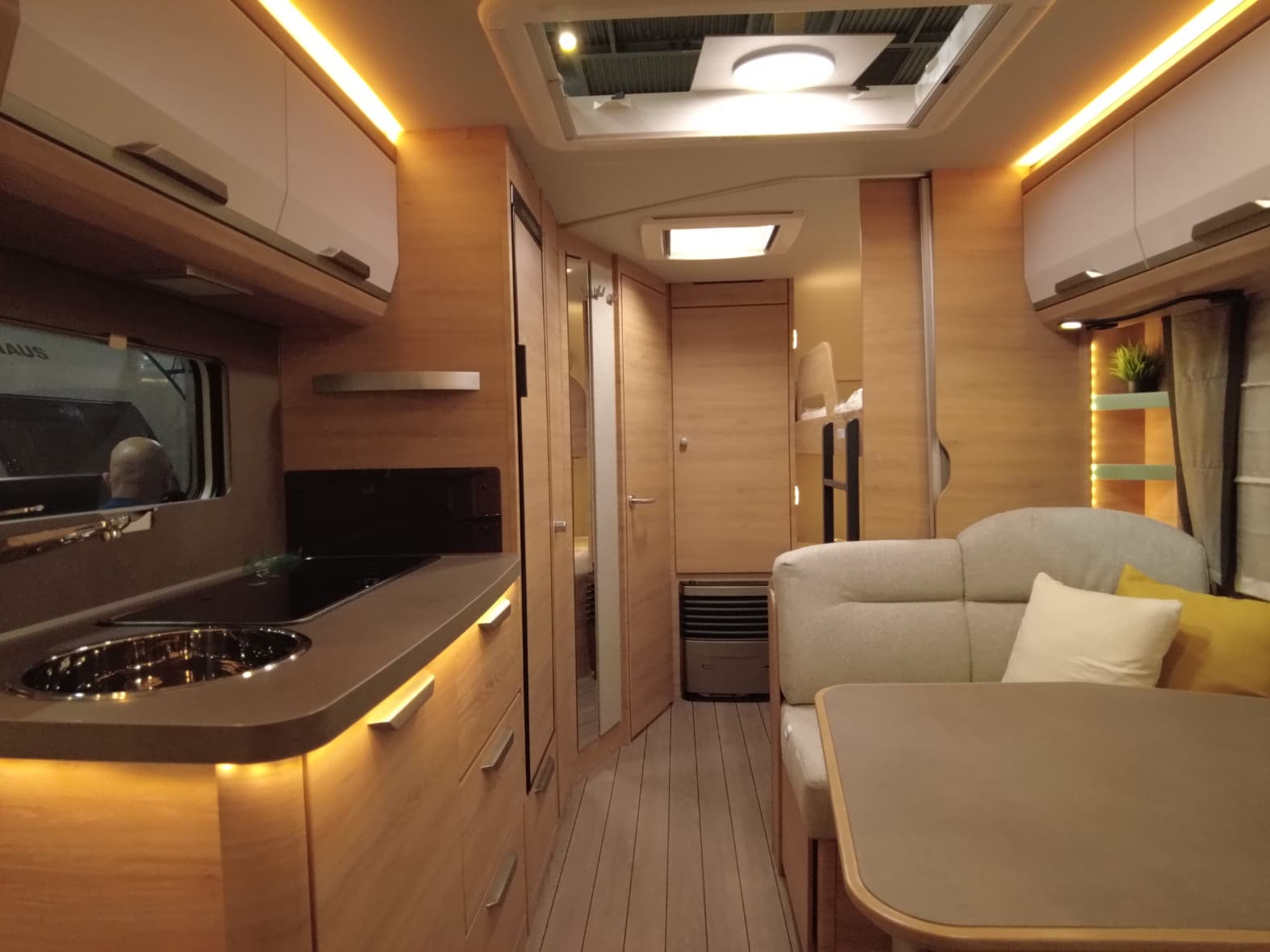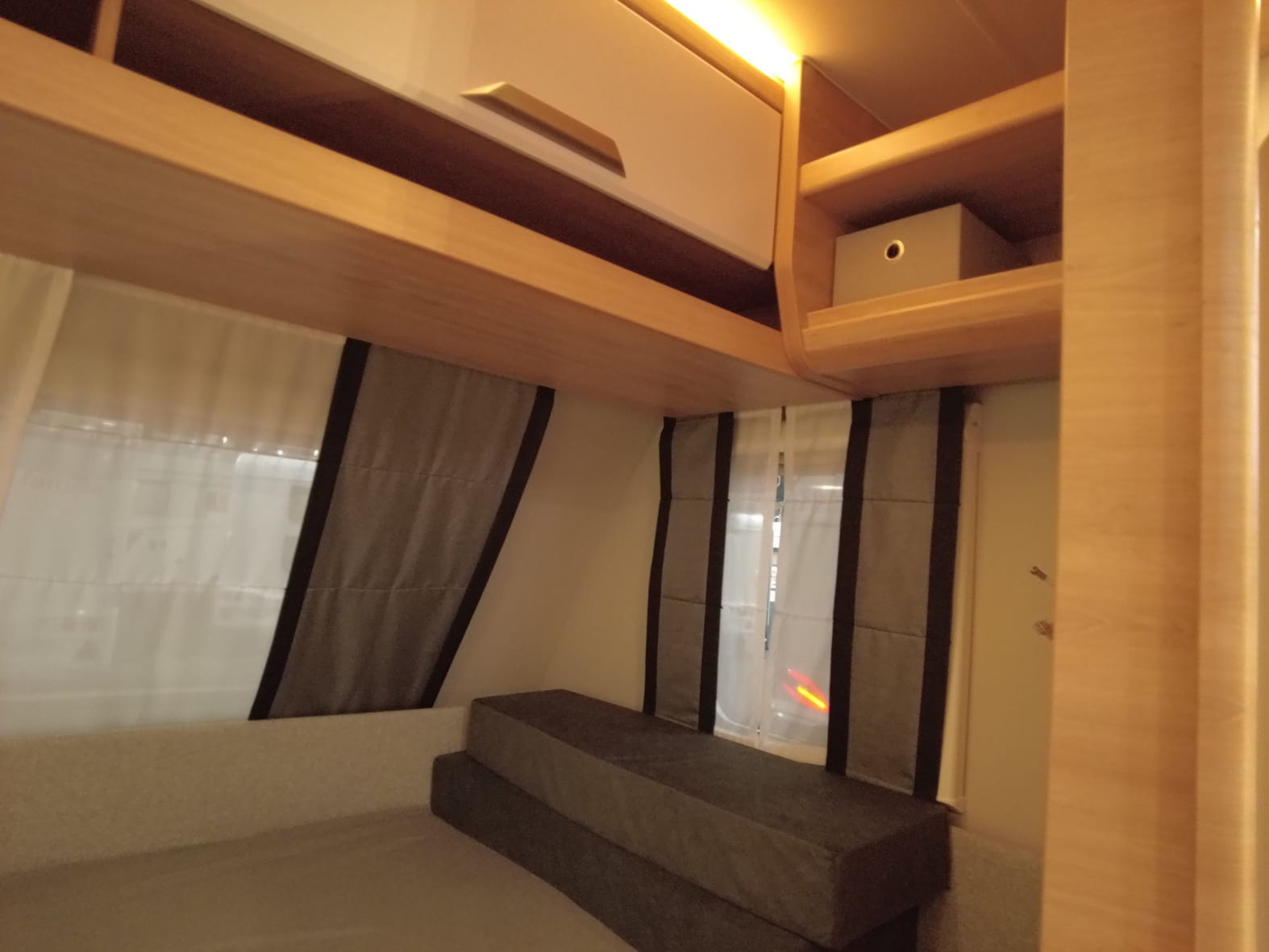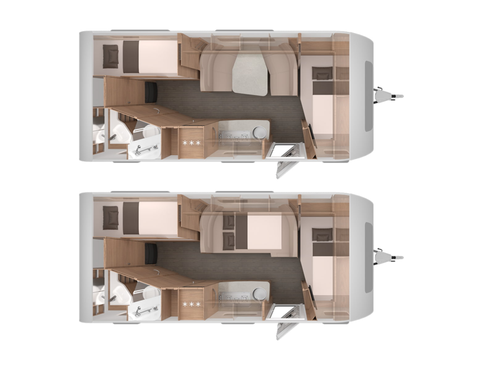 En la parte delantera encontramos una cama doble fija de gran tamaño, ideal para descansar con el máximo confort. En el centro del habitáculo se sitúa un salón comedor convertible en cama, perfecto tanto para las comidas en familia como para ganar una plaza extra de descanso cuando sea necesario. La zona trasera está diseñada especialmente para los más pequeños, con literas dobles amplias y seguras, que hacen de esta caravana una opción perfecta para familias viajeras.
